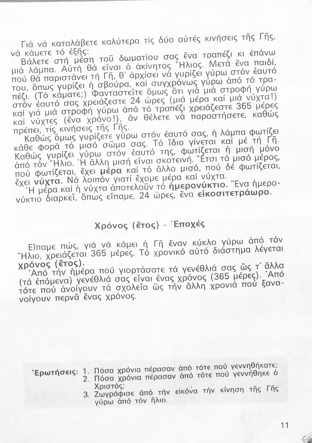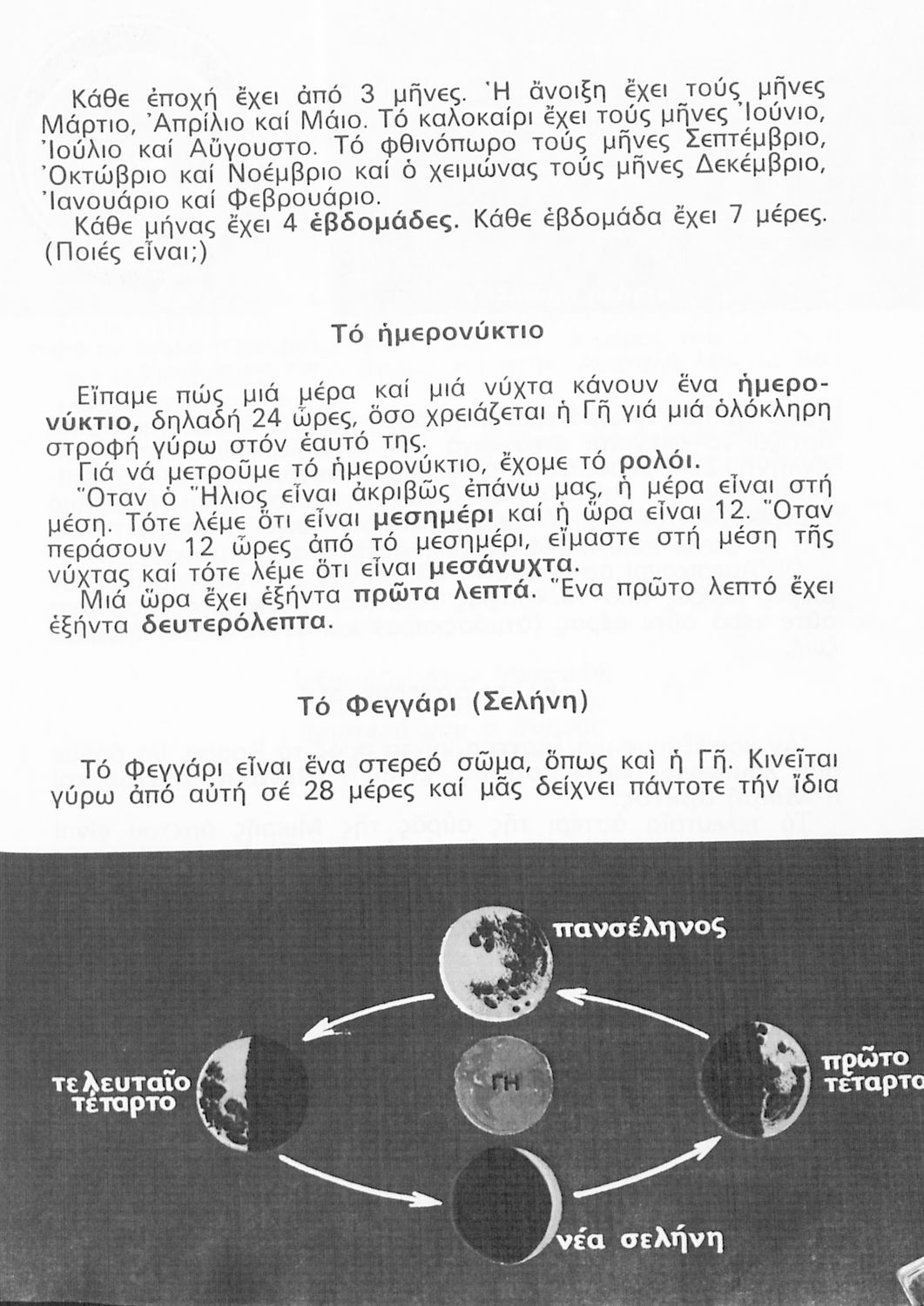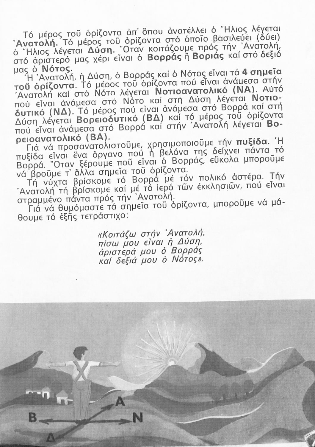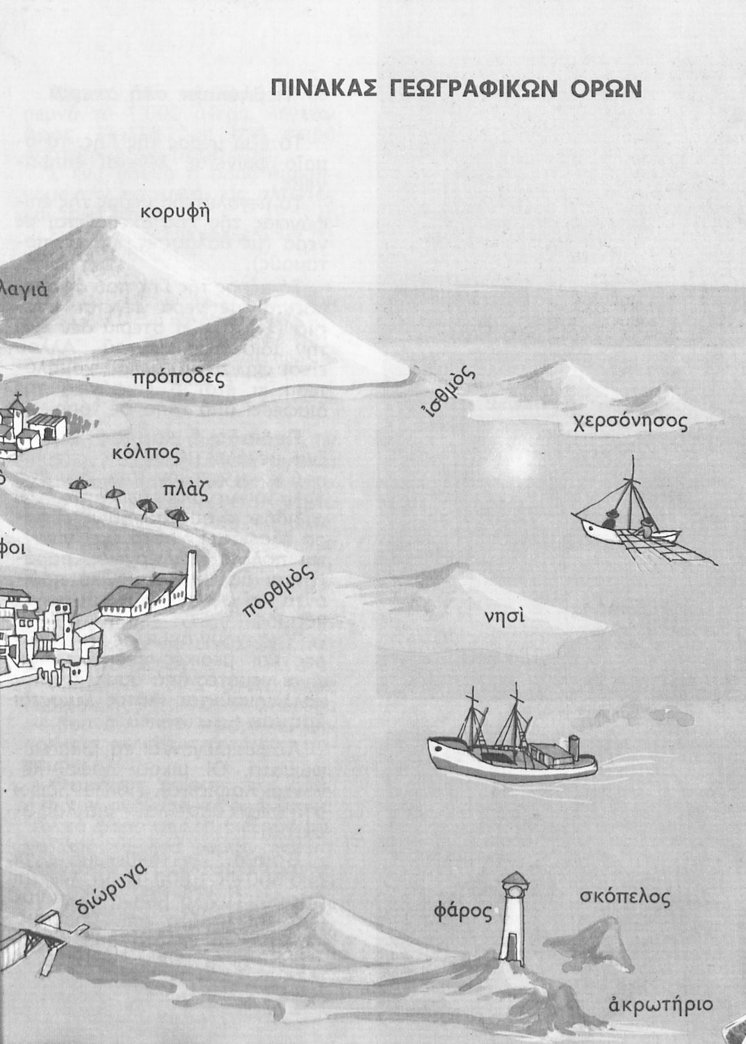 Βαθμίδα εκπαίδευσης: Πρωτοβάθμια Τάξη: Γ' Δημοτικού / Δ' Δημοτικού Μάθημα: Γεωγραφία Γλώσσα: Δημοτική Παρουσίαση περιεχομένου: Σχολικό εγχειρίδιο Γεωγραφίας Γ ΄ και Δ' Δημοτικού. Το πρώτο μέρος του βιβλίου απευθύνεται σε μαθητές της Γ' Δημοτικού και αποτελεί μια εισαγωγή στην πατριδογνωσία με έμφαση στις παραδόσεις της ελληνικής επαρχίας. Το δεύτερο μέρος αφορά την Δ' Δημοτικού και εξετάζει την οικονομική, πολιτική και γεωφυσική γεωγραφία της Ελλάδας. |