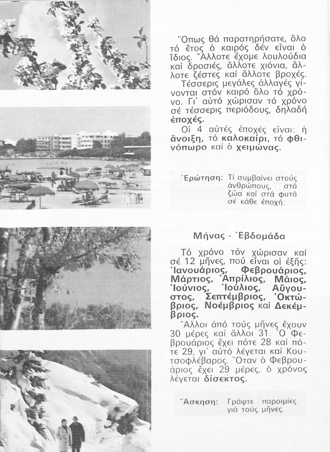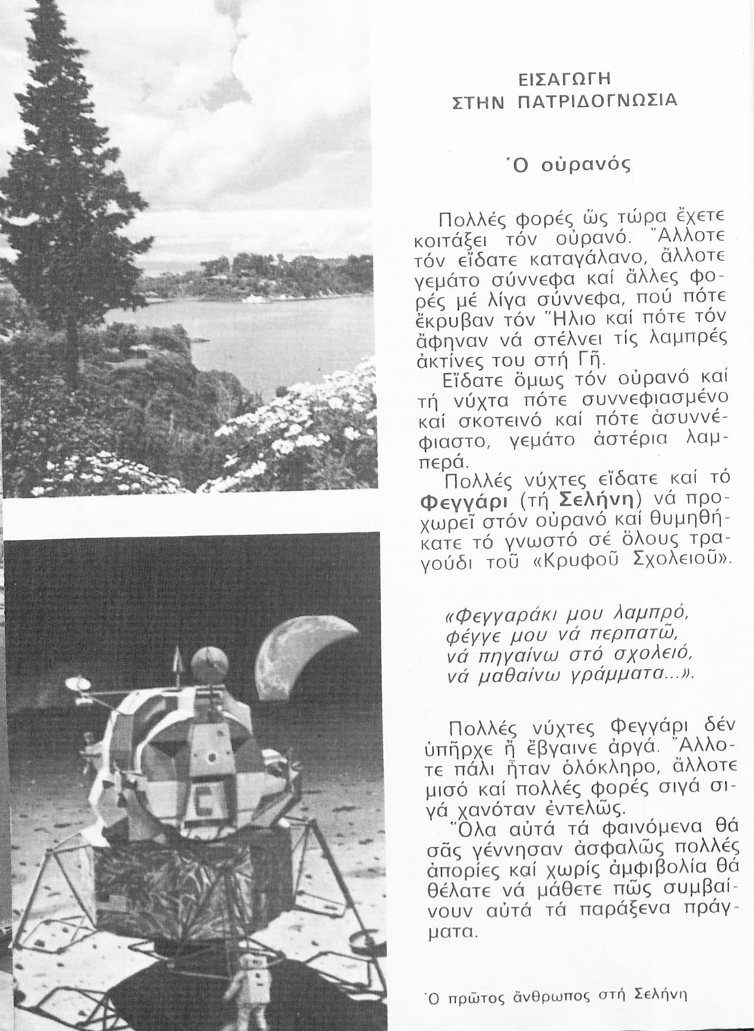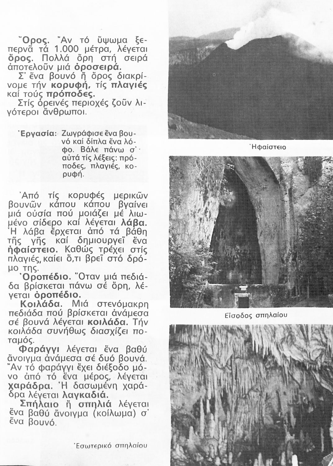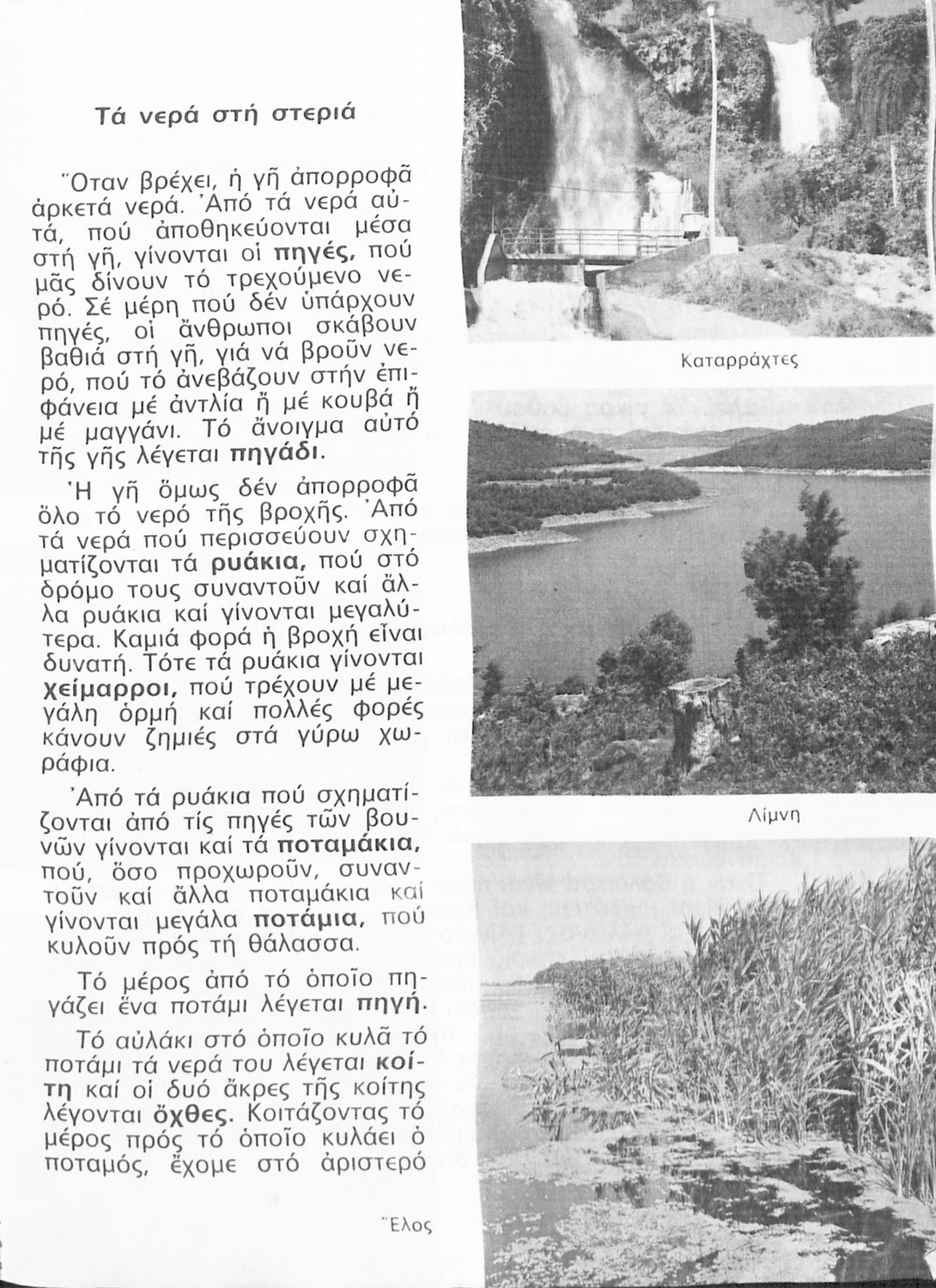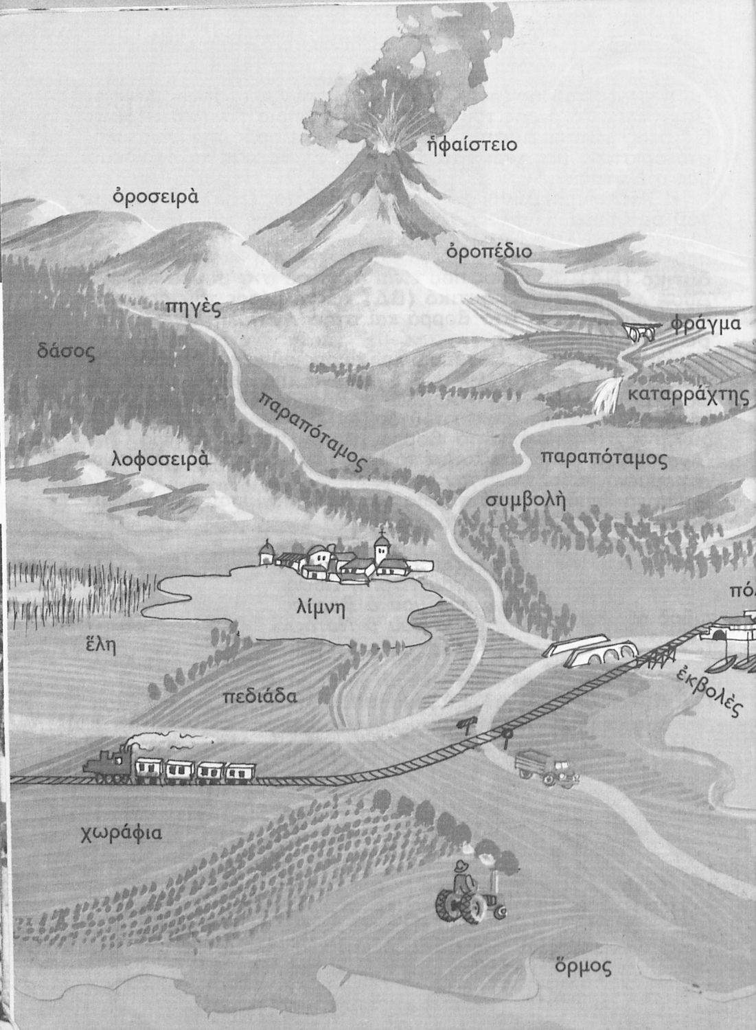 Σχολικό εγχειρίδιο Γεωγραφίας Γ ΄ και Δ' Δημοτικού. Το πρώτο μέρος του βιβλίου απευθύνεται σε μαθητές της Γ' Δημοτικού και αποτελεί μια εισαγωγή στην πατριδογνωσία με έμφαση στις παραδόσεις της ελληνικής επαρχίας. Το δεύτερο μέρος αφορά την Δ' Δημοτικού και εξετάζει την οικονομική, πολιτική και γεωφυσική γεωγραφία της Ελλάδας.