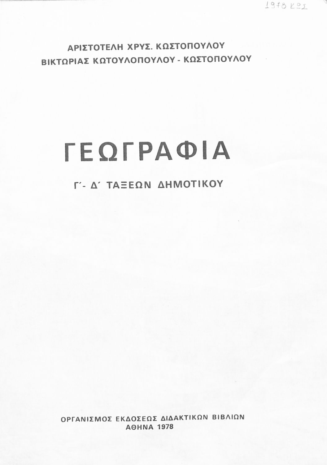 Κωδικός αναγνώρισης: 02-00398 Τίτλος: Γεωγραφία Γ΄ - Δ΄ τάξεων Δημοτικού Συγγραφέας: Αριστοτέλης Χρ. Κωστόπουλος, Βικτωρία Κωτουλοπούλου – Κωστοπούλου Μέγεθος και υπόστρωμα: Σχολικό εγχειρίδιο, μαλακό εξώφυλλο, 228 σελίδες. Σκίτσα (ασπρόμαυρα), εικόνες (ασπρόμαυρες). |