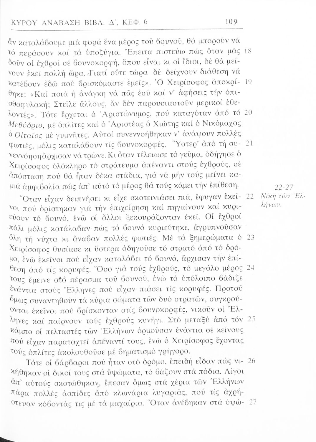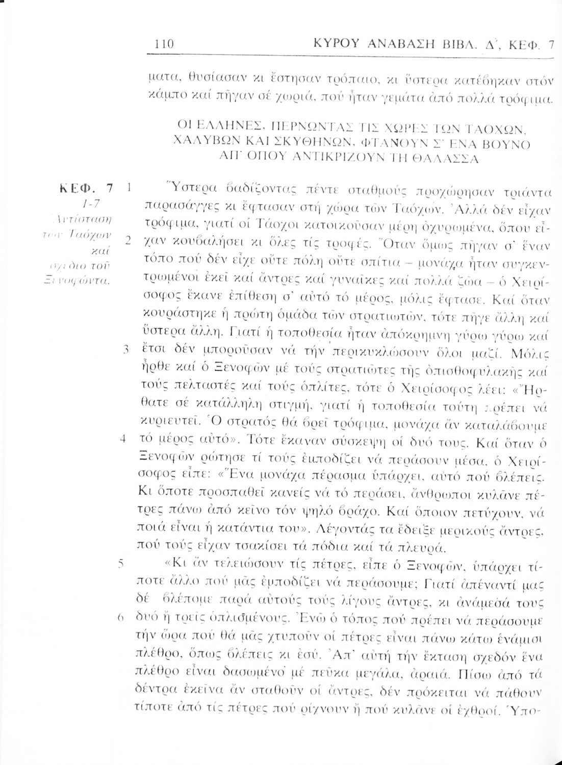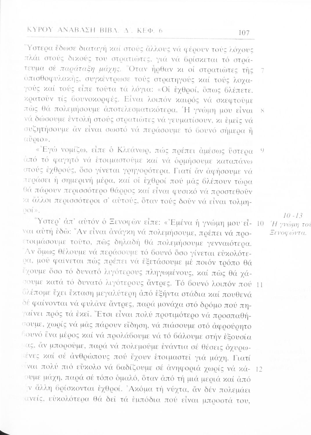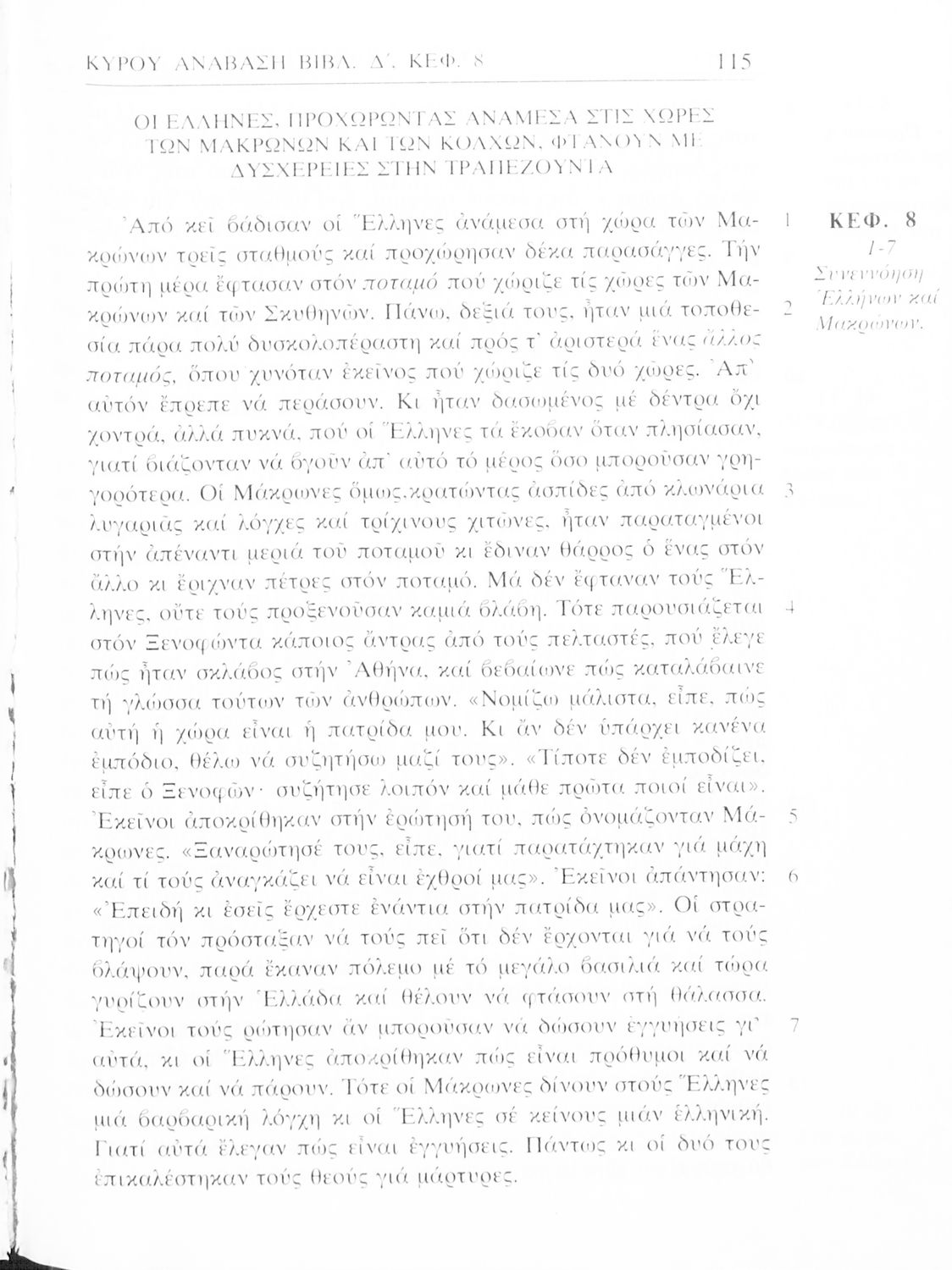Σχολικό εγχειρίδιο Αρχαίων Ελληνικών α΄ Γυμνασίου που περιλαμβάνει μετάφραση του έργου του Ξενοφώντα Κύρου Ανάβασις, εισαγωγικά σχόλια για τη ζωή και το έργο του, και ερμηνευτικές παρατηρήσεις.