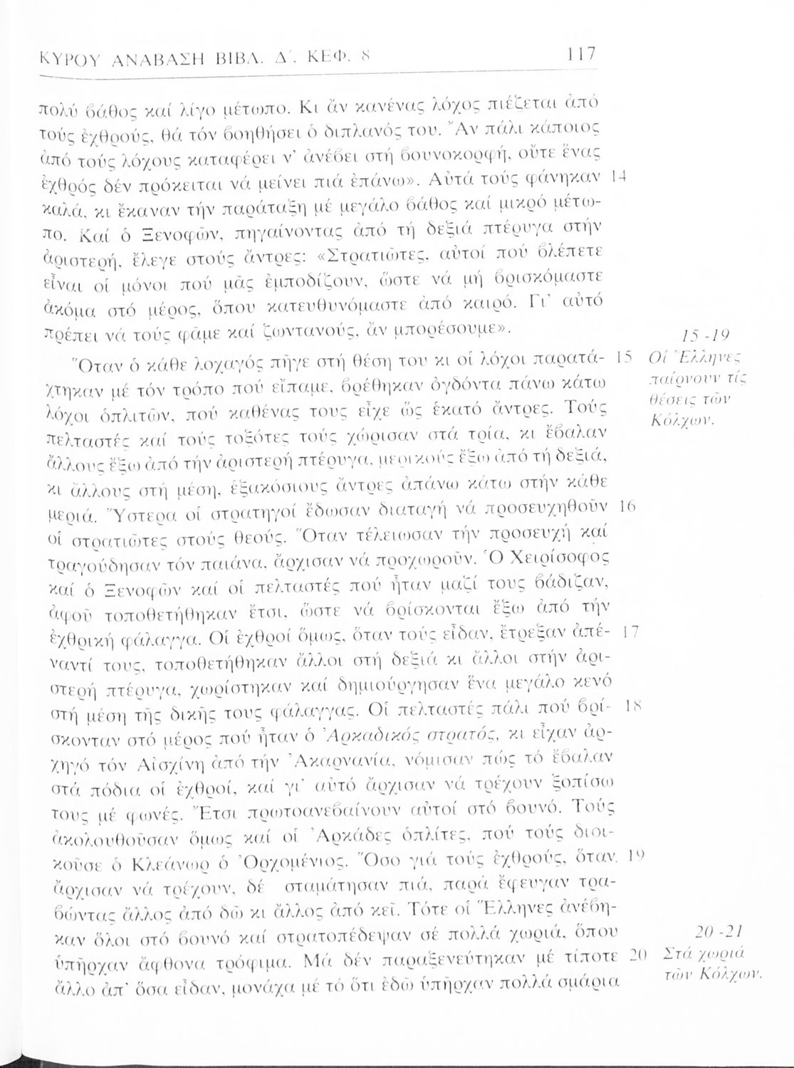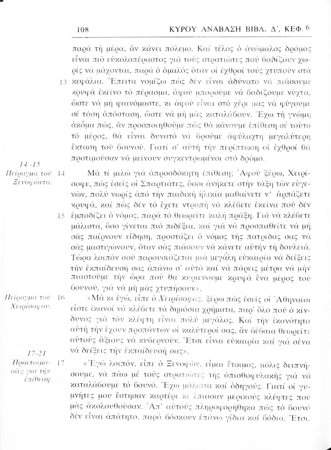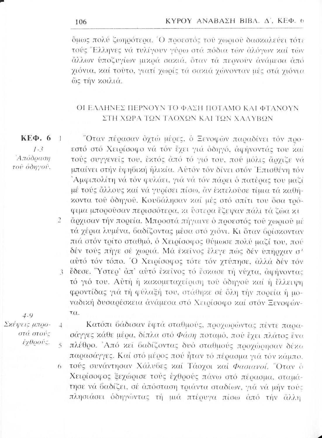Σχολικό εγχειρίδιο Αρχαίων Ελληνικών α΄ Γυμνασίου που περιλαμβάνει μετάφραση του έργου του Ξενοφώντα Κύρου Ανάβασις, εισαγωγικά σχόλια για τη ζωή και το έργο του, και ερμηνευτικές παρατηρήσεις.