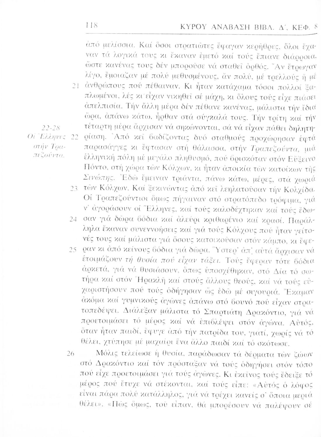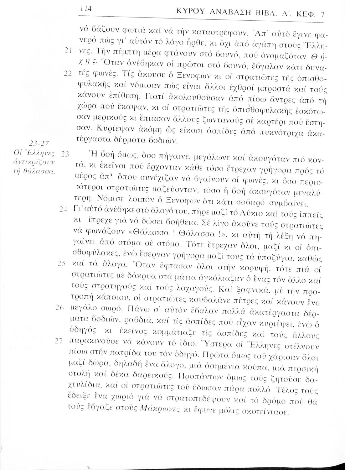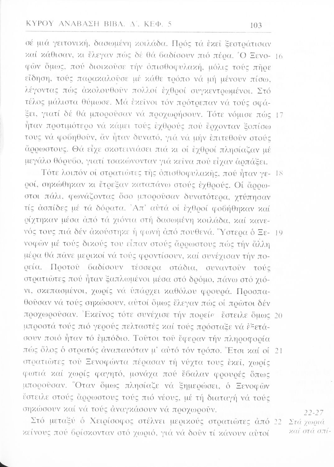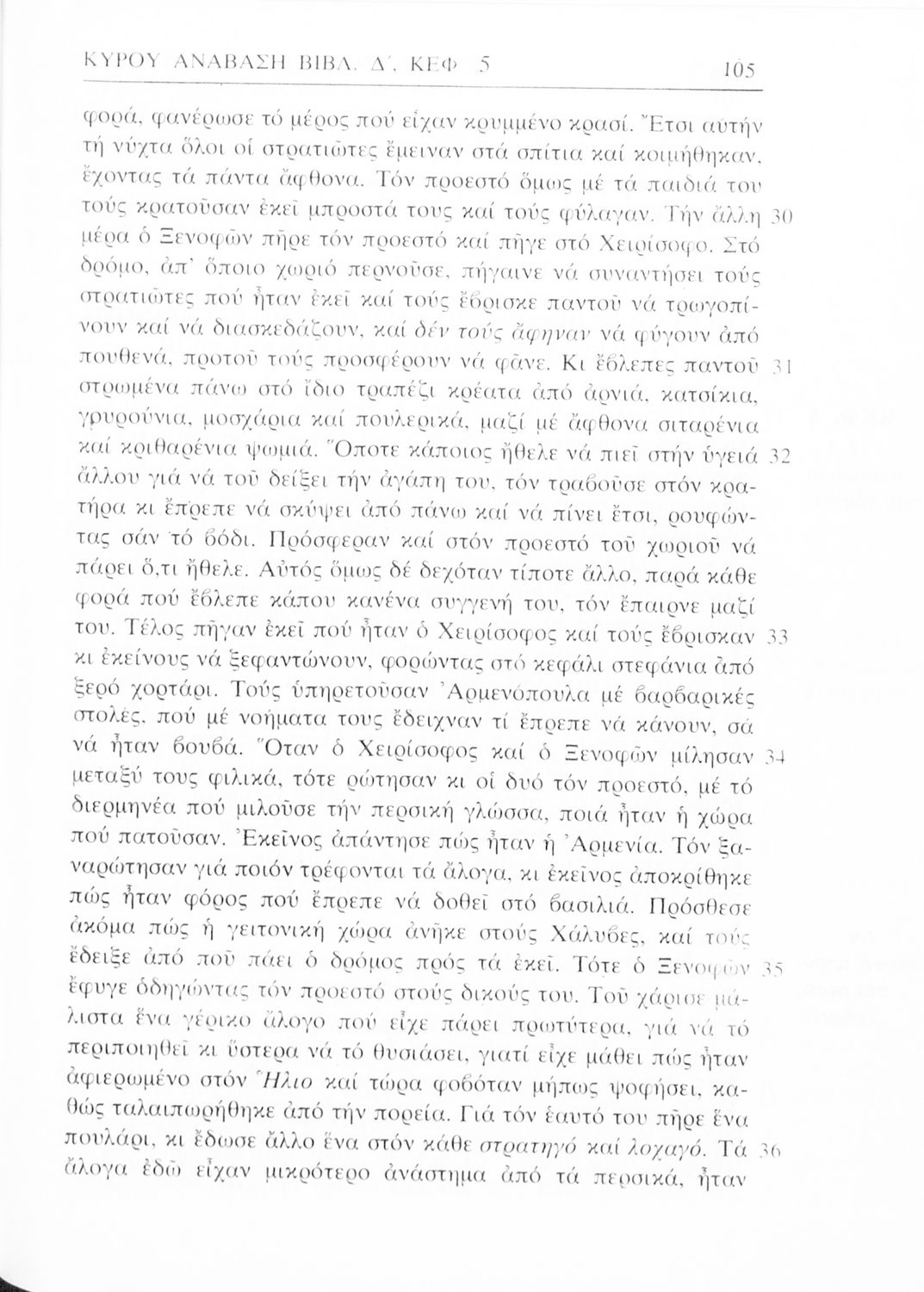 Σχολικό εγχειρίδιο Αρχαίων Ελληνικών α΄ Γυμνασίου που περιλαμβάνει μετάφραση του έργου του Ξενοφώντα Κύρου Ανάβασις, εισαγωγικά σχόλια για τη ζωή και το έργο του, και ερμηνευτικές παρατηρήσεις.