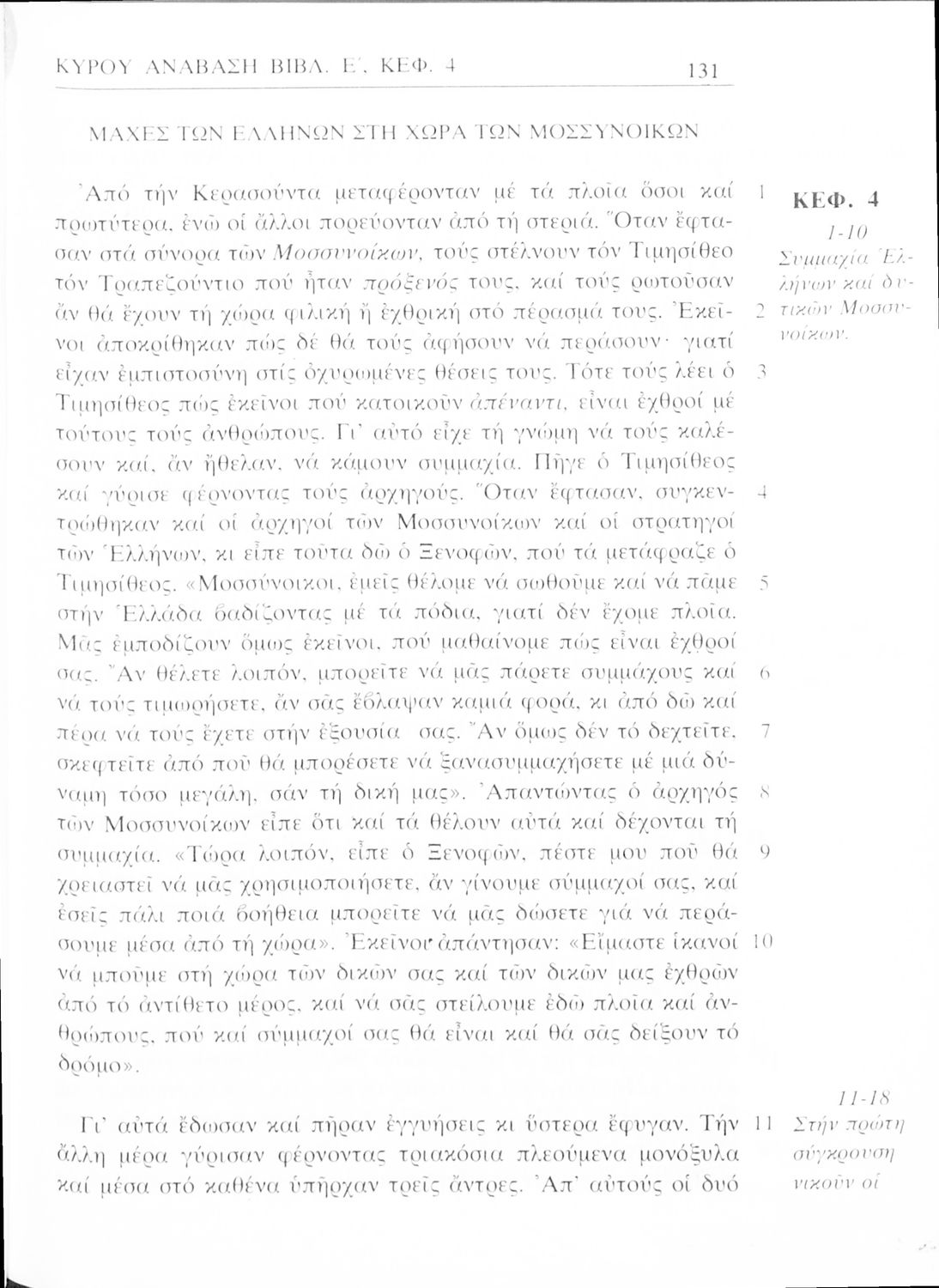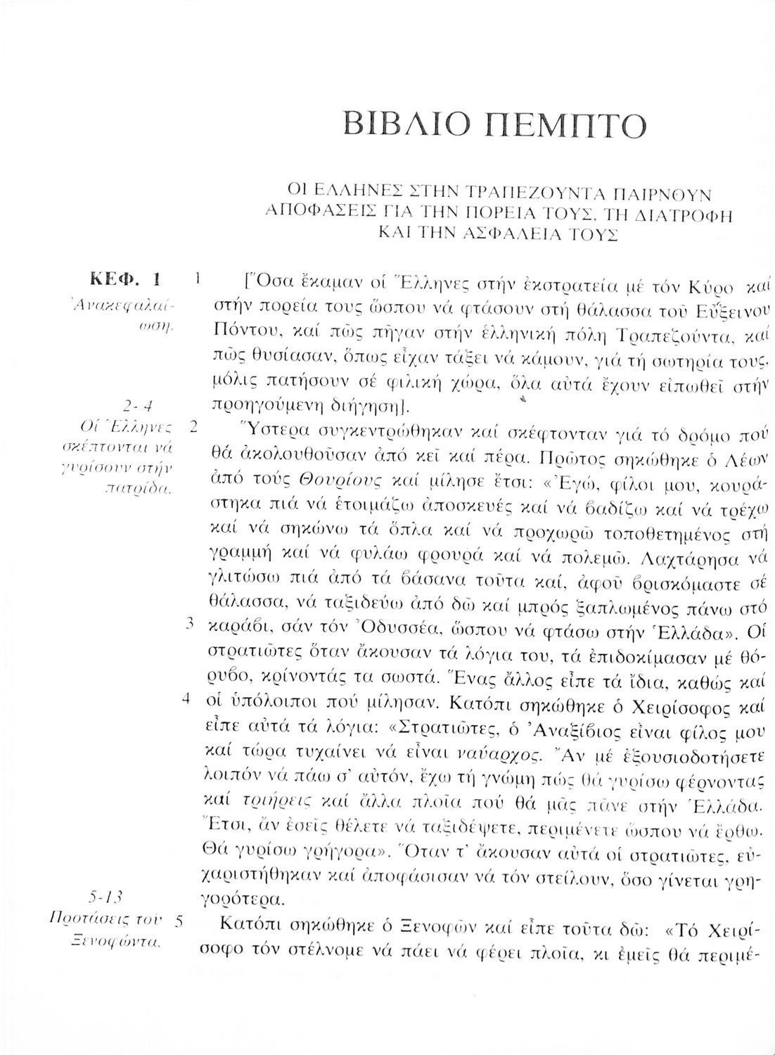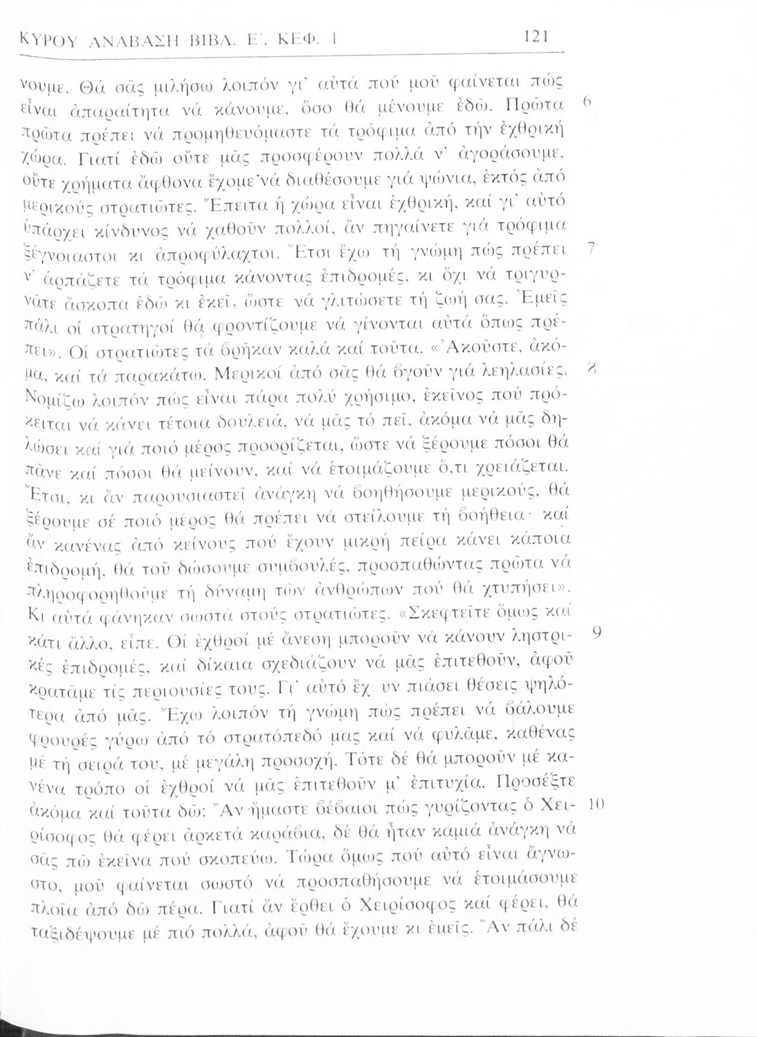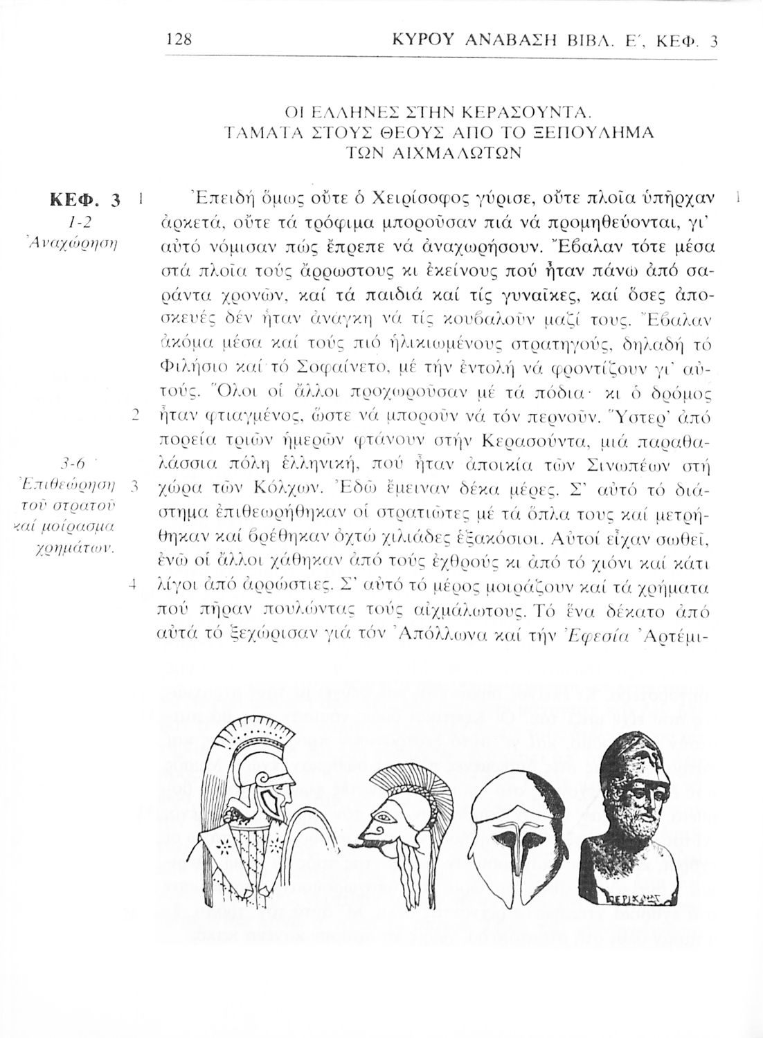 Σχολικό εγχειρίδιο Αρχαίων Ελληνικών α΄ Γυμνασίου που περιλαμβάνει μετάφραση του έργου του Ξενοφώντα Κύρου Ανάβασις, εισαγωγικά σχόλια για τη ζωή και το έργο του, και ερμηνευτικές παρατηρήσεις.