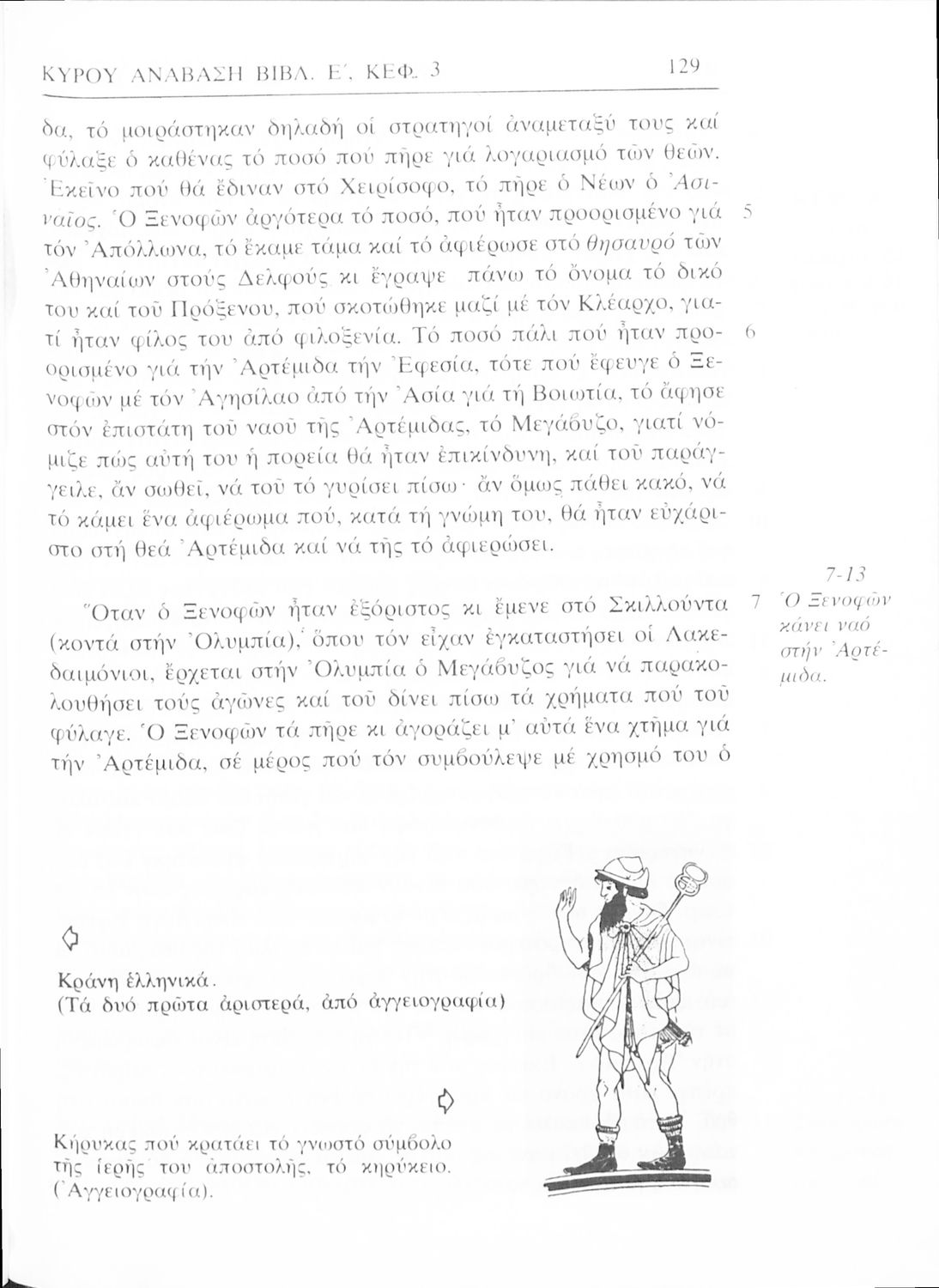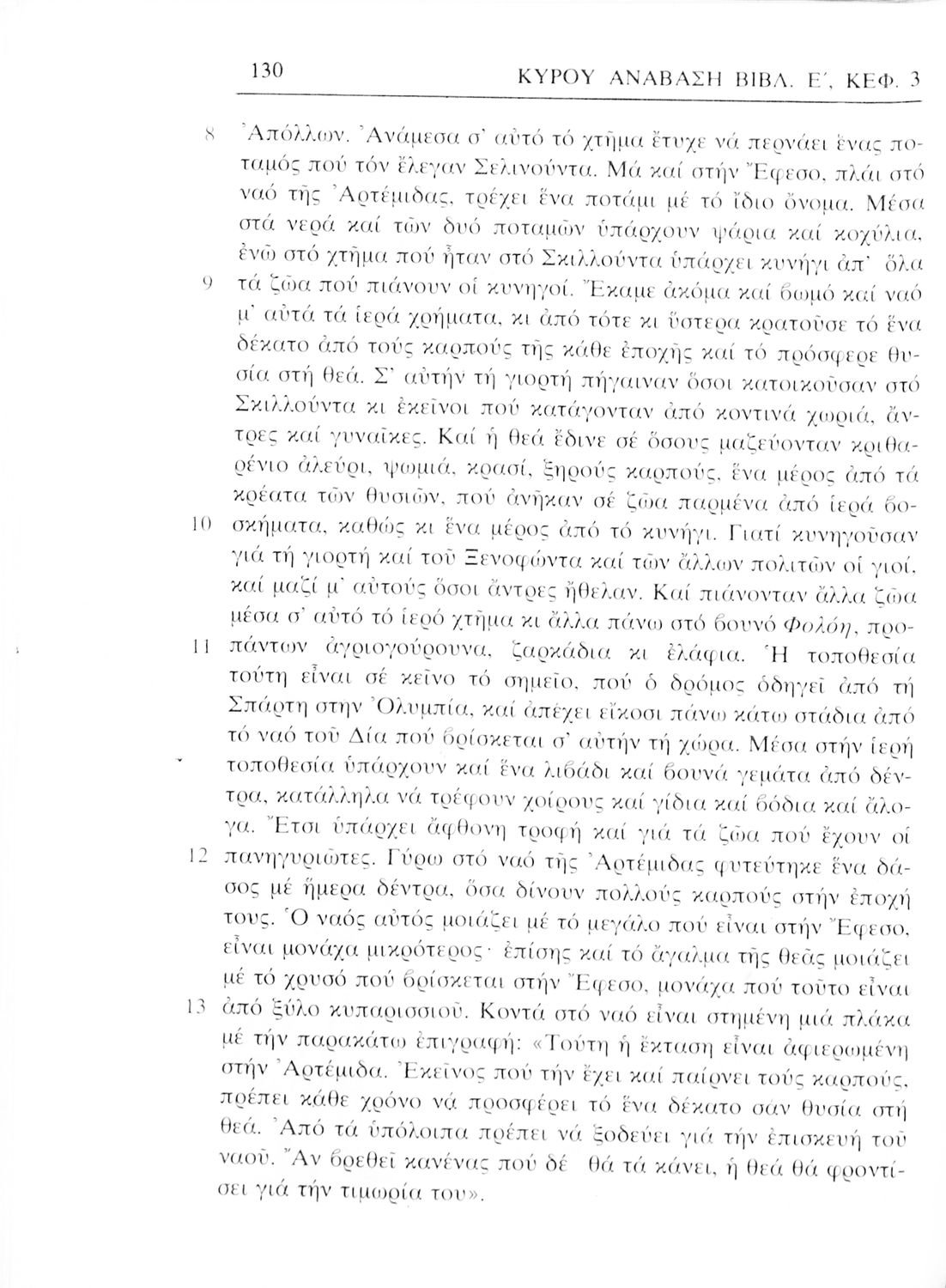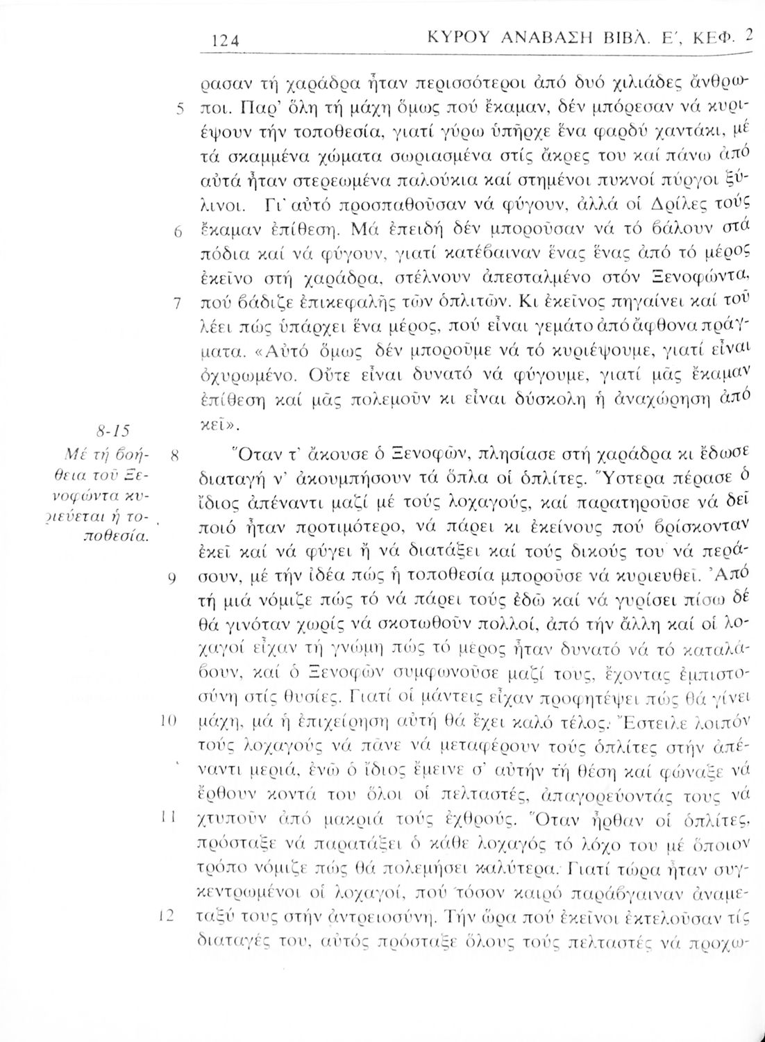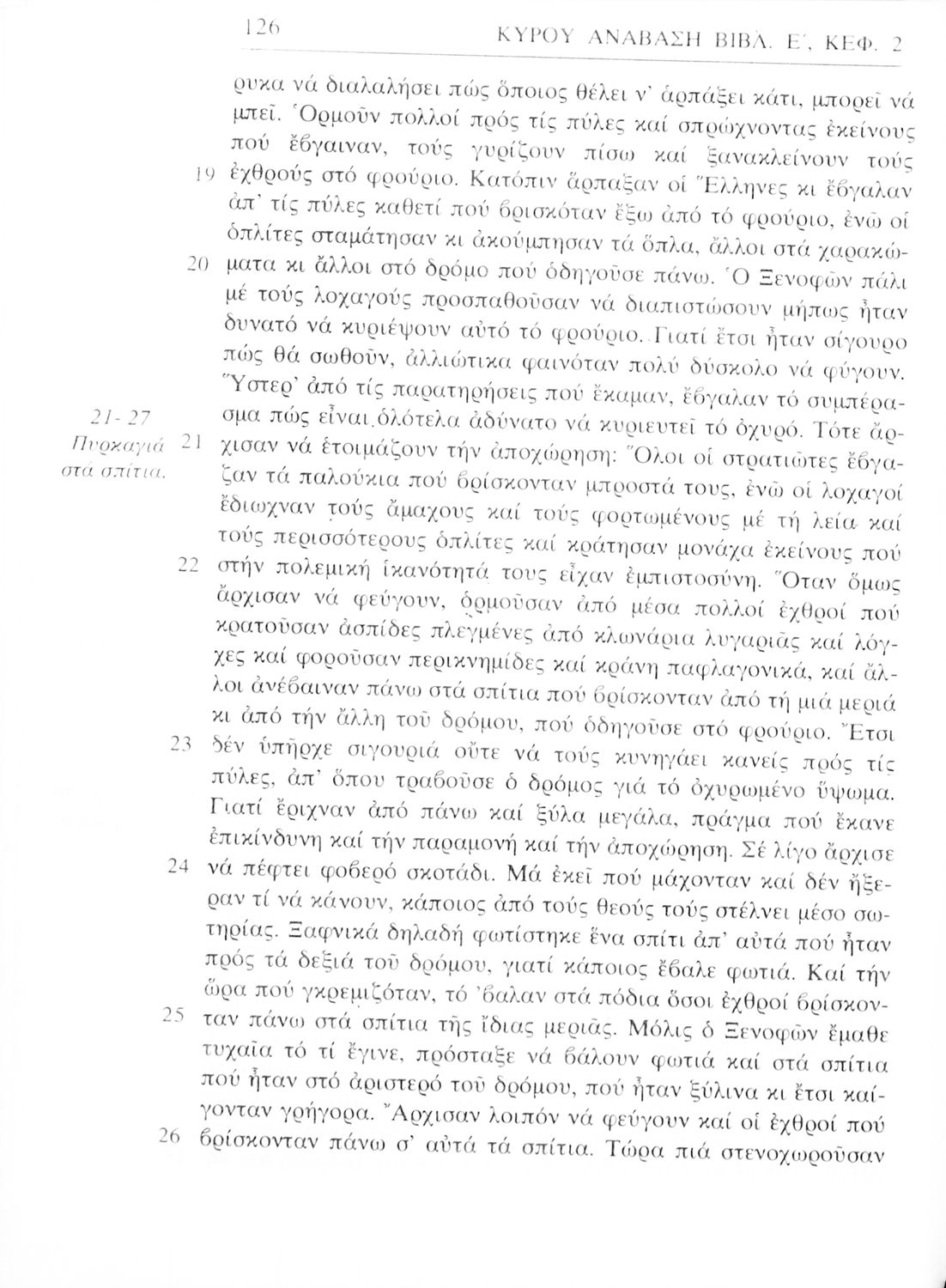 Σχολικό εγχειρίδιο Αρχαίων Ελληνικών α΄ Γυμνασίου που περιλαμβάνει μετάφραση του έργου του Ξενοφώντα Κύρου Ανάβασις, εισαγωγικά σχόλια για τη ζωή και το έργο του, και ερμηνευτικές παρατηρήσεις.