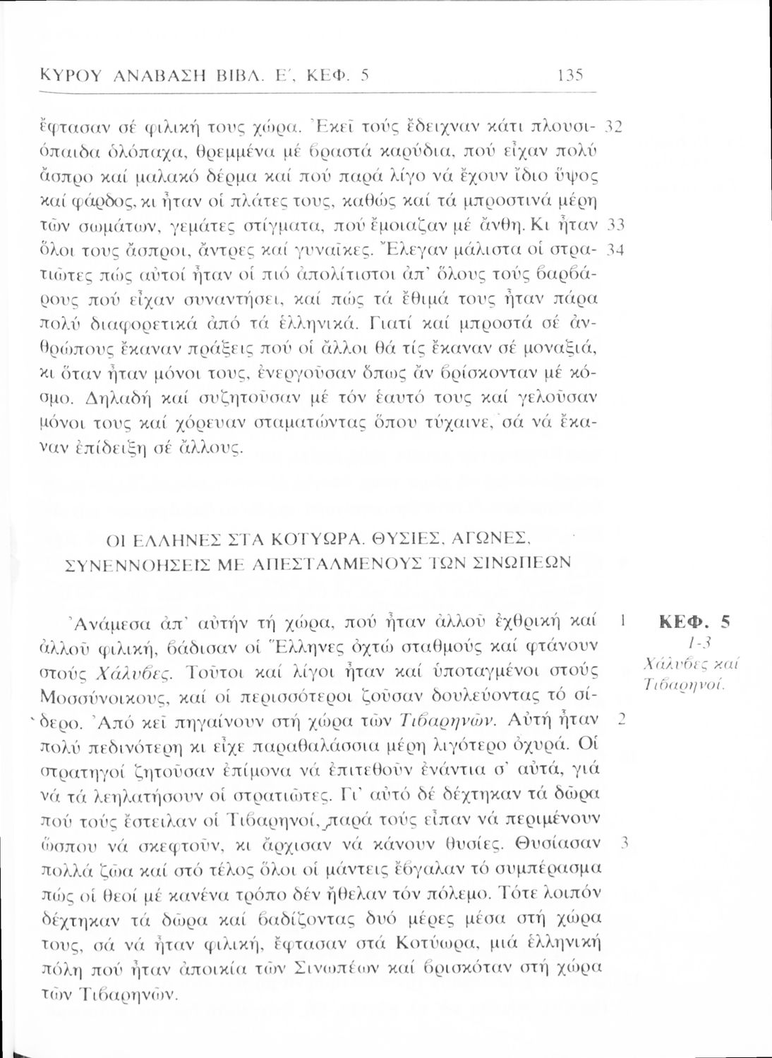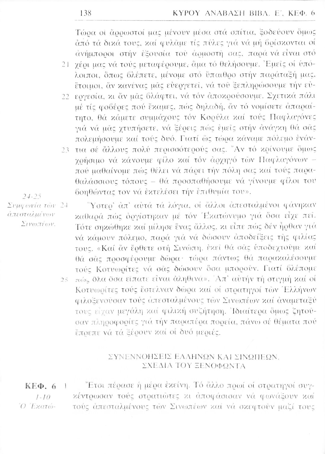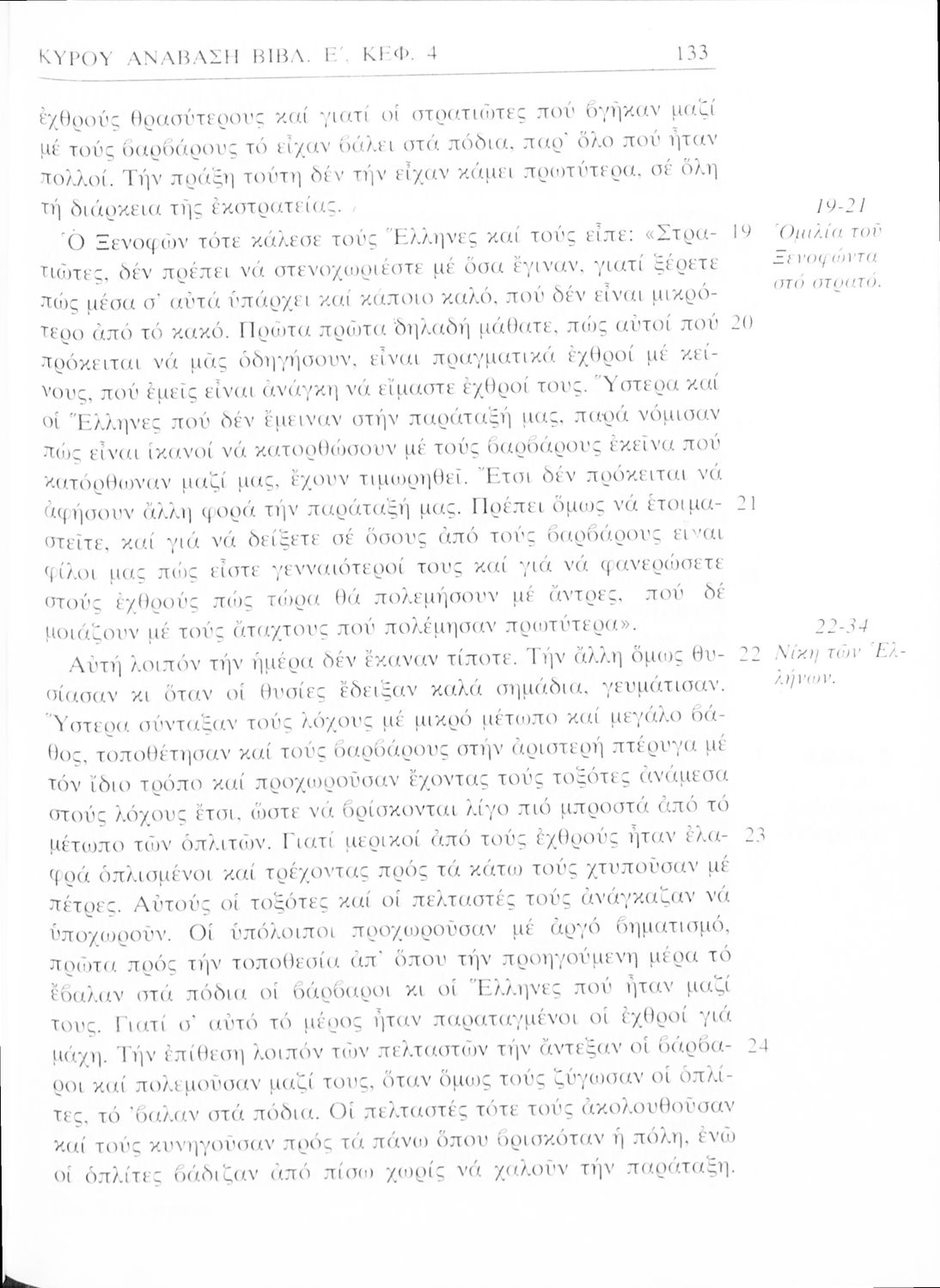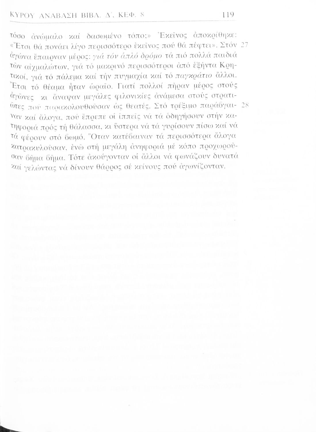 Σχολικό εγχειρίδιο Αρχαίων Ελληνικών α΄ Γυμνασίου που περιλαμβάνει μετάφραση του έργου του Ξενοφώντα Κύρου Ανάβασις, εισαγωγικά σχόλια για τη ζωή και το έργο του, και ερμηνευτικές παρατηρήσεις.