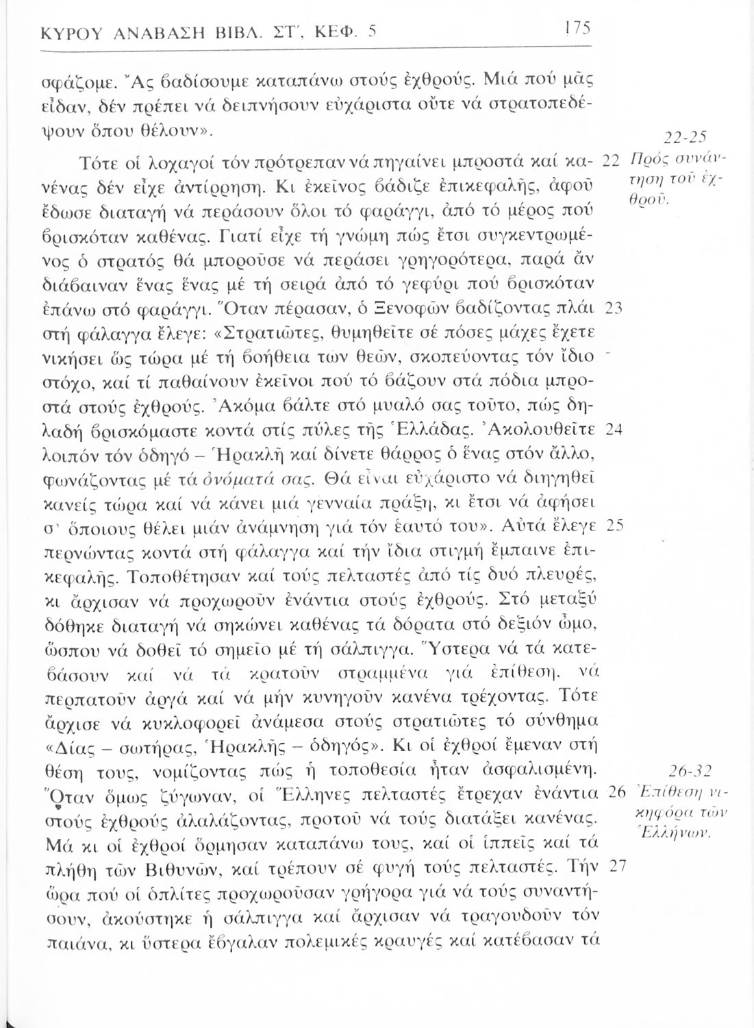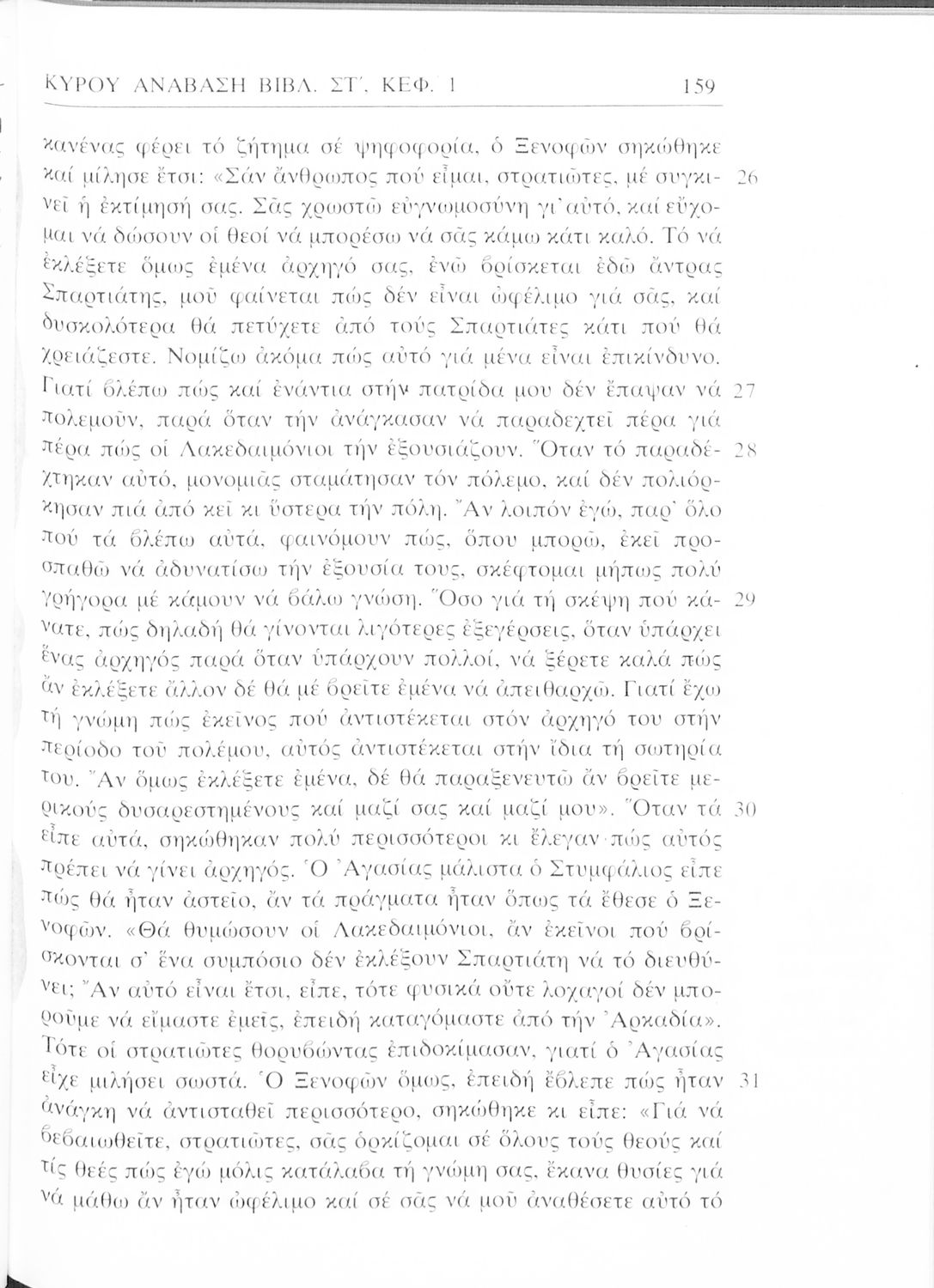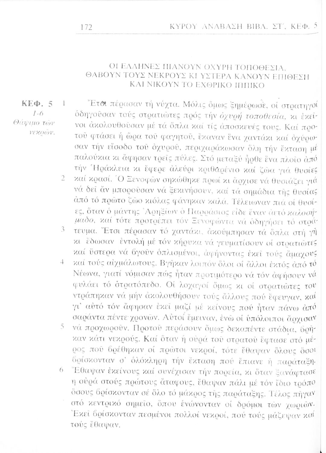 Σχολικό εγχειρίδιο Αρχαίων Ελληνικών α΄ Γυμνασίου που περιλαμβάνει μετάφραση του έργου του Ξενοφώντα Κύρου Ανάβασις, εισαγωγικά σχόλια για τη ζωή και το έργο του, και ερμηνευτικές παρατηρήσεις.