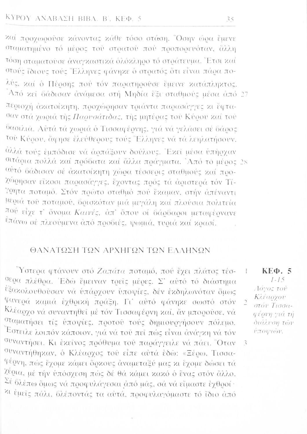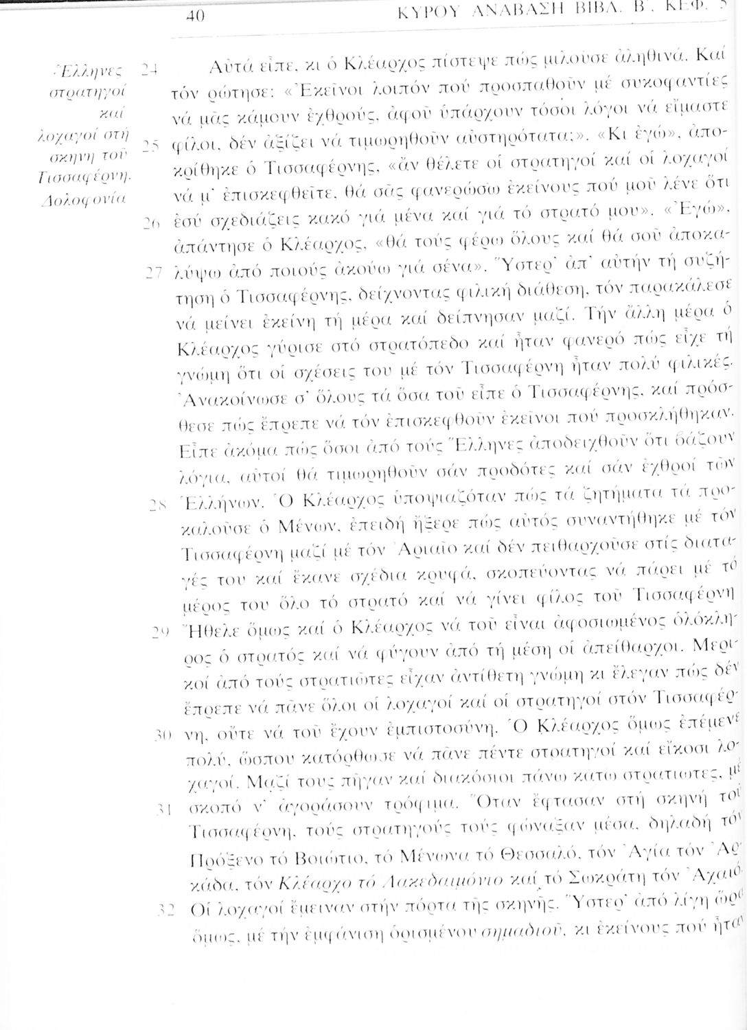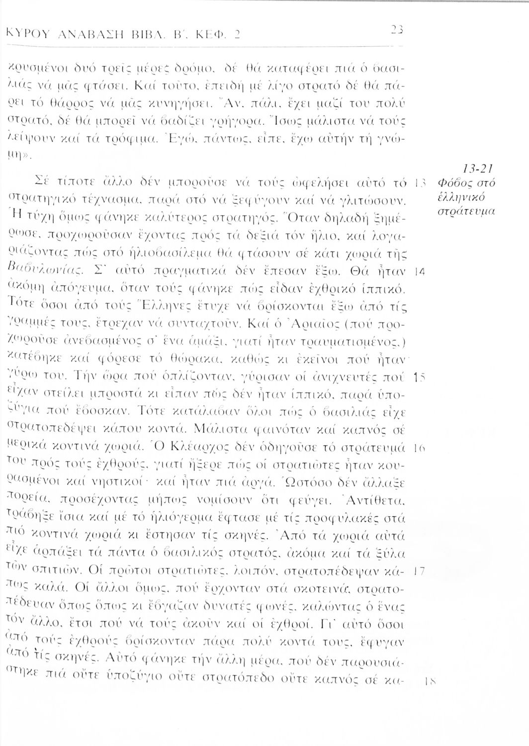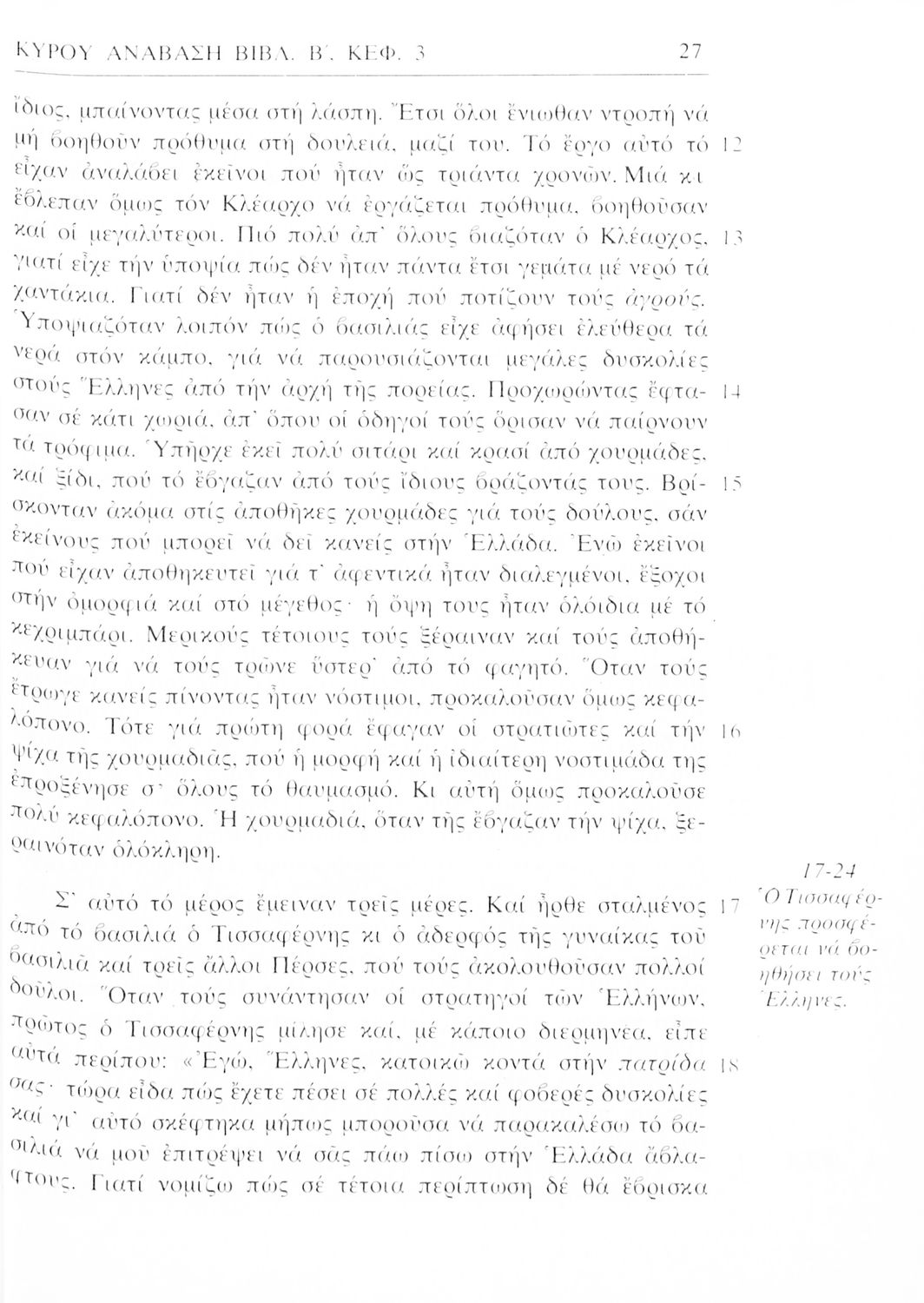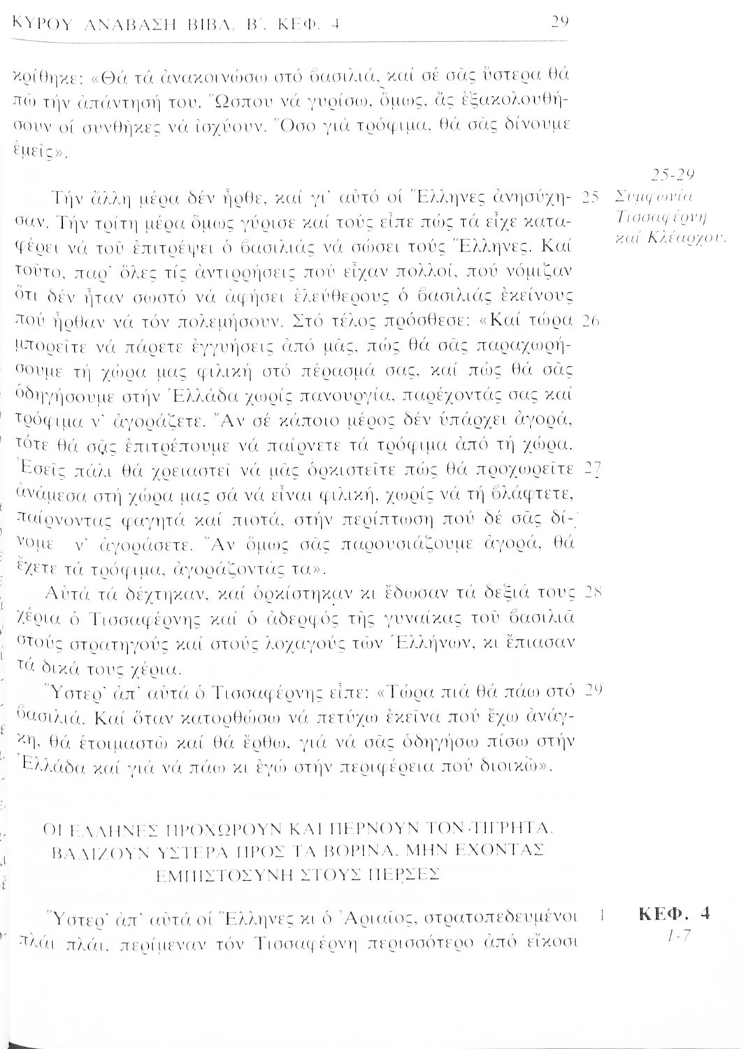 Σχολικό εγχειρίδιο Αρχαίων Ελληνικών α΄ Γυμνασίου που περιλαμβάνει μετάφραση του έργου του Ξενοφώντα Κύρου Ανάβασις, εισαγωγικά σχόλια για τη ζωή και το έργο του, και ερμηνευτικές παρατηρήσεις.