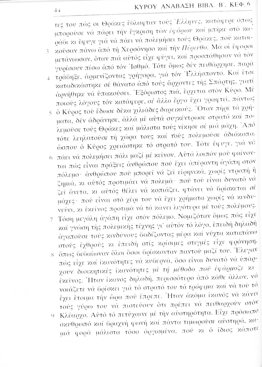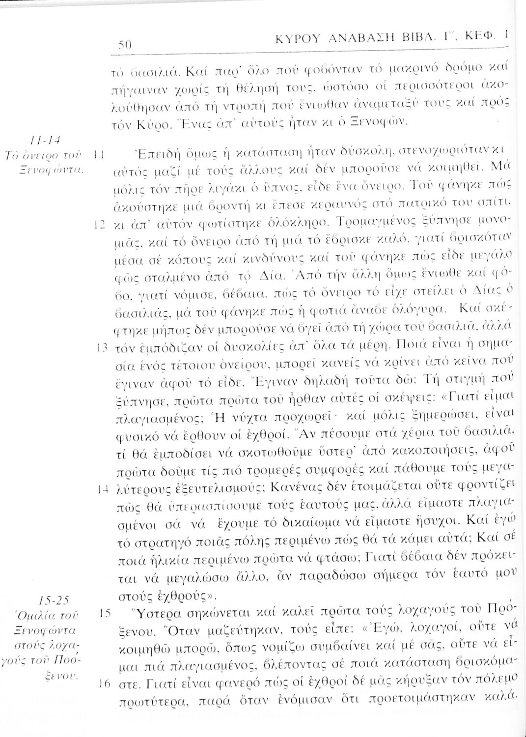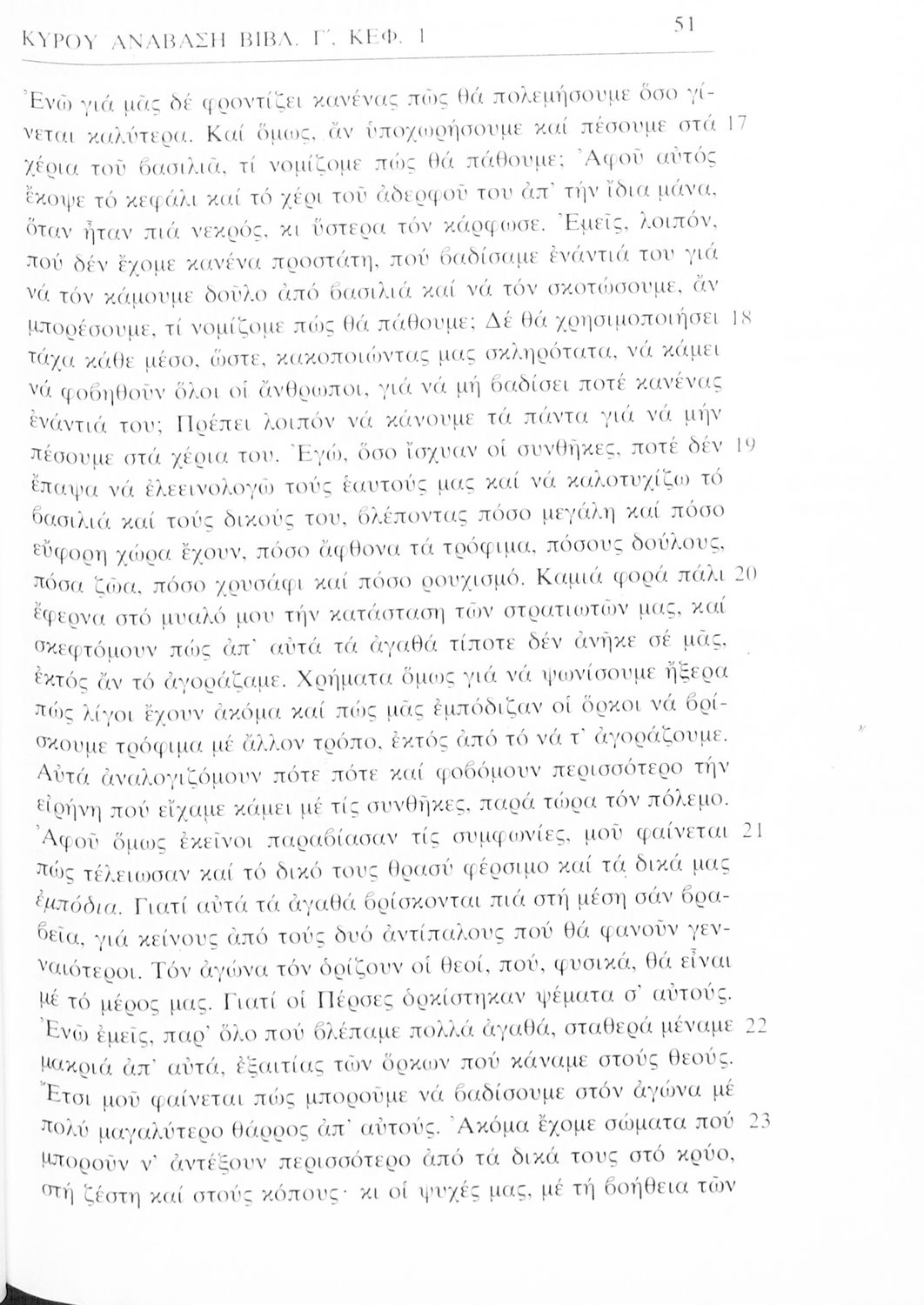 Σχολικό εγχειρίδιο Αρχαίων Ελληνικών α΄ Γυμνασίου που περιλαμβάνει μετάφραση του έργου του Ξενοφώντα Κύρου Ανάβασις, εισαγωγικά σχόλια για τη ζωή και το έργο του, και ερμηνευτικές παρατηρήσεις.