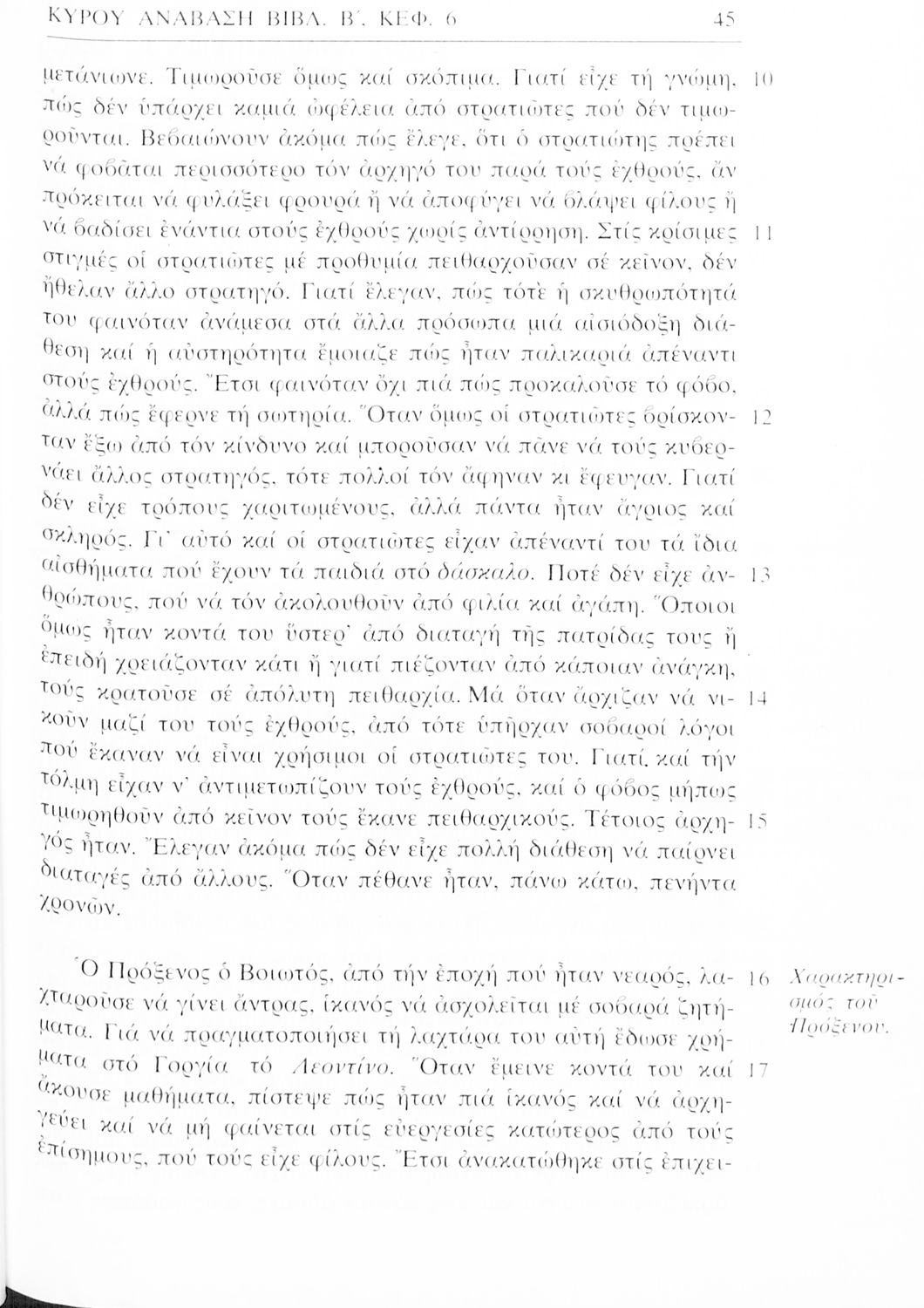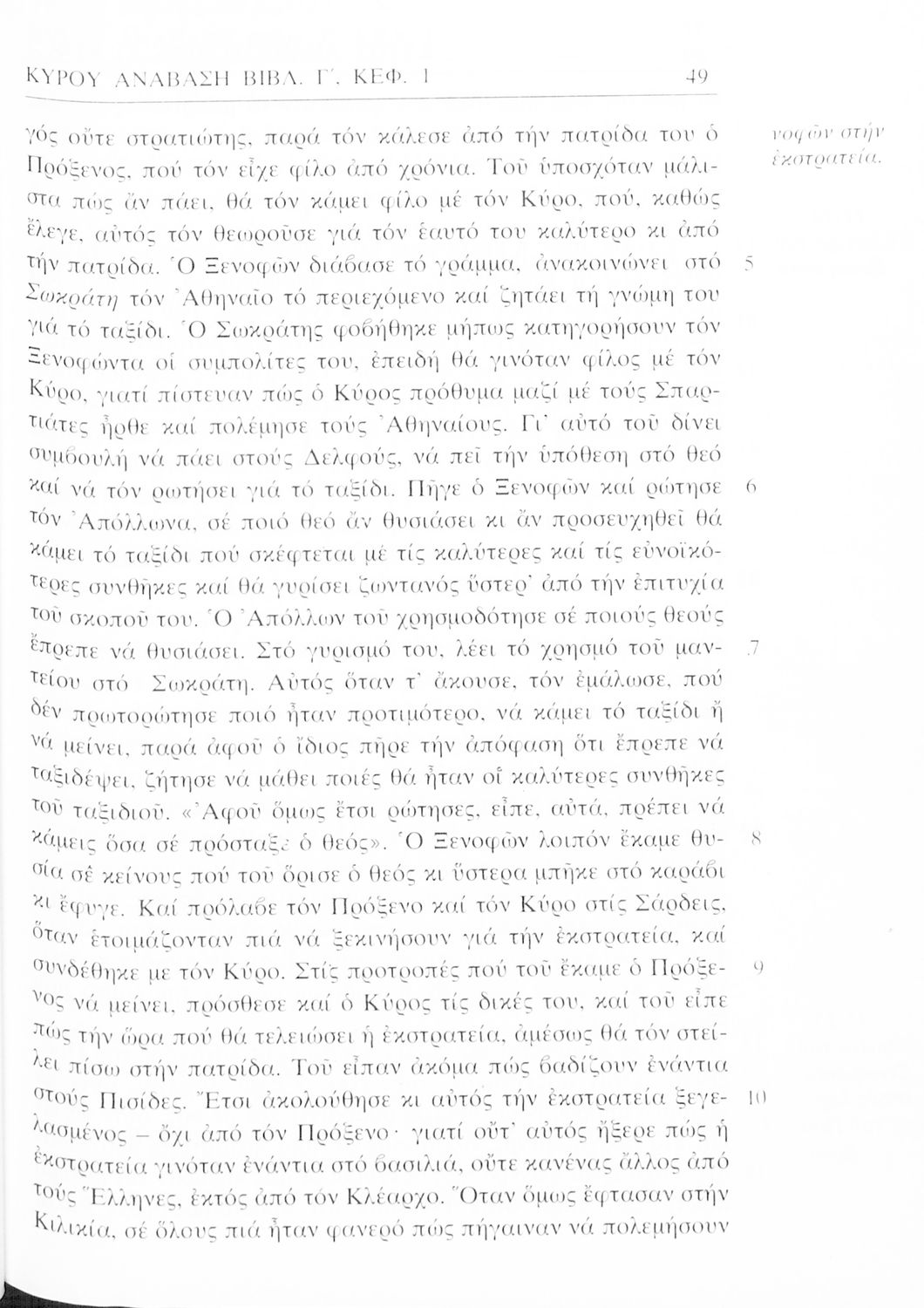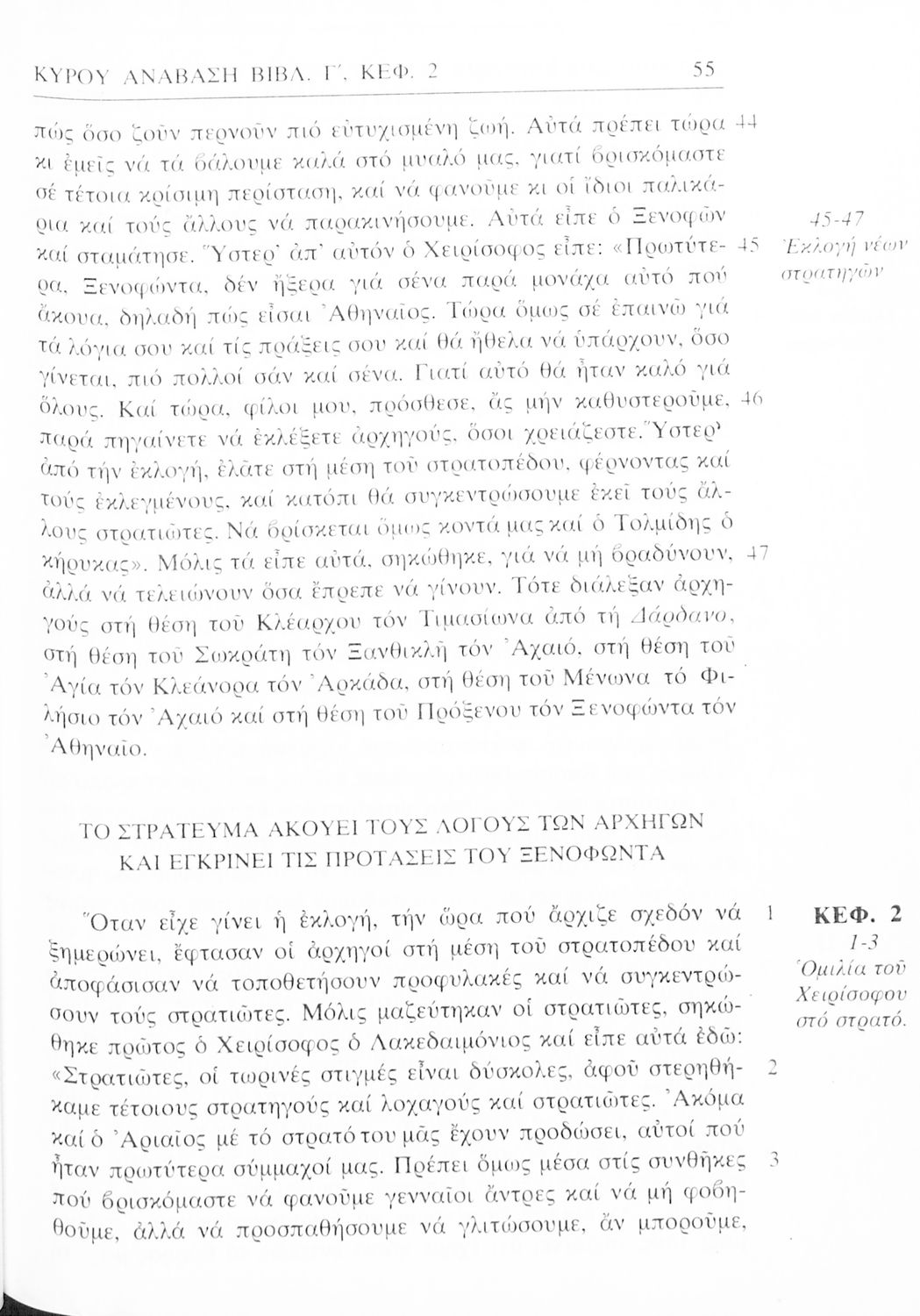 Σχολικό εγχειρίδιο Αρχαίων Ελληνικών α΄ Γυμνασίου που περιλαμβάνει μετάφραση του έργου του Ξενοφώντα Κύρου Ανάβασις, εισαγωγικά σχόλια για τη ζωή και το έργο του, και ερμηνευτικές παρατηρήσεις.