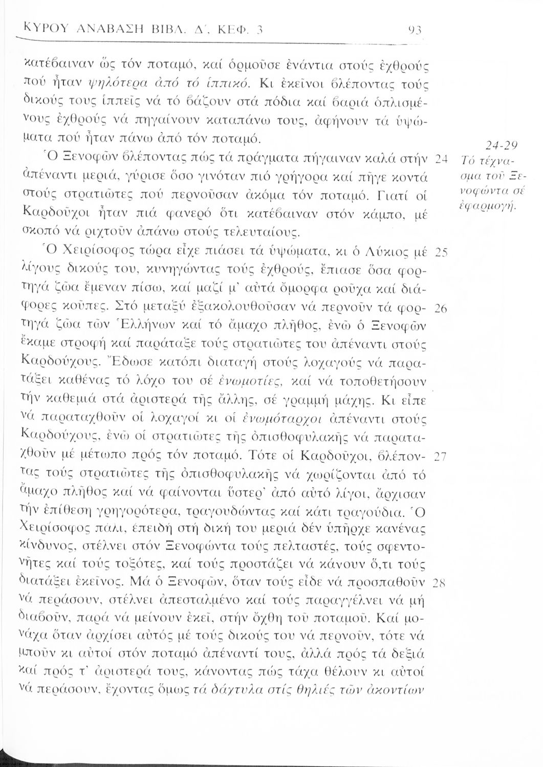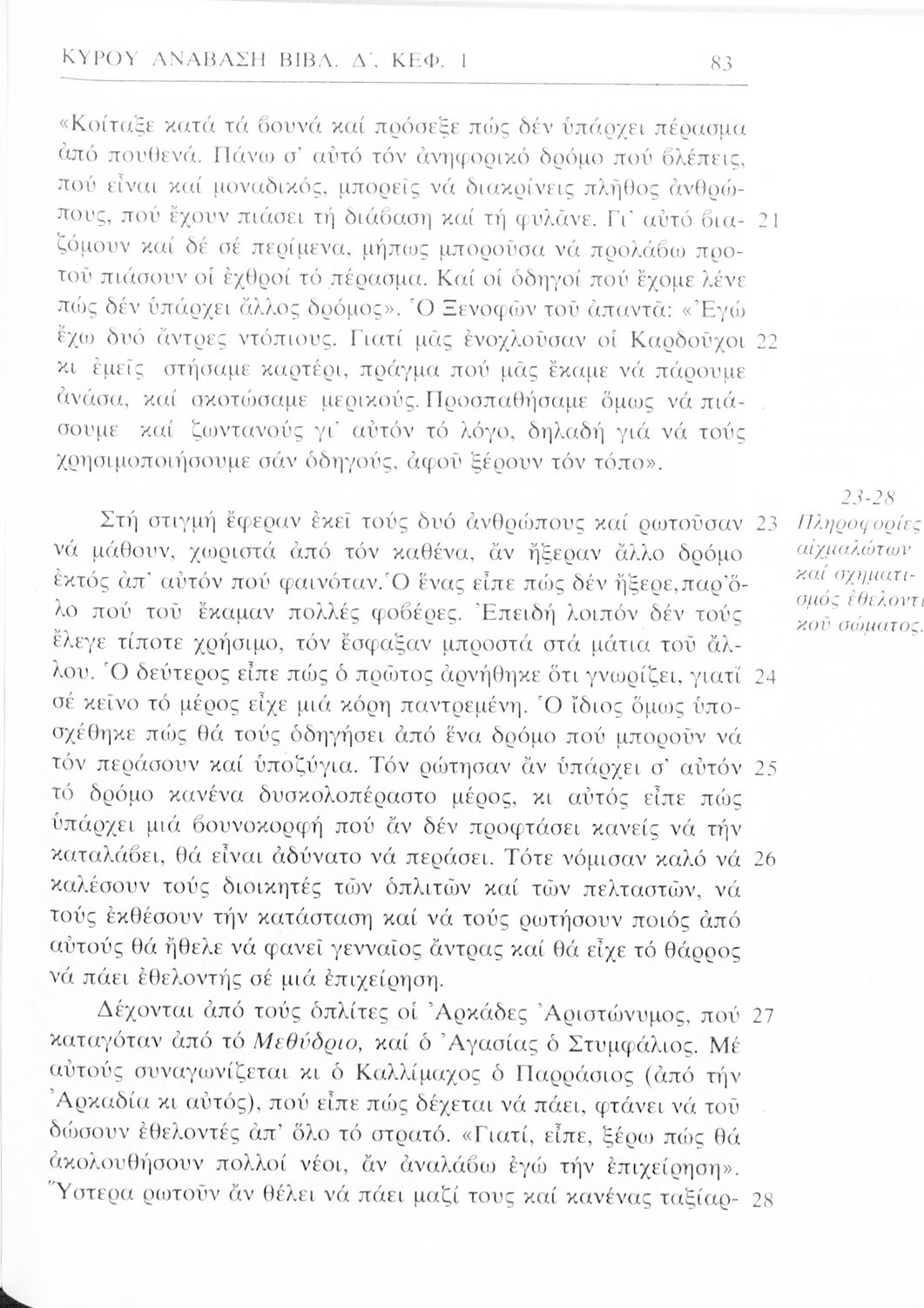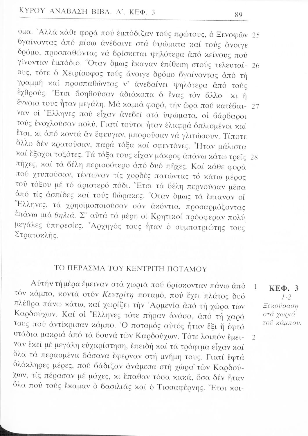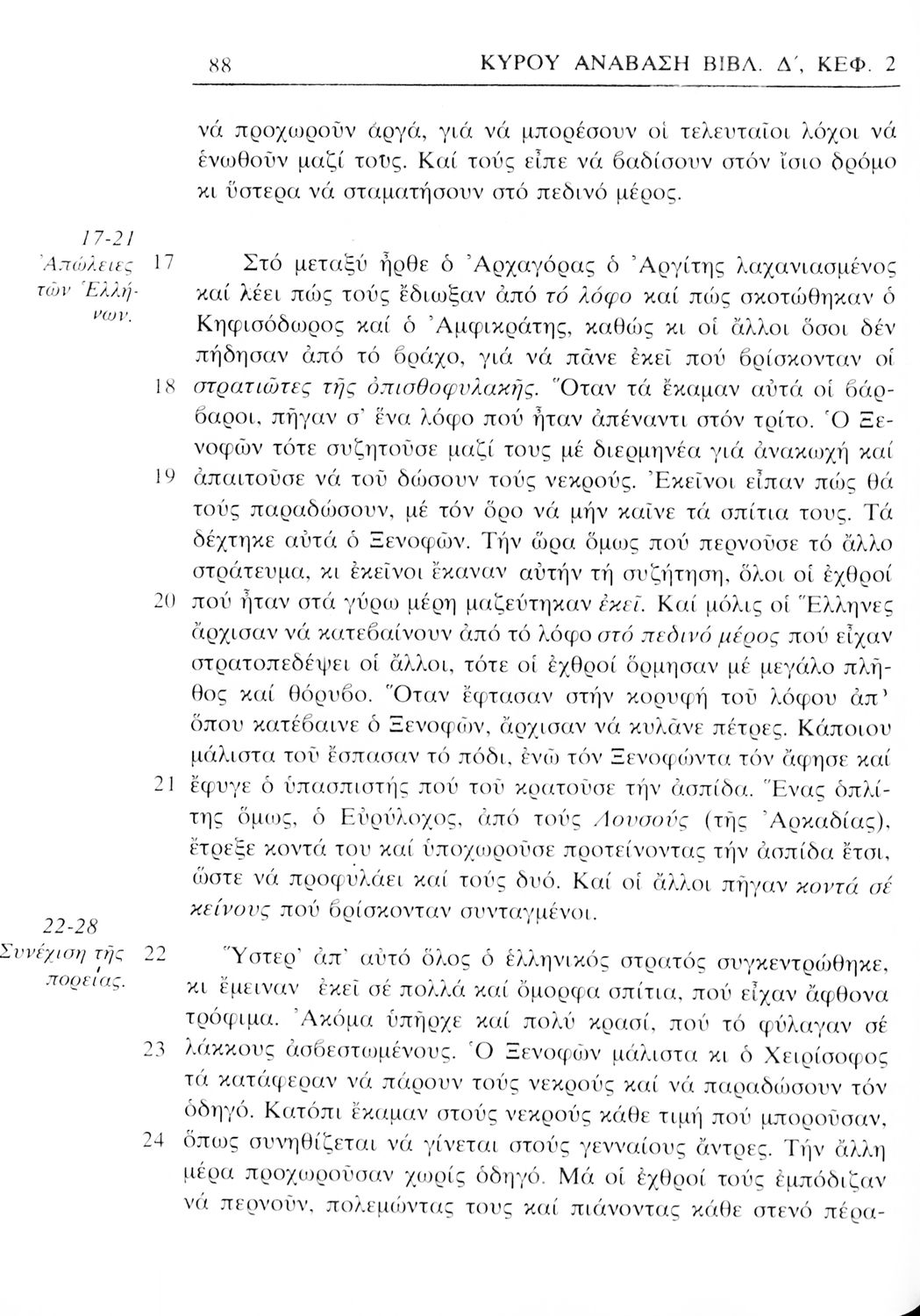 Σχολικό εγχειρίδιο Αρχαίων Ελληνικών α΄ Γυμνασίου που περιλαμβάνει μετάφραση του έργου του Ξενοφώντα Κύρου Ανάβασις, εισαγωγικά σχόλια για τη ζωή και το έργο του, και ερμηνευτικές παρατηρήσεις.