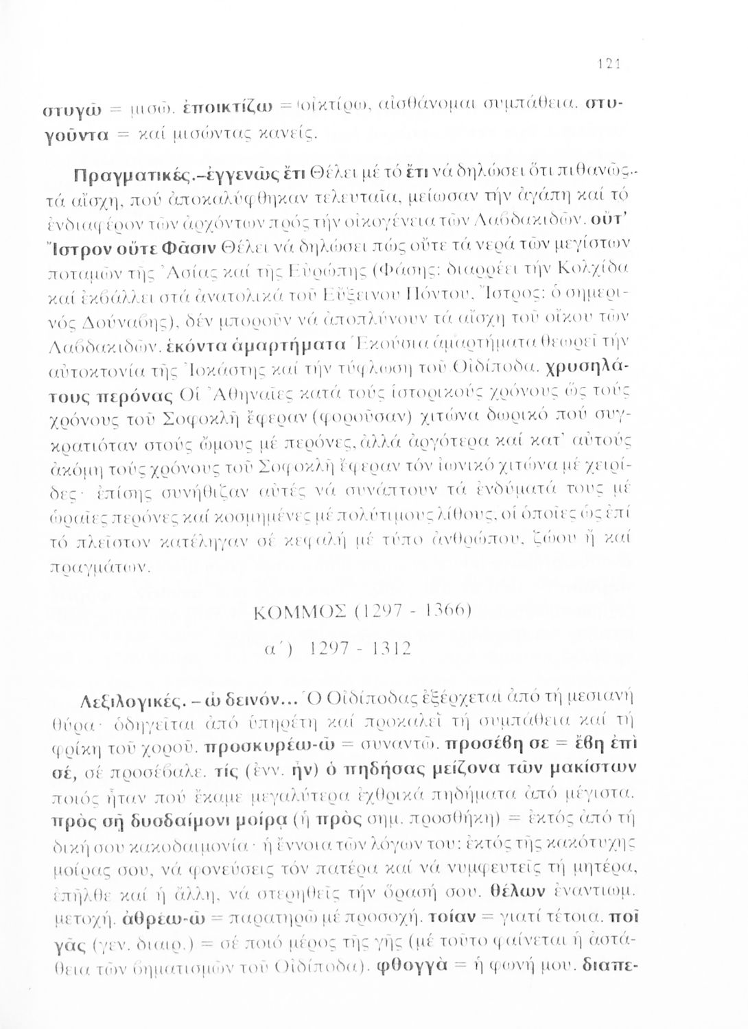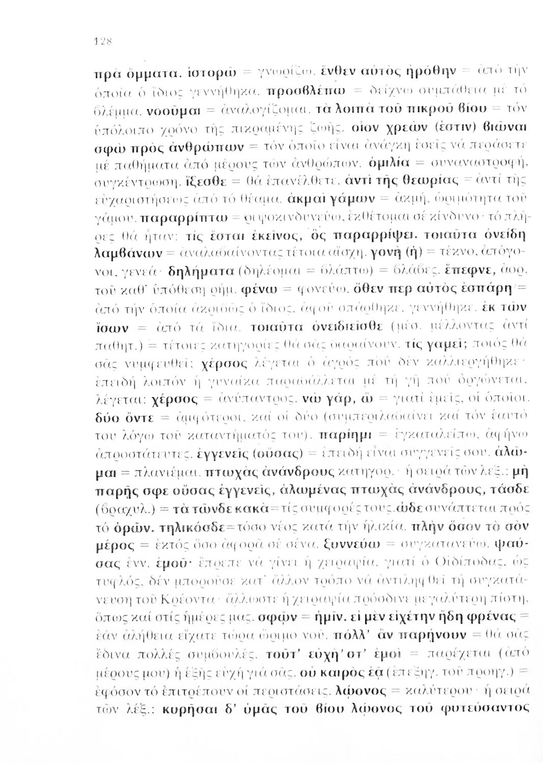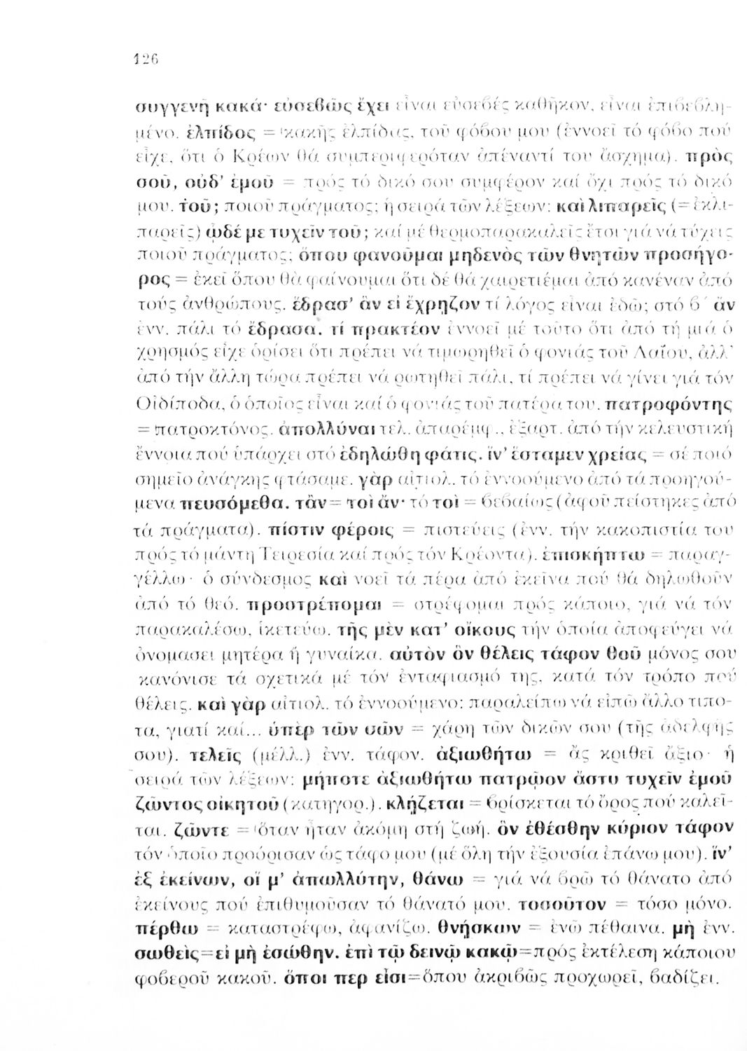 Σχολικό εγχειρίδιο Αρχαίων Ελληνικών της Γ΄ Λυκείου το οποίο περιλαμβάνει το έργο του Σοφοκλή 'Οιδίπους Τύραννος'. Το βιβλίο ξεκινάει με μια εισαγωγή στην αρχαία ελληνική τραγωδία και βιογραφικά στοιχεία του Σοφοκλή. Στη συνέχεια παρουσιάζει το εν λόγω κείμενο το οποίο συνοδεύεται από ερμηνευτικές και γλωσσικές σημειώσεις.