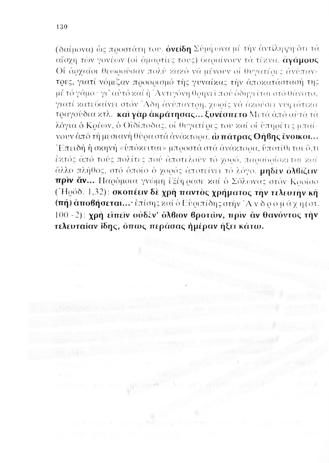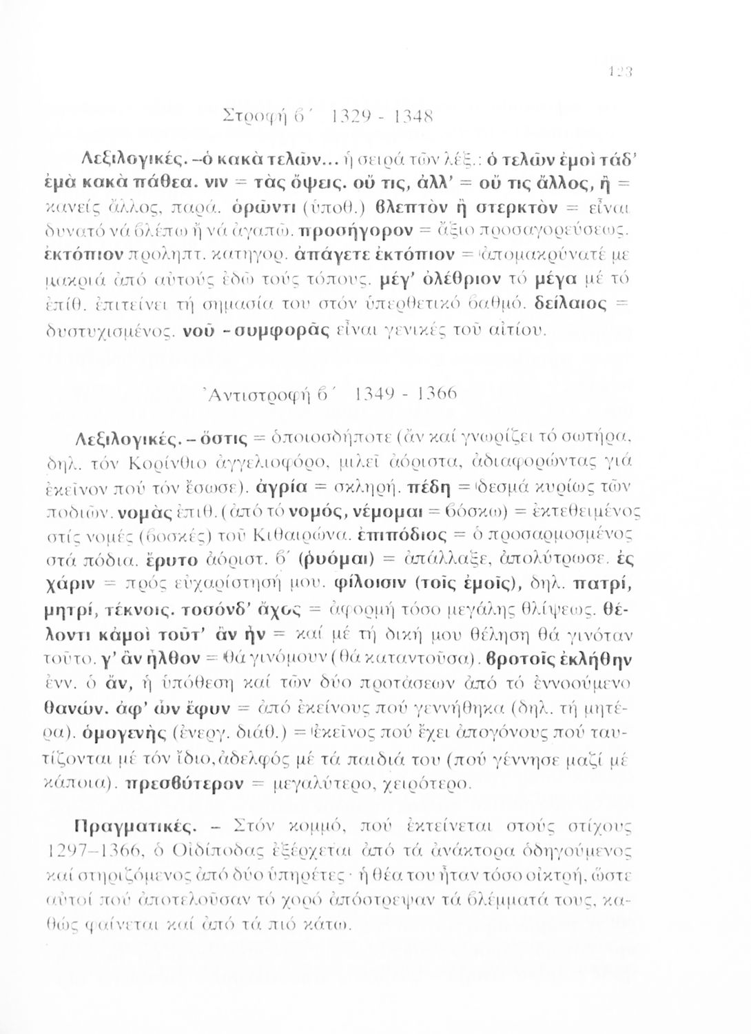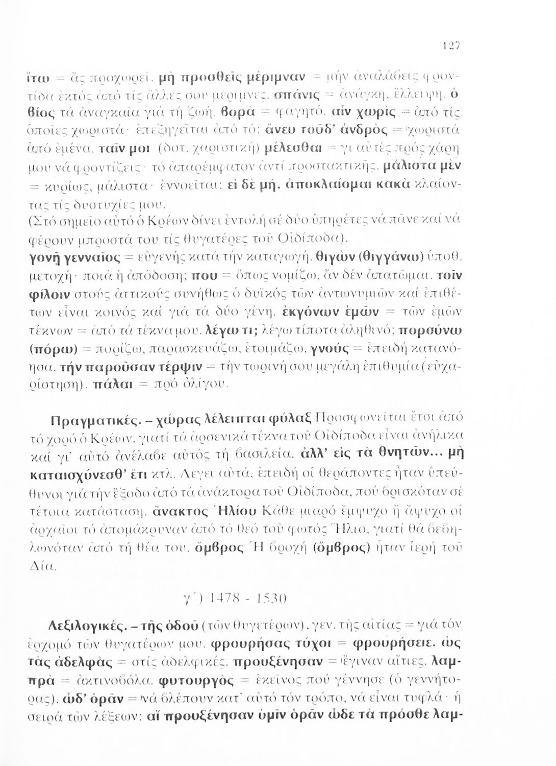 Σχολικό εγχειρίδιο Αρχαίων Ελληνικών της Γ΄ Λυκείου το οποίο περιλαμβάνει το έργο του Σοφοκλή 'Οιδίπους Τύραννος'. Το βιβλίο ξεκινάει με μια εισαγωγή στην αρχαία ελληνική τραγωδία και βιογραφικά στοιχεία του Σοφοκλή. Στη συνέχεια παρουσιάζει το εν λόγω κείμενο το οποίο συνοδεύεται από ερμηνευτικές και γλωσσικές σημειώσεις.