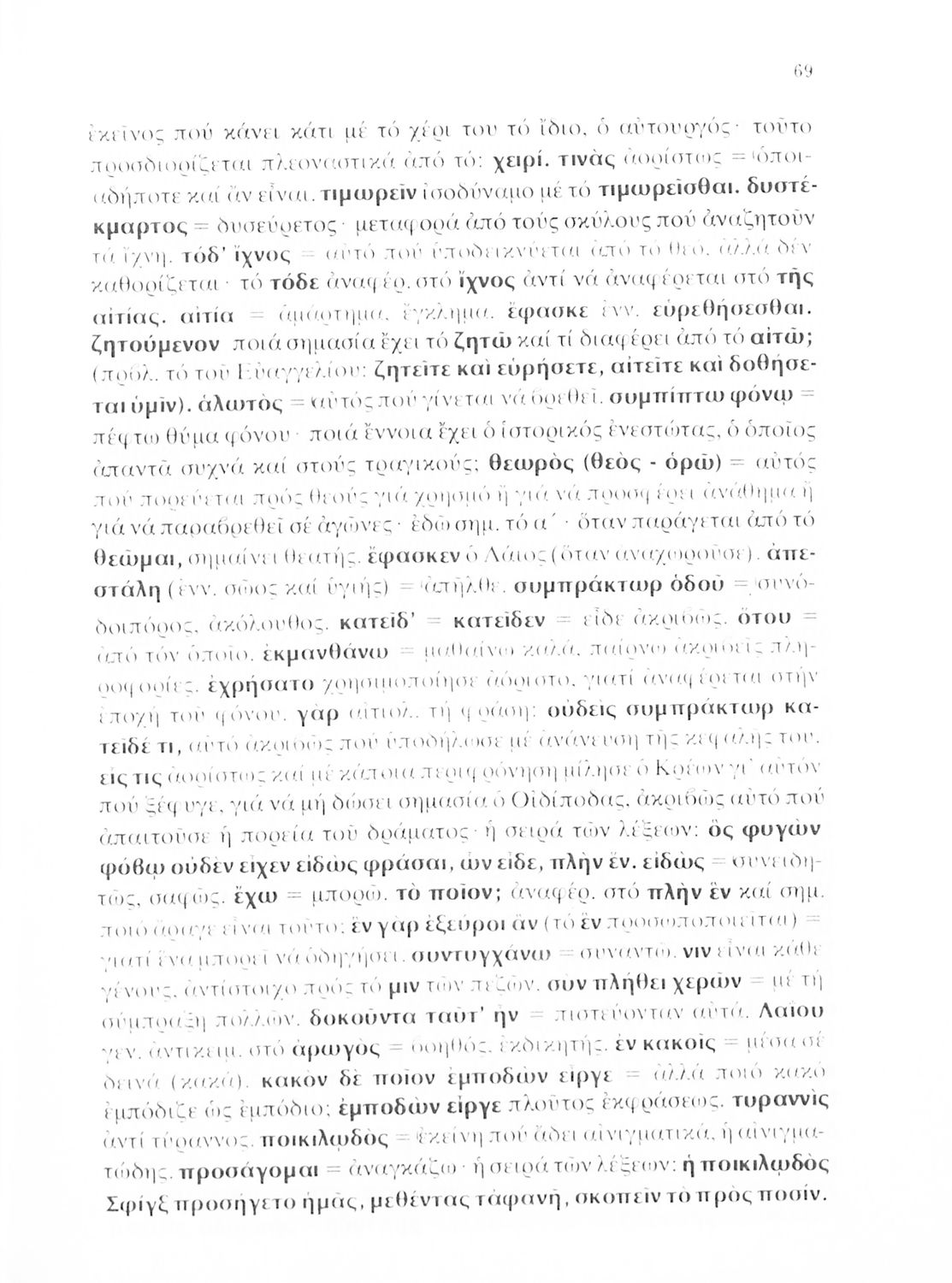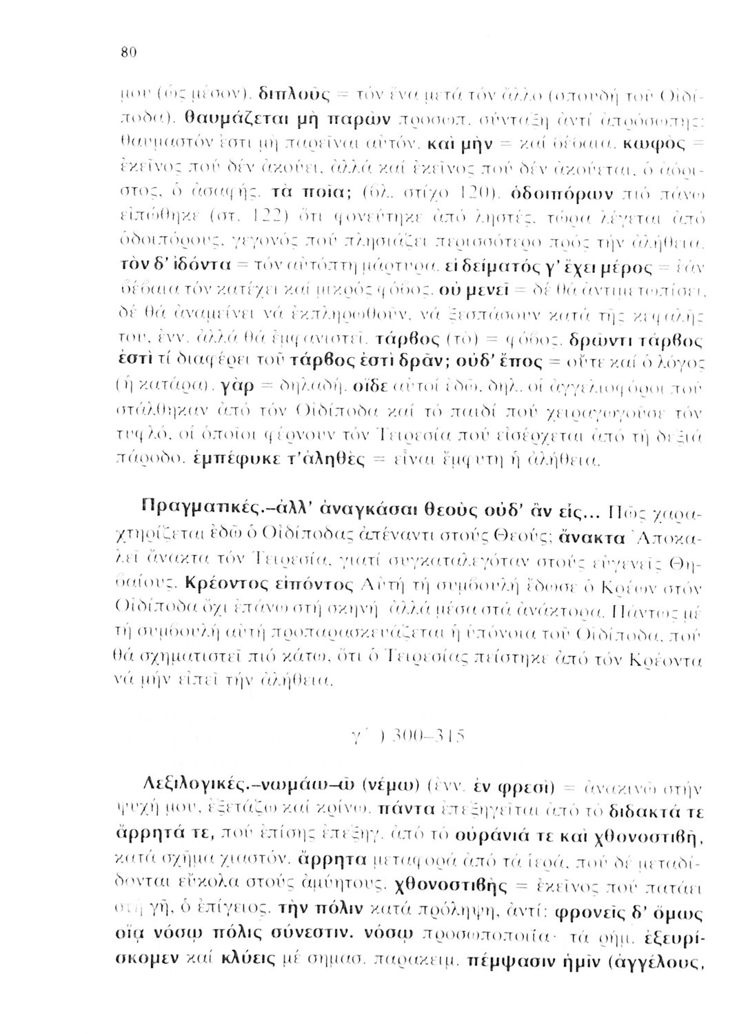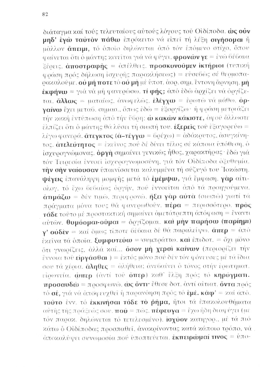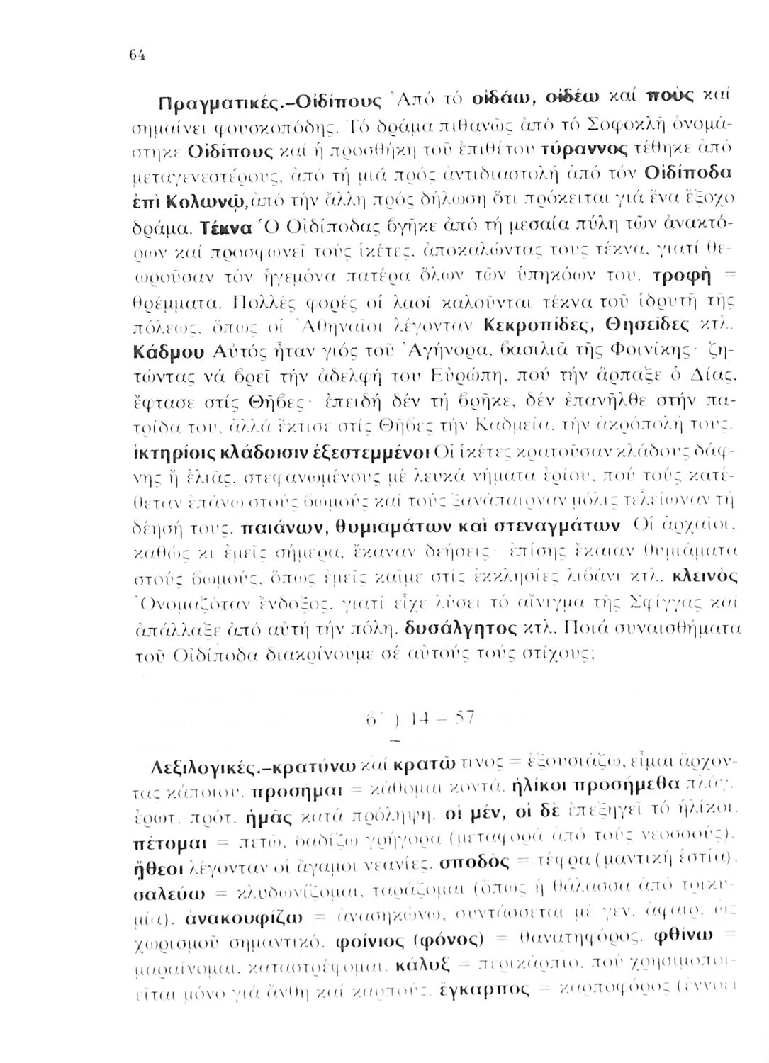 Σχολικό εγχειρίδιο Αρχαίων Ελληνικών της Γ΄ Λυκείου το οποίο περιλαμβάνει το έργο του Σοφοκλή 'Οιδίπους Τύραννος'. Το βιβλίο ξεκινάει με μια εισαγωγή στην αρχαία ελληνική τραγωδία και βιογραφικά στοιχεία του Σοφοκλή. Στη συνέχεια παρουσιάζει το εν λόγω κείμενο το οποίο συνοδεύεται από ερμηνευτικές και γλωσσικές σημειώσεις.