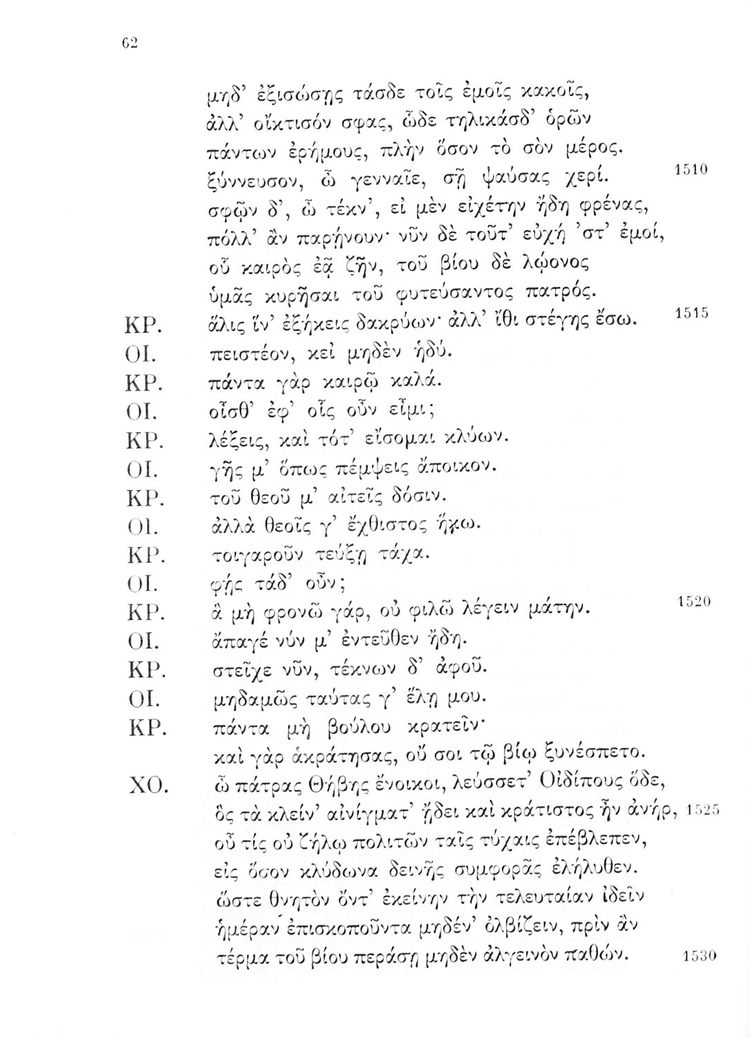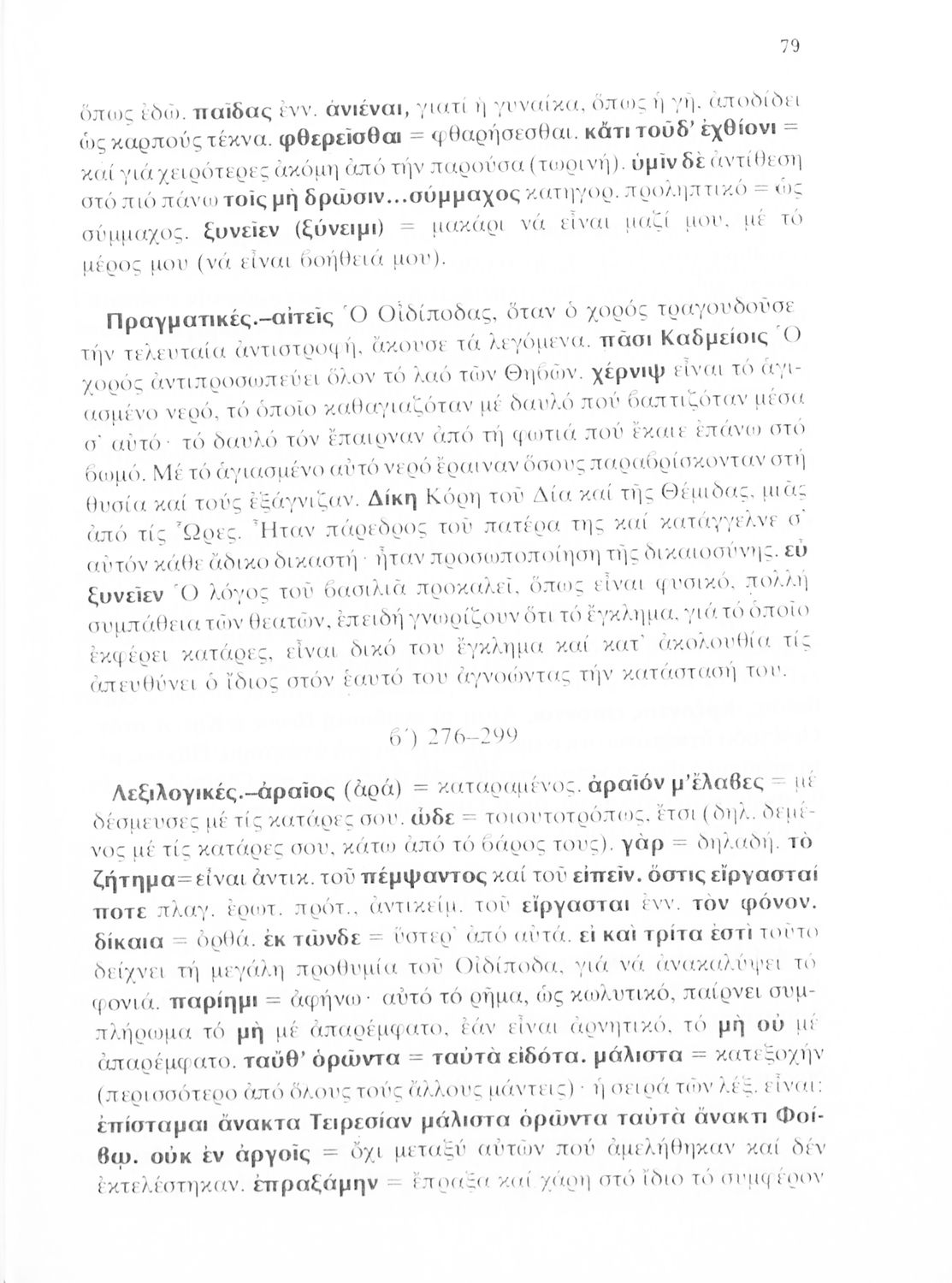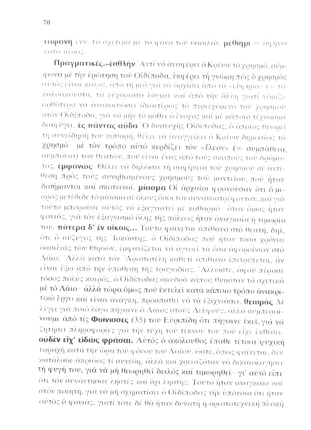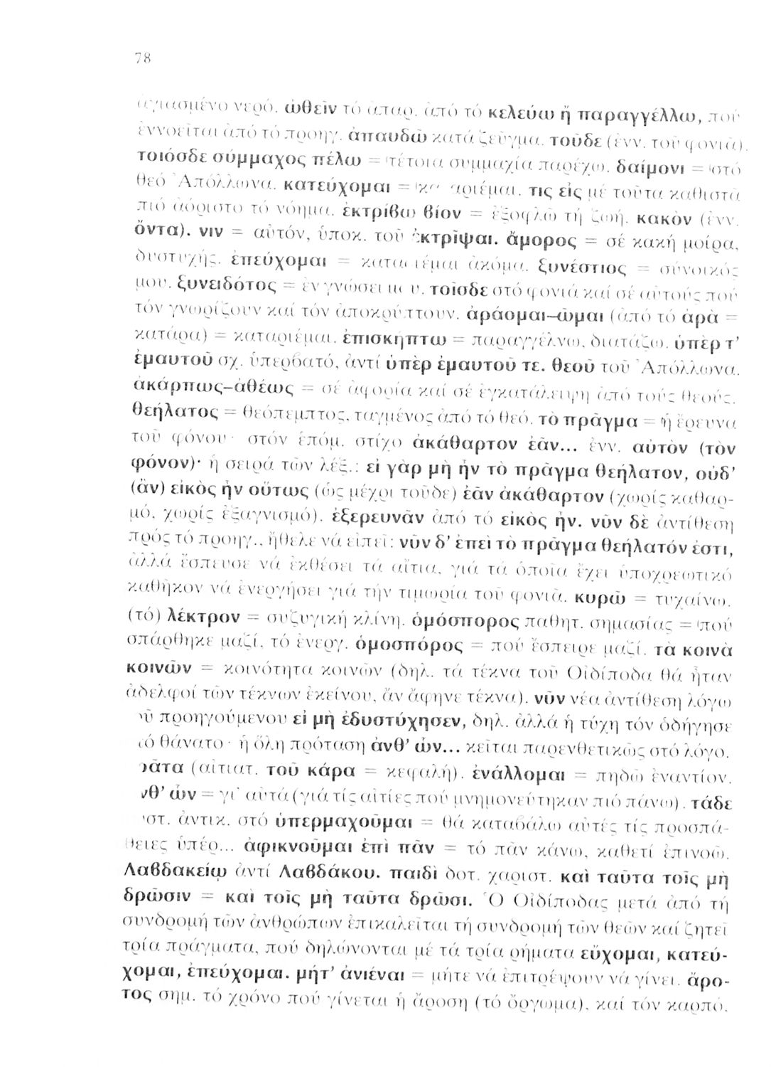 Σχολικό εγχειρίδιο Αρχαίων Ελληνικών της Γ΄ Λυκείου το οποίο περιλαμβάνει το έργο του Σοφοκλή 'Οιδίπους Τύραννος'. Το βιβλίο ξεκινάει με μια εισαγωγή στην αρχαία ελληνική τραγωδία και βιογραφικά στοιχεία του Σοφοκλή. Στη συνέχεια παρουσιάζει το εν λόγω κείμενο το οποίο συνοδεύεται από ερμηνευτικές και γλωσσικές σημειώσεις.