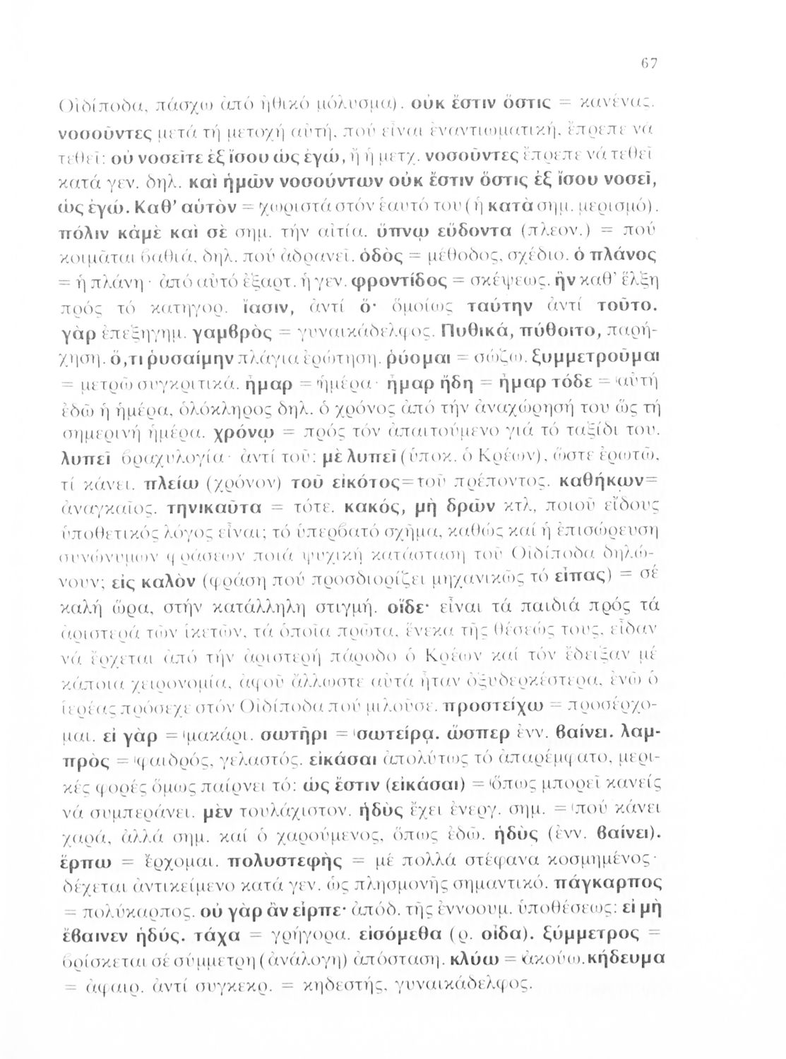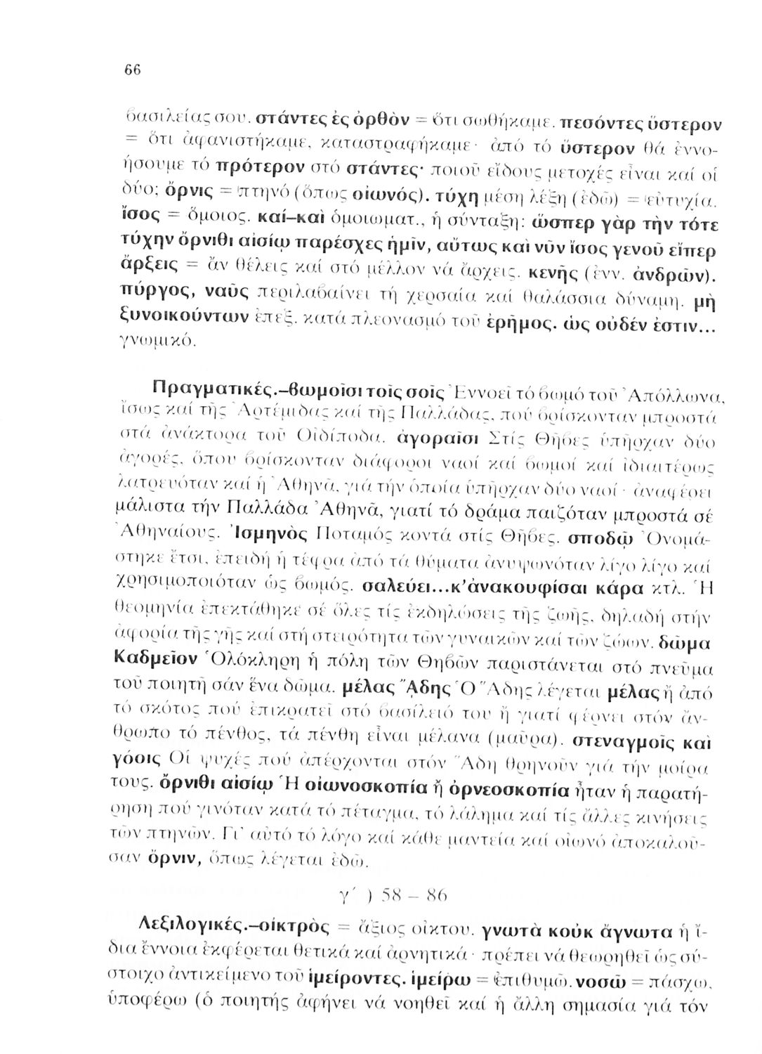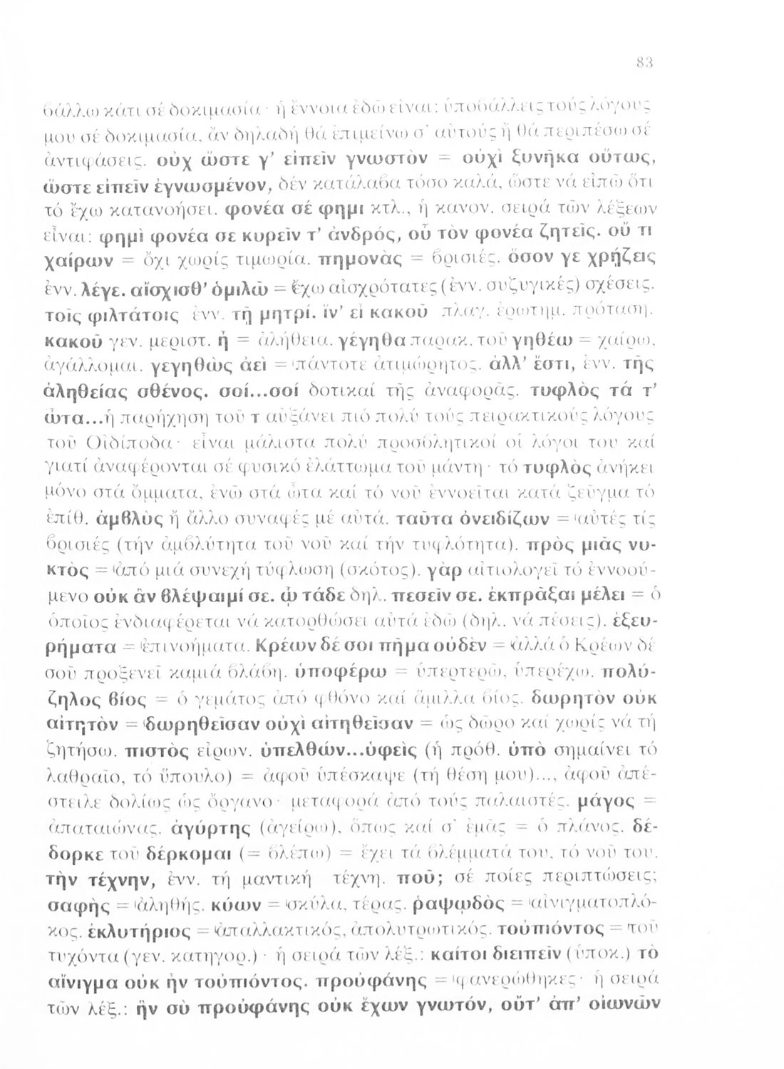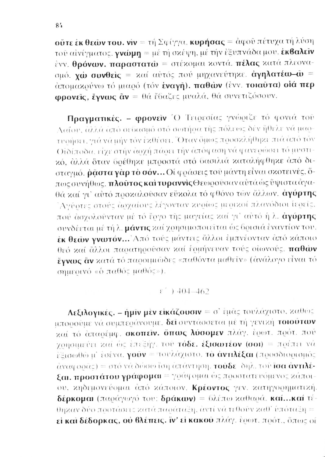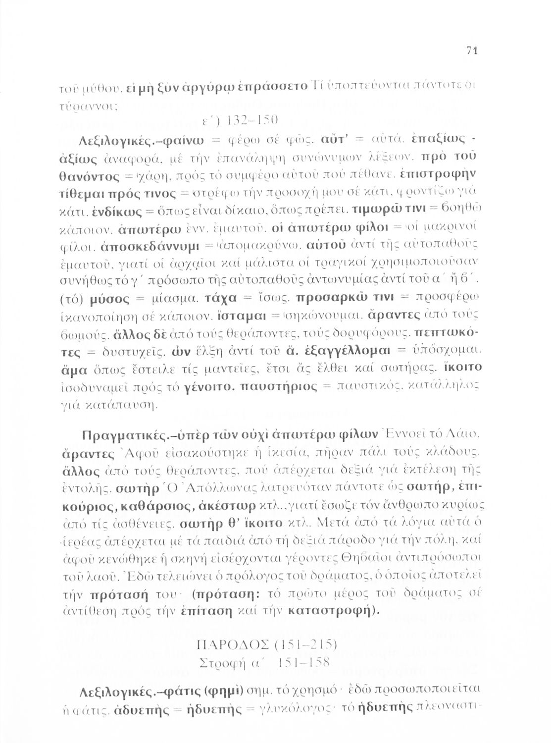 Σχολικό εγχειρίδιο Αρχαίων Ελληνικών της Γ΄ Λυκείου το οποίο περιλαμβάνει το έργο του Σοφοκλή 'Οιδίπους Τύραννος'. Το βιβλίο ξεκινάει με μια εισαγωγή στην αρχαία ελληνική τραγωδία και βιογραφικά στοιχεία του Σοφοκλή. Στη συνέχεια παρουσιάζει το εν λόγω κείμενο το οποίο συνοδεύεται από ερμηνευτικές και γλωσσικές σημειώσεις.