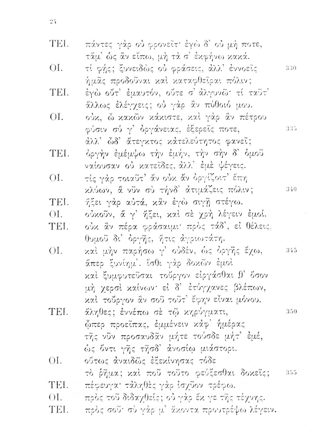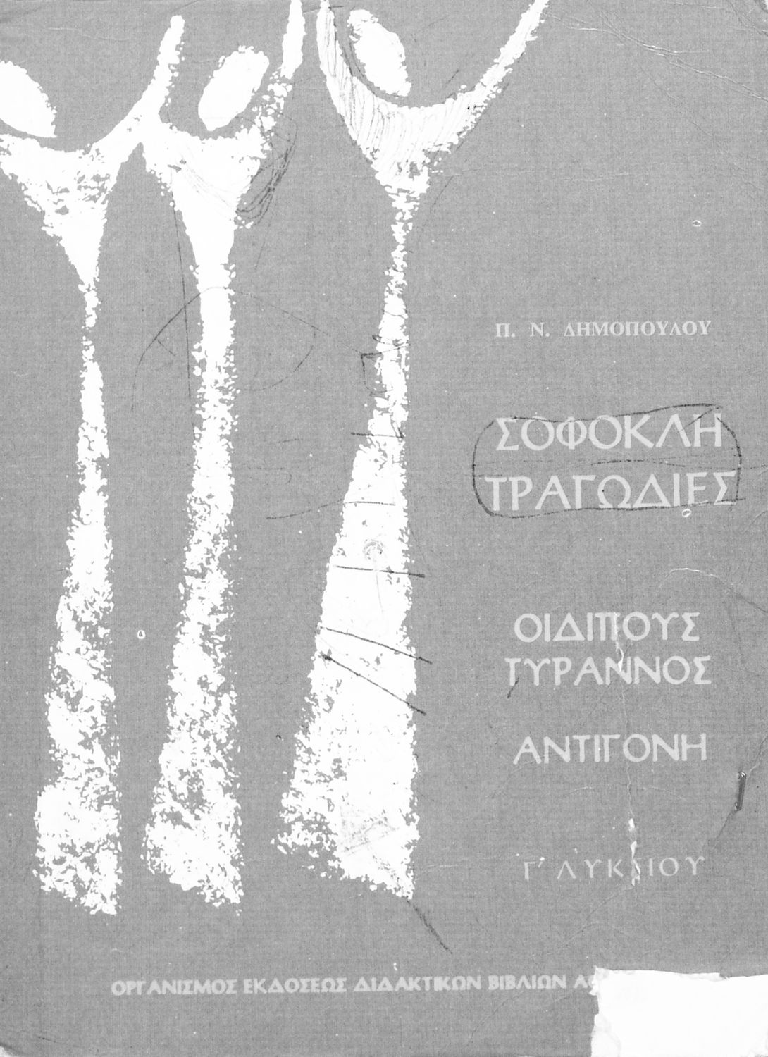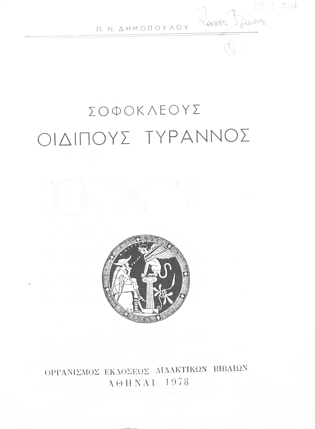 Σχολικό εγχειρίδιο Αρχαίων Ελληνικών της Γ΄ Λυκείου το οποίο περιλαμβάνει το έργο του Σοφοκλή 'Οιδίπους Τύραννος'. Το βιβλίο ξεκινάει με μια εισαγωγή στην αρχαία ελληνική τραγωδία και βιογραφικά στοιχεία του Σοφοκλή. Στη συνέχεια παρουσιάζει το εν λόγω κείμενο το οποίο συνοδεύεται από ερμηνευτικές και γλωσσικές σημειώσεις.