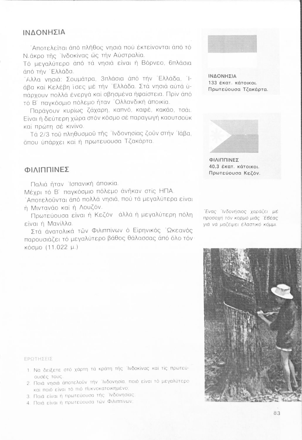 Σχολικό εγχειρίδιο Γεωγραφίας Δ' Γυμνασίου που αποτελεί μια επισκόπηση των ηπείρων εκτός της Ευρώπης και εξετάζει ενδεικτικά κράτη και περιοχές από γεωφυσική, πολιτική και οικονομική σκοπιά. Γίνεται αναφορά ...