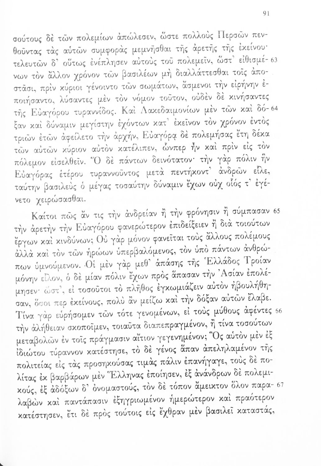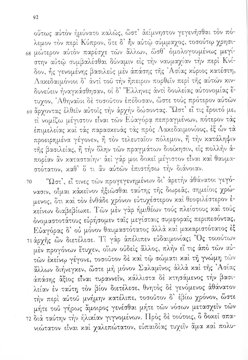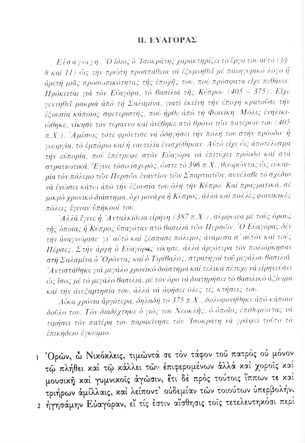Σχολικό εγχειρίδιο Αρχαίων Ελληνικών Γ΄ Γυμνασίου που περιλαμβάνει εισαγωγή στη ζωή και το έργο του Ισοκράτη, τους Λόγους Προς Δημόνικον και Ευαγόρας και ερμηνευτικές σημειώσεις.