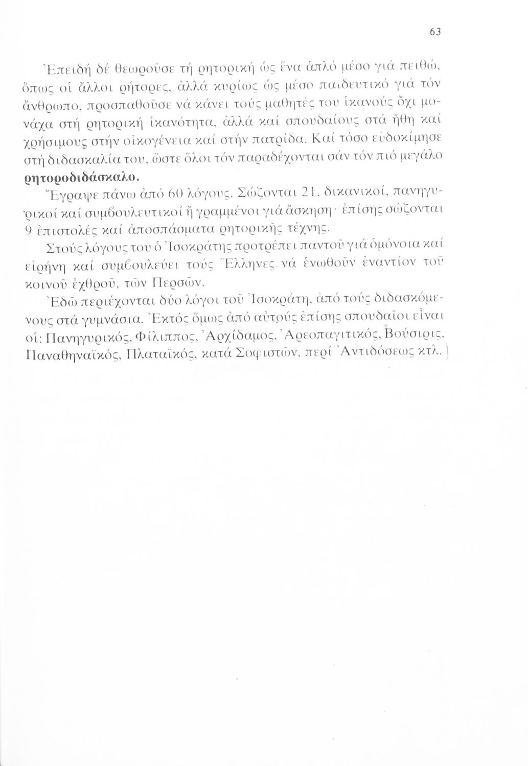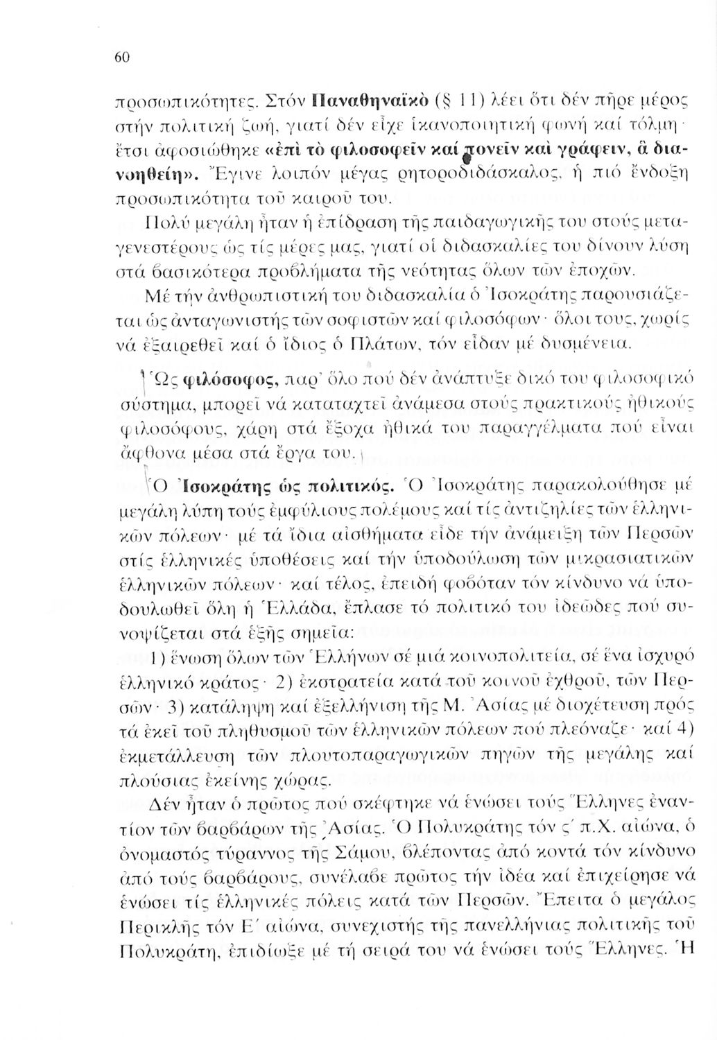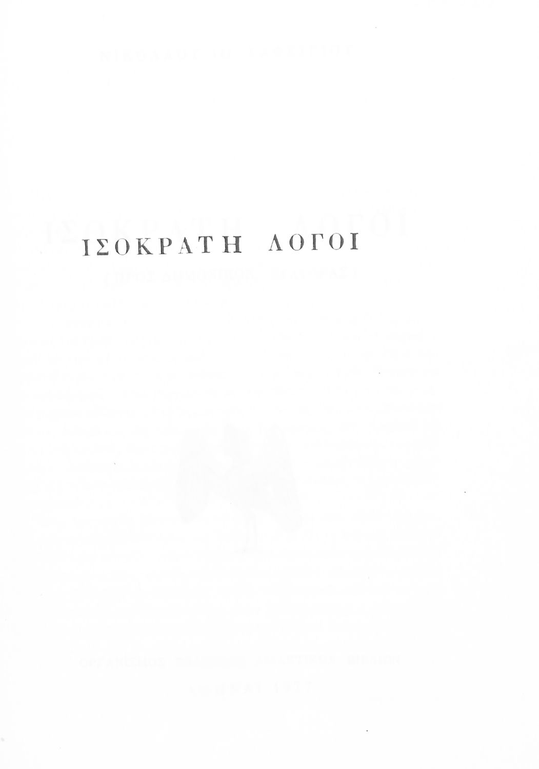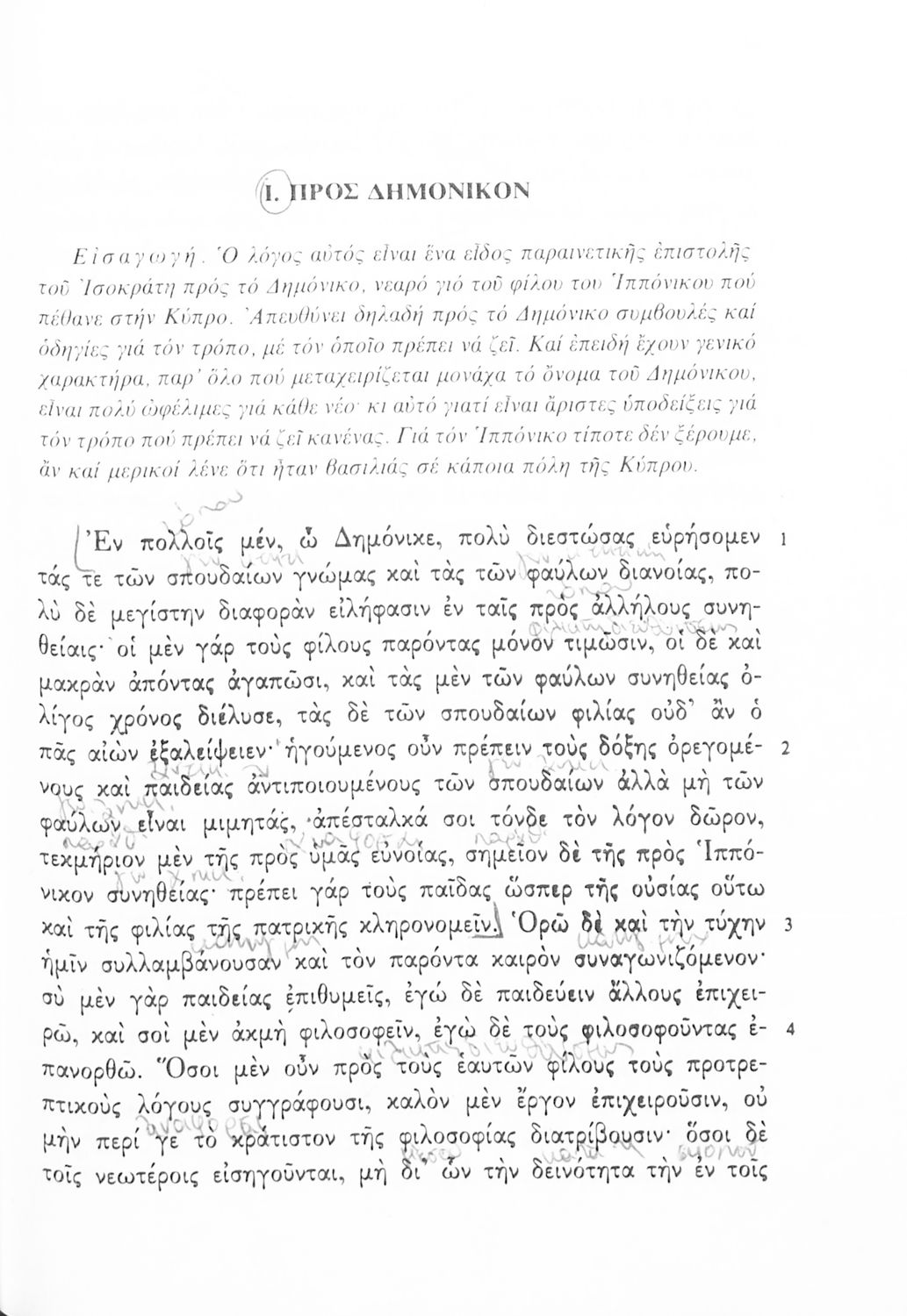 Σχολικό εγχειρίδιο Αρχαίων Ελληνικών Γ΄ Γυμνασίου που περιλαμβάνει εισαγωγή στη ζωή και το έργο του Ισοκράτη, τους Λόγους Προς Δημόνικον και Ευαγόρας και ερμηνευτικές σημειώσεις.