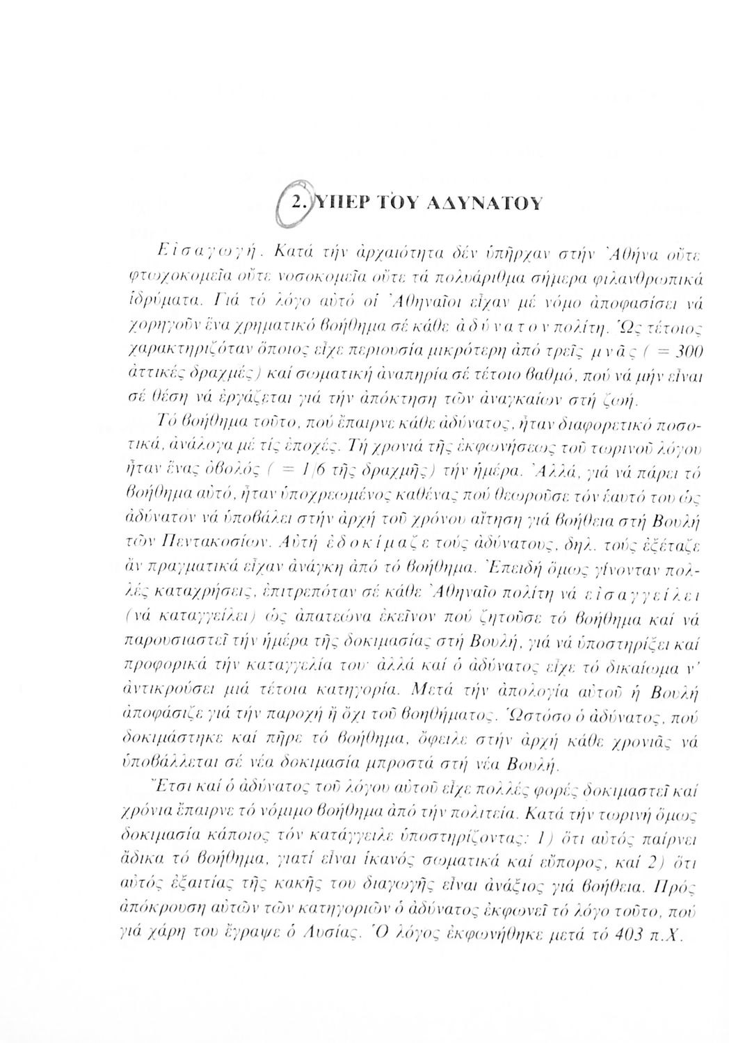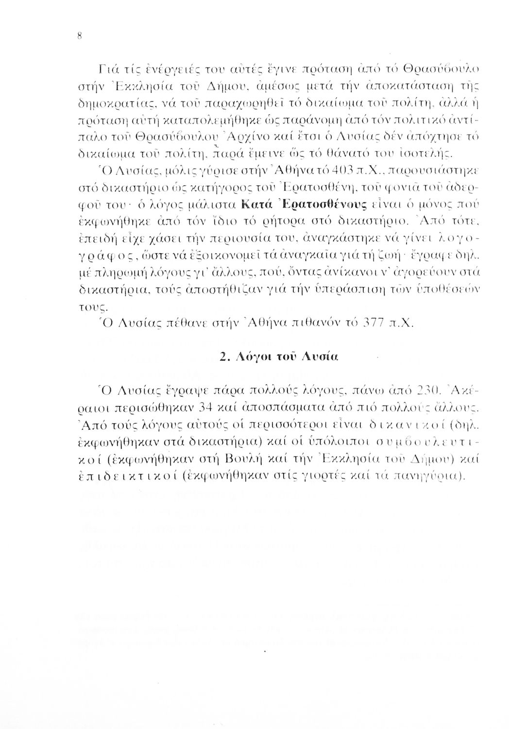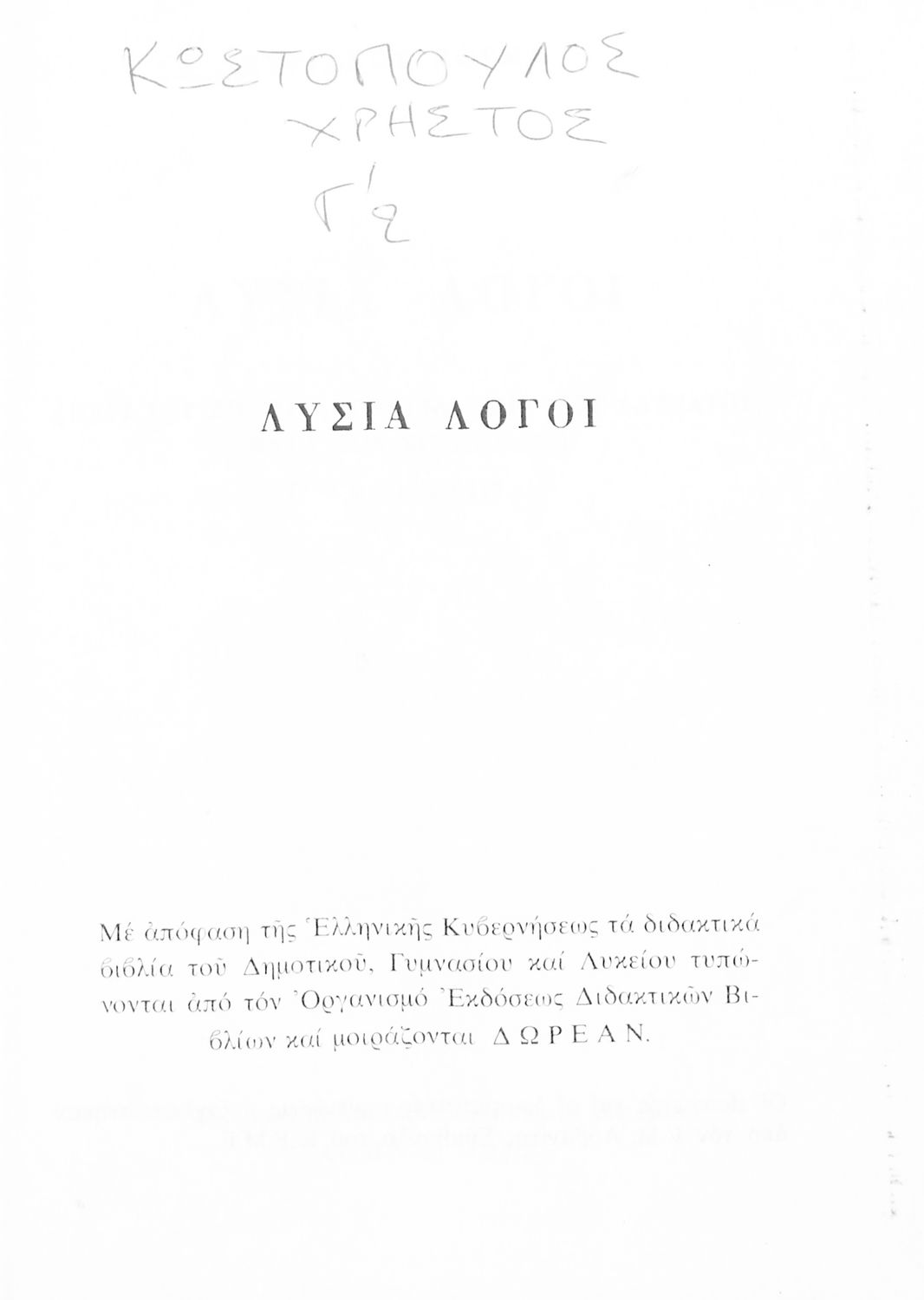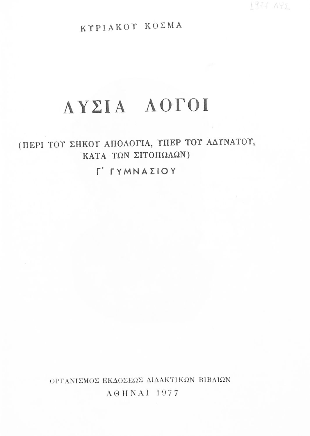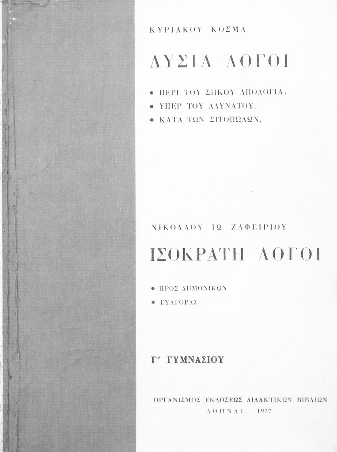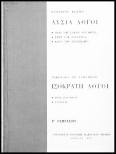 Σχολικό εγχειρίδιο Αρχαίων Ελληνικών Γ΄ Γυμνασίου που περιλαμβάνει τους Λόγους του Λυσία Περί του σηκού απολογία, Υπέρ του αδυνάτου, Κατά των σιτοπωλών και του Ισοκράτη Προς Δημόνικον, Προς Νικοκλέα και Ευαγόρας, εισαγωγή στους Λόγους και ερμηνευτικά σχόλια.