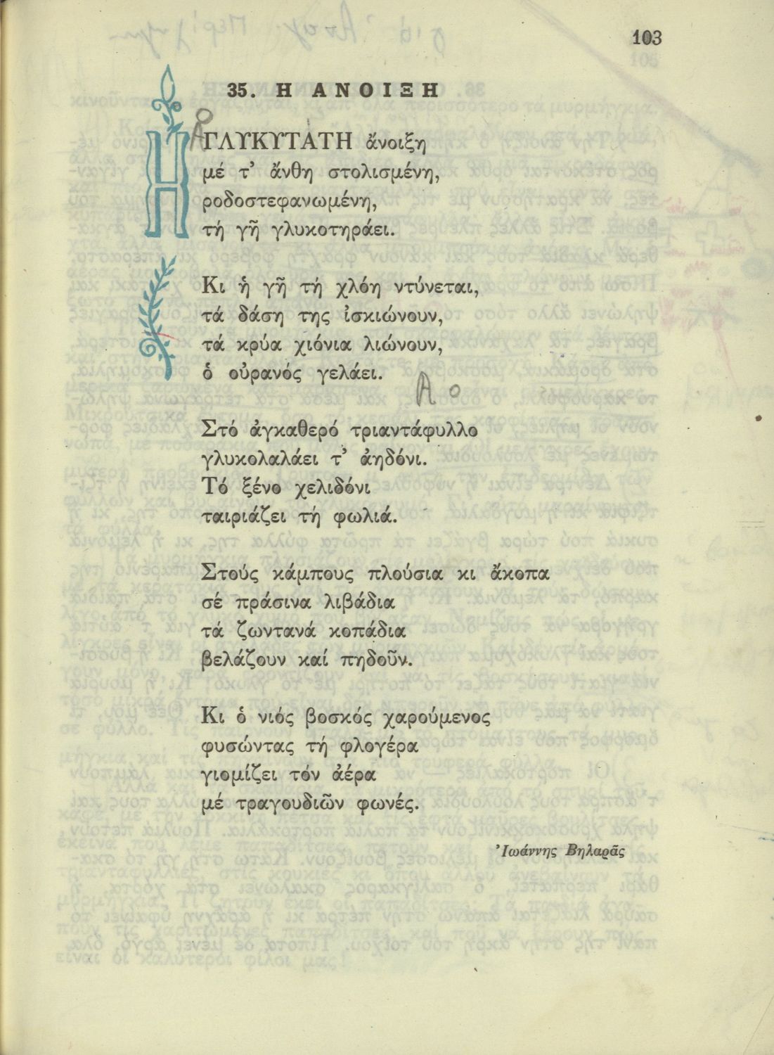 Αναγνωστικό Δ' Δημοτικού που είναι χωρισμένο σύμφωνα με τις εποχές του χρόνου και περιλαμβάνει κείμενα εμπνευσμένα από τη θρησκευτική, εθνική, κοινωνική και οικογενειακή ζωή και την ελληνική ιστορία και μυθολογία.