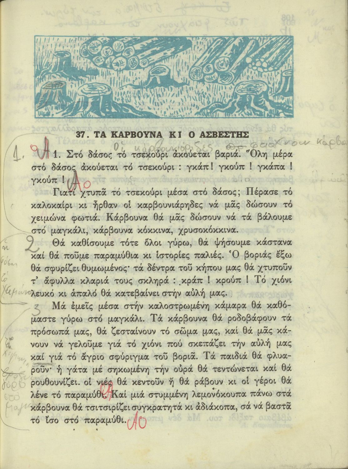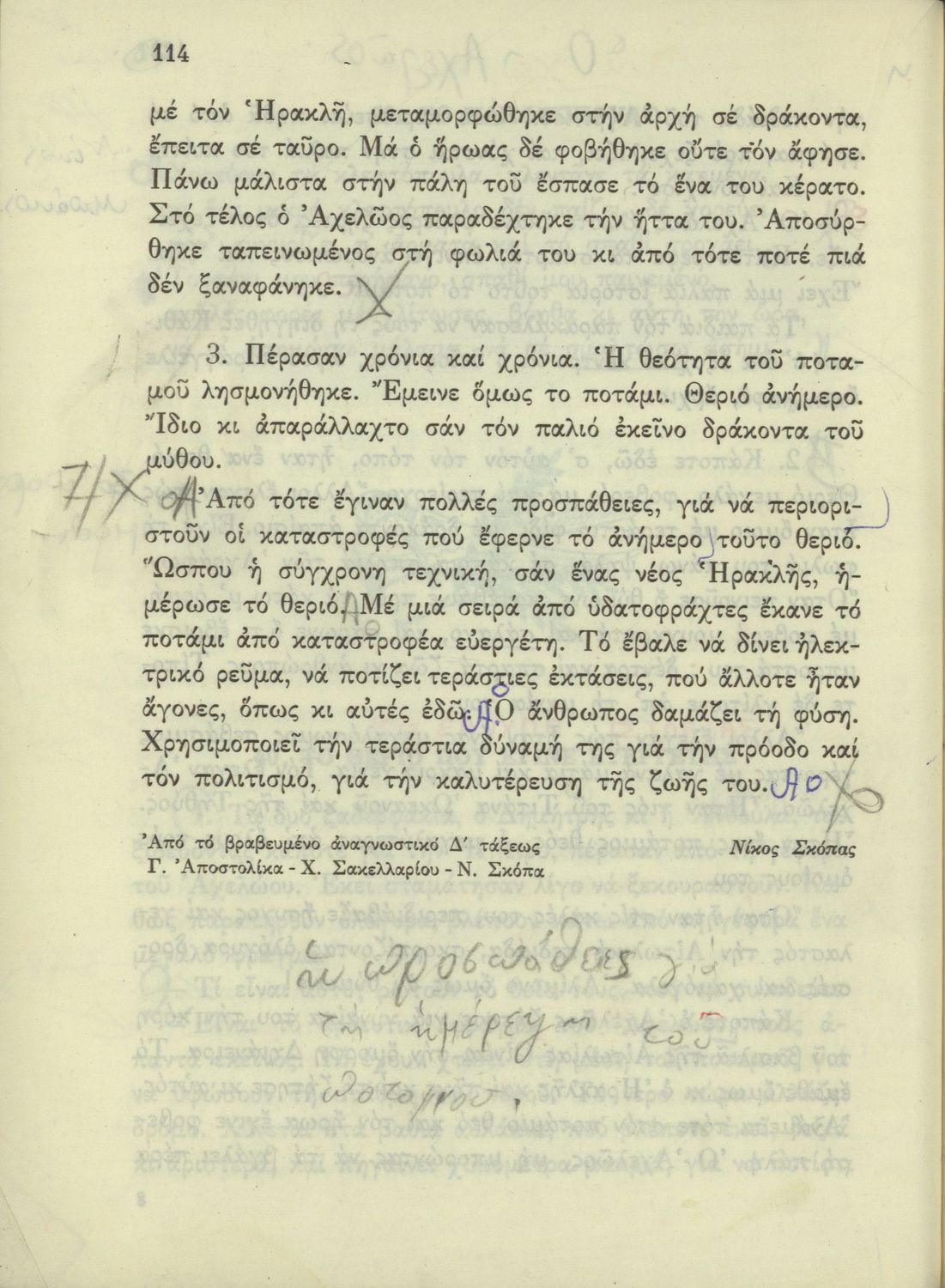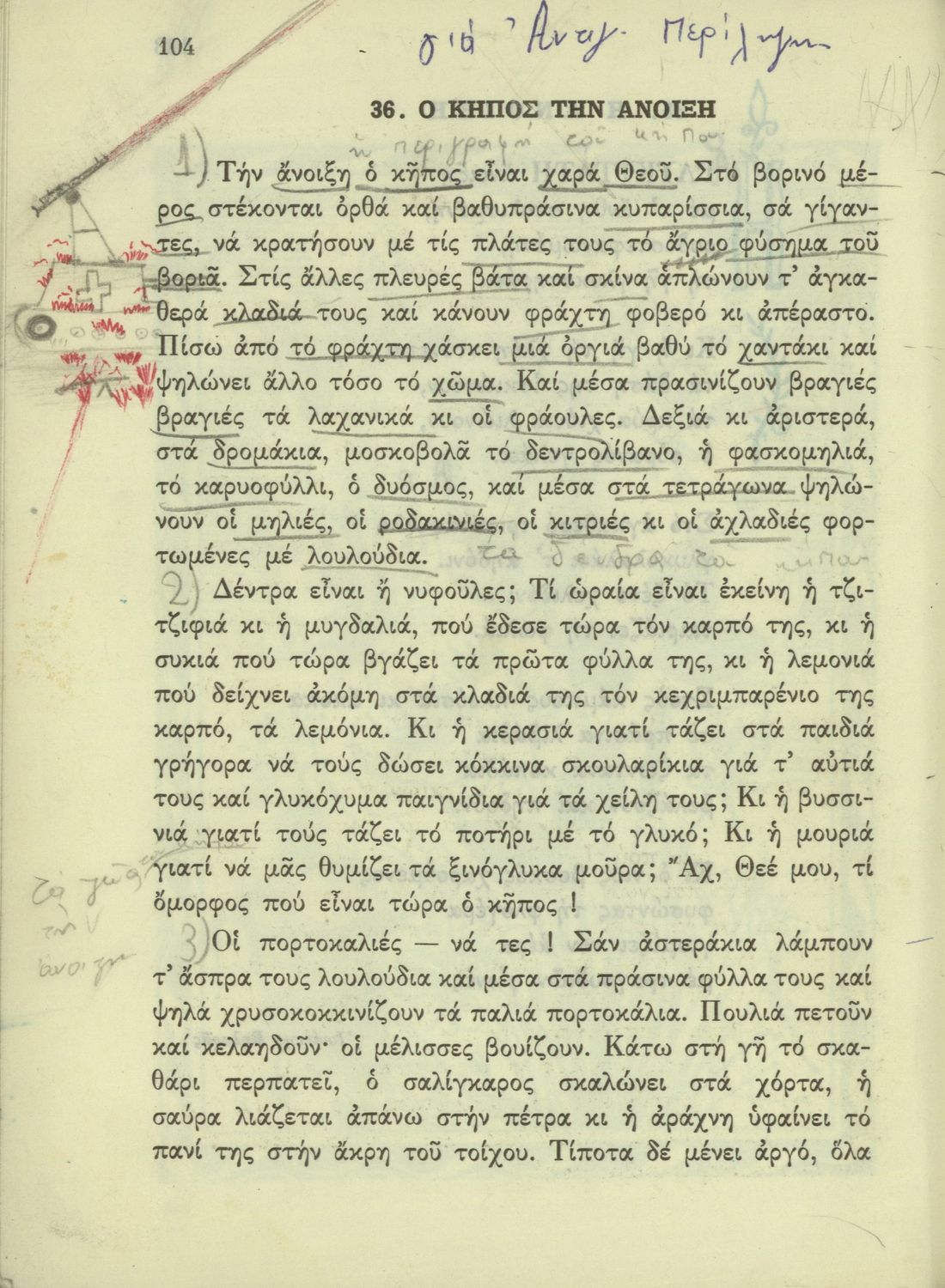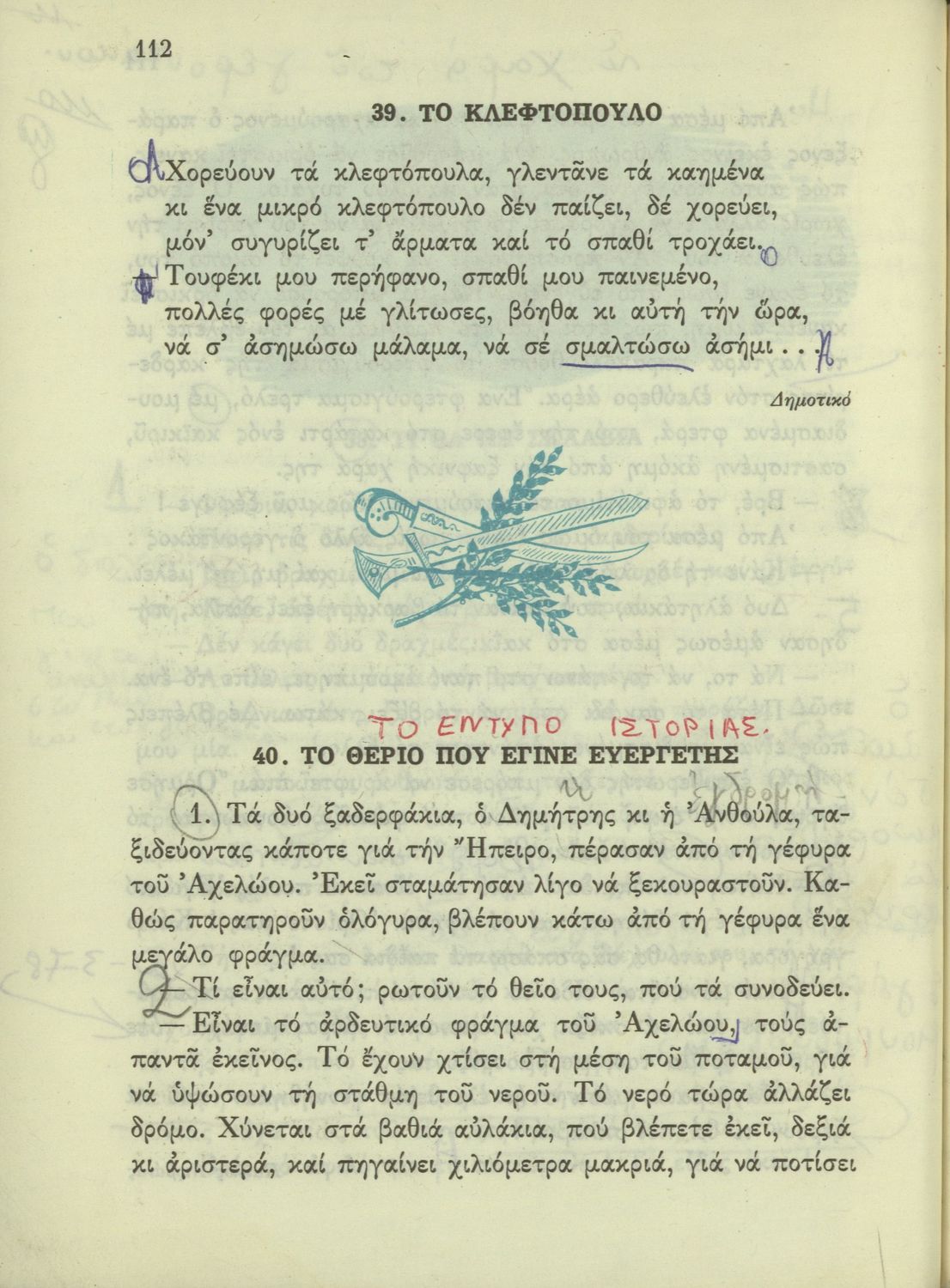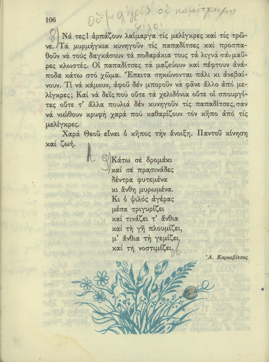 520 ## _aΑναγνωστικό Δ' Δημοτικού που είναι χωρισμένο σύμφωνα με τις εποχές του χρόνου και περιλαμβάνει κείμενα εμπνευσμένα από τη θρησκευτική, εθνική, κοινωνική και οικογενειακή ζωή και την ελληνική ιστορία και μυθολογία.