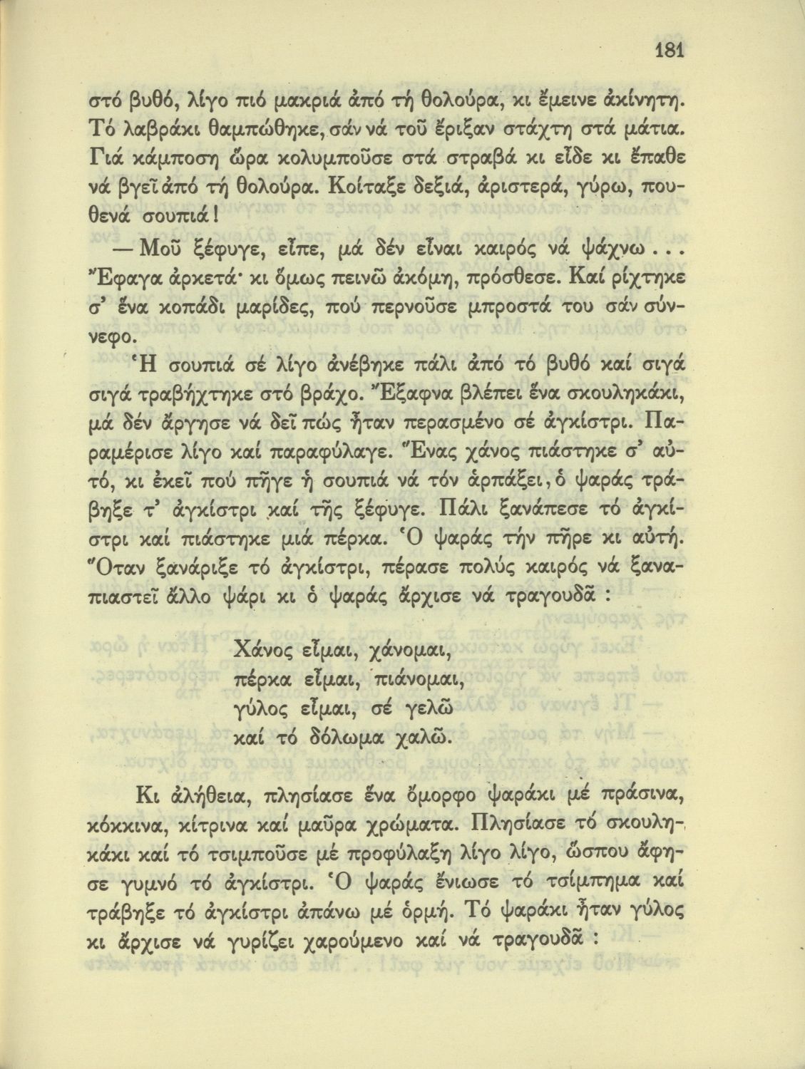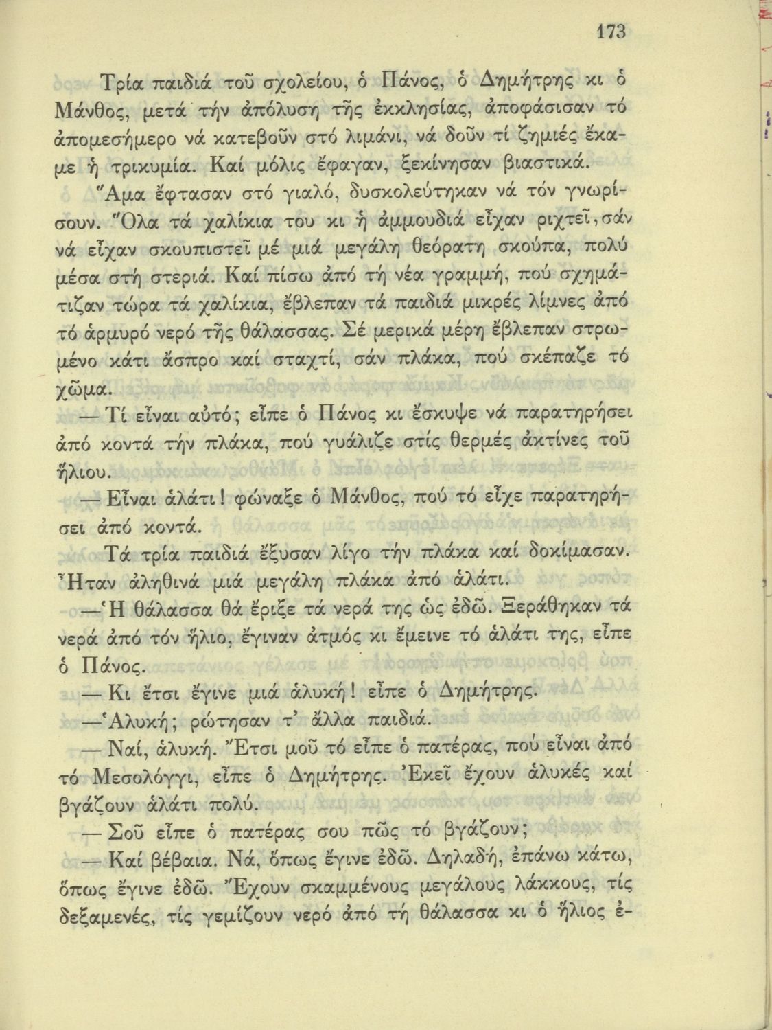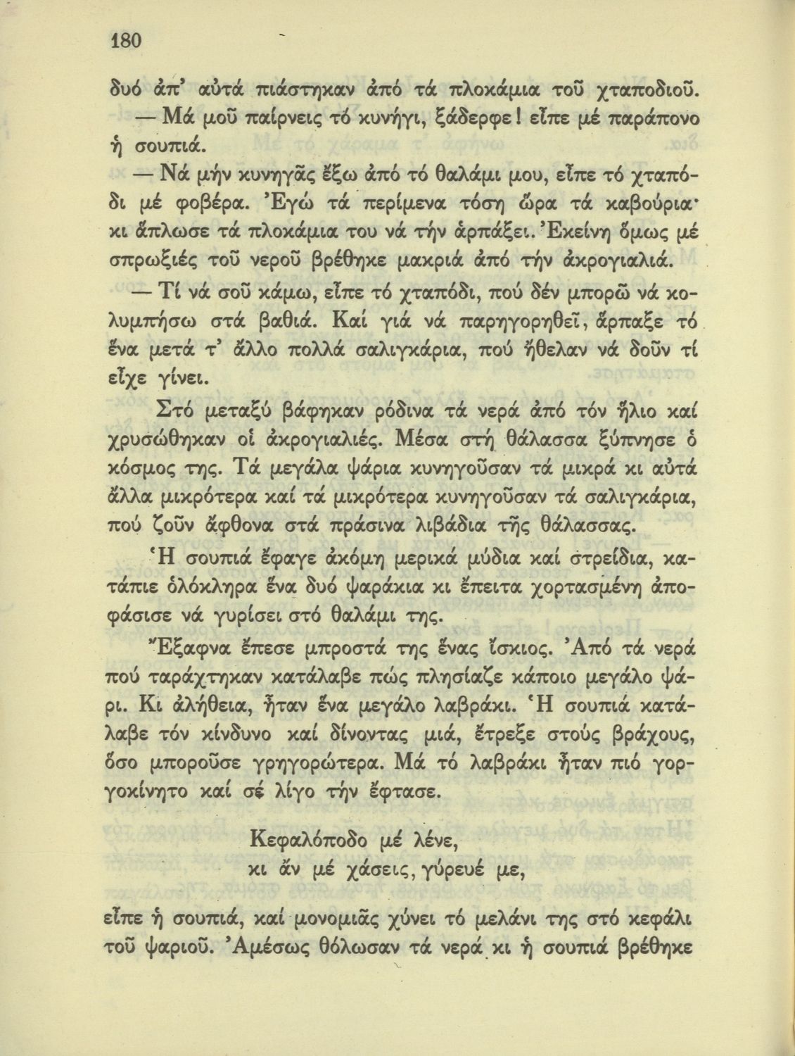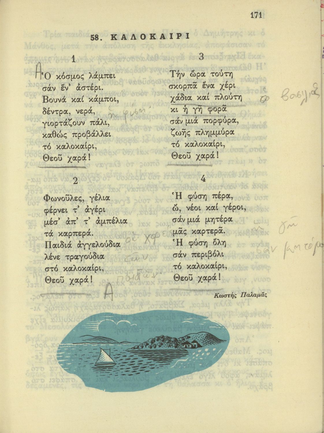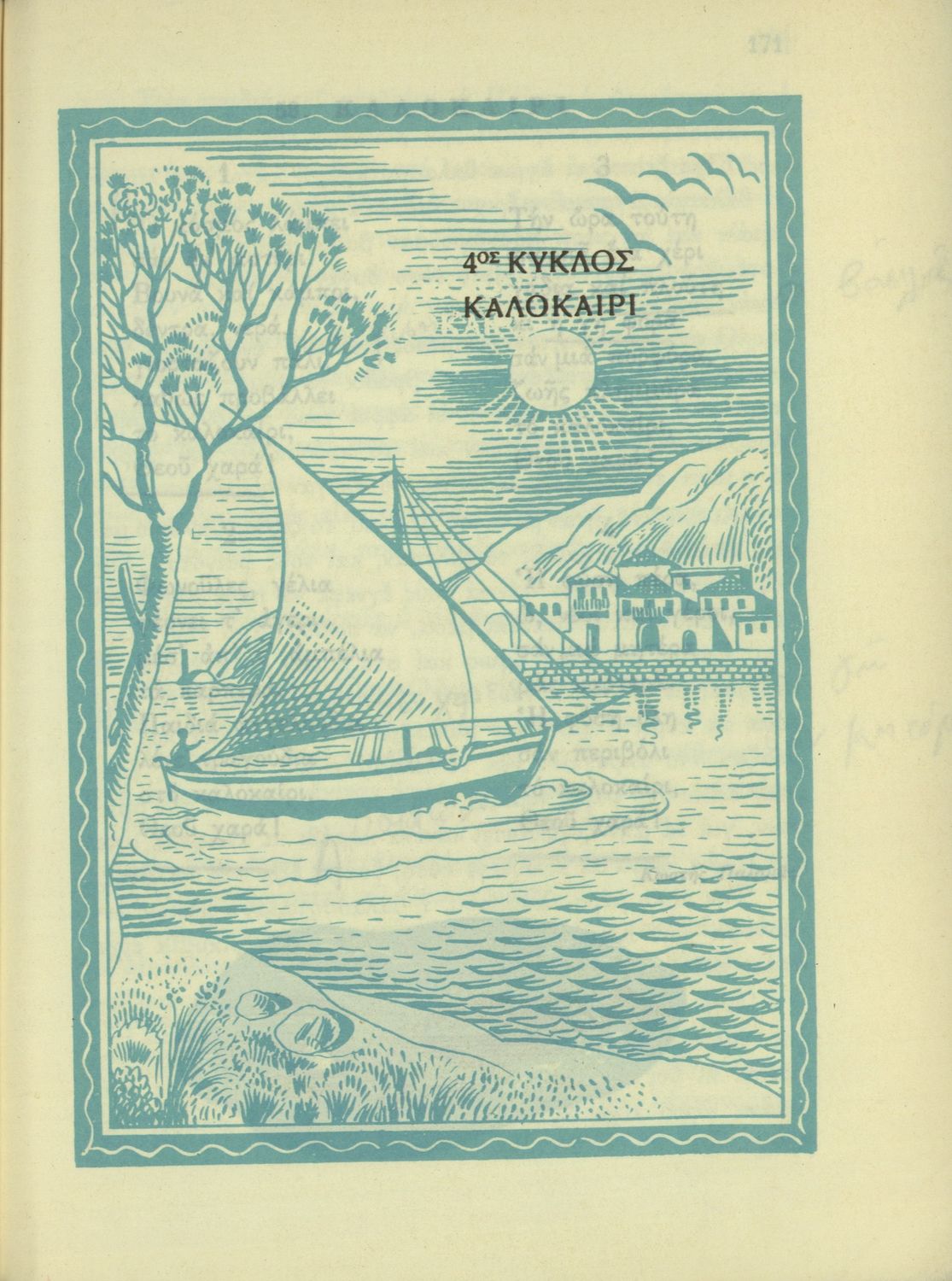 Αναγνωστικό για την Δ΄ τάξη του Δημοτικού. Περιλαμβάνει ένα κείμενο στο οποίο παρεμβάλλονται ποιήματα δημοτικά και Ελλήνων ποιητών.