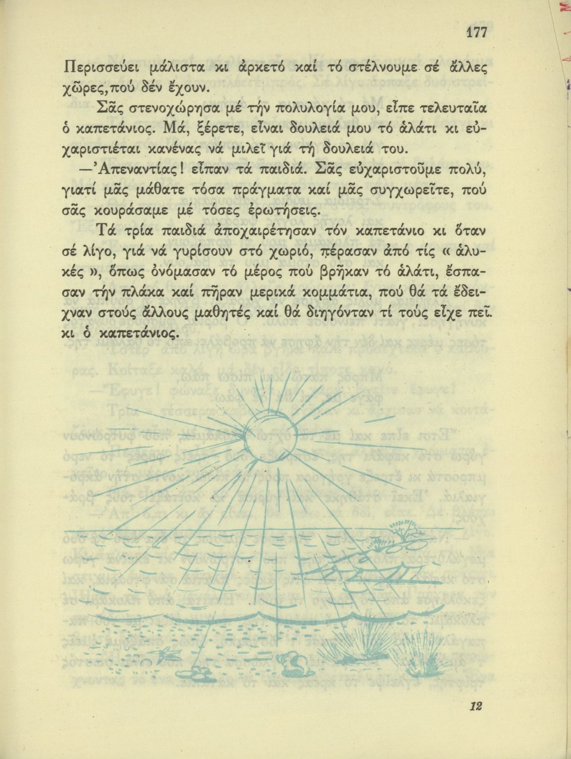 Αναγνωστικό Δ΄ Δημοτικού που περιέχει πεζά και ποιήματα με περιεχόμενο διδακτικό και ηθικοπλαστικό εμπνευσμένα από την ελληνική ιστορία και μυθολογία, και την αγροτική και κοινωνική ζωή.