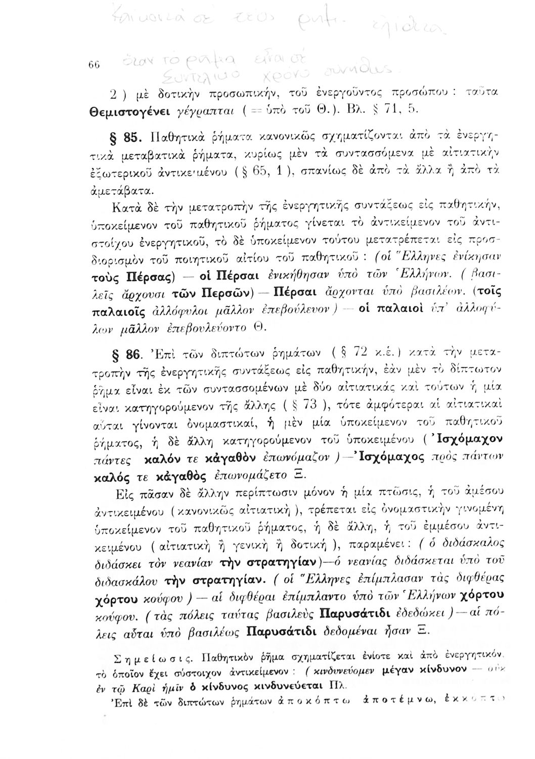Βαθμίδα εκπαίδευσης: Δευτεροβάθμια Τάξη: Γ' Γυμνασίου / Α' Λυκείου Μάθημα: Αρχαία Ελληνικά Γλώσσα: Καθαρεύουσα Παρουσίαση περιεχομένου: Σχολικό εγχειρίδιο Αρχαίων Ελληνικών Γ΄ Γυμνασίου και Α΄ Λυκείου που εξετάζει τα μέρη του λόγου και την σύνταξή τους. |