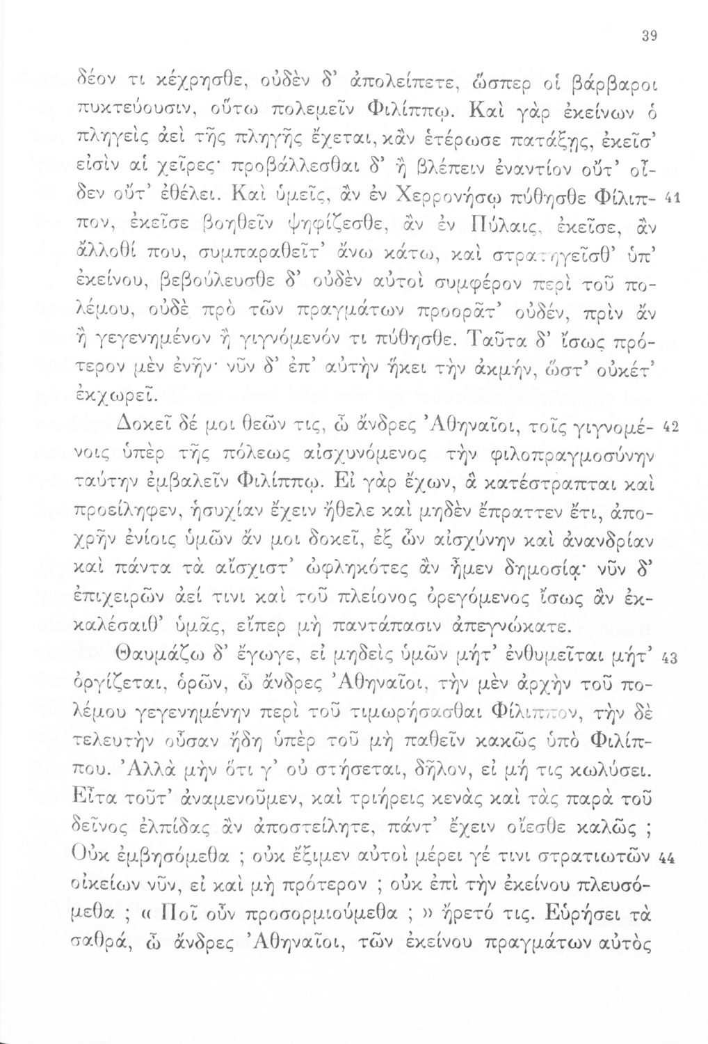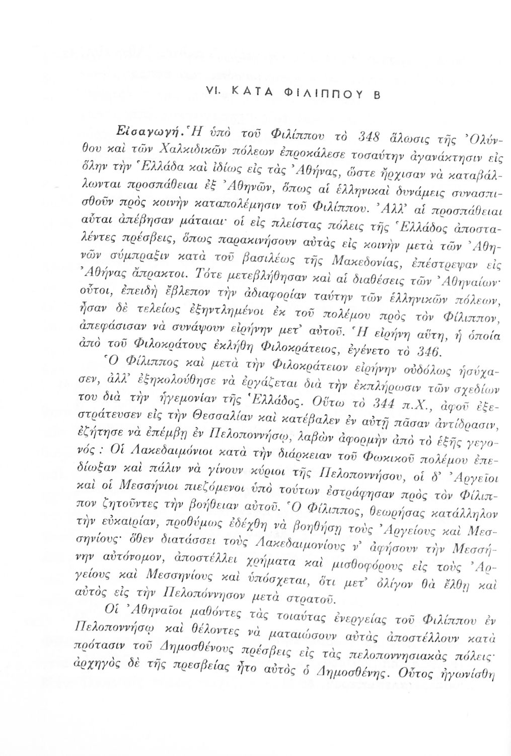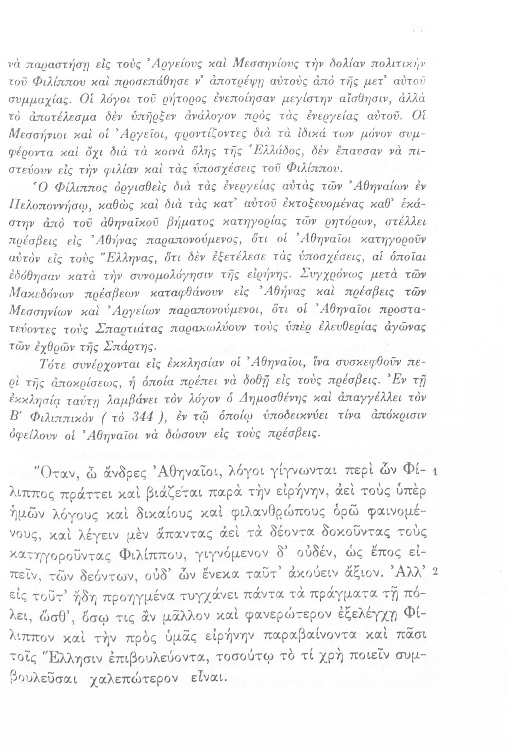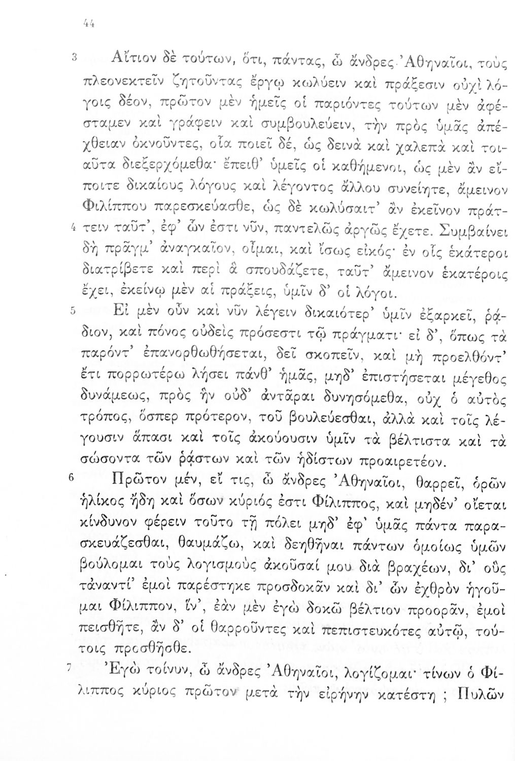 Σχολικό εγχειρίδιο Αρχαίων Ελληνικών Δ΄ Γυμνασίου που περιλαμβάνει εισαγωγή στη ζωή και στο έργο του Δημοσθένη, τον Α΄ κατά Φιλίππου, και τους Α΄ και Β΄ Ολυνθιακούς και ερμηνευτικά και ετυμολογικά σχόλια.