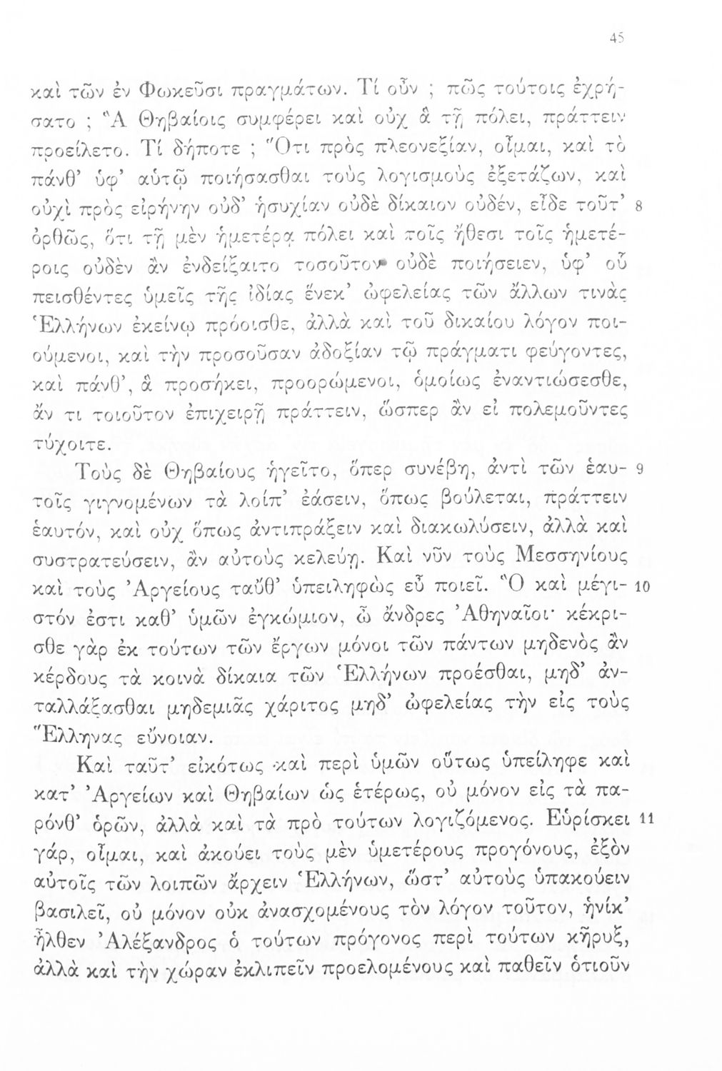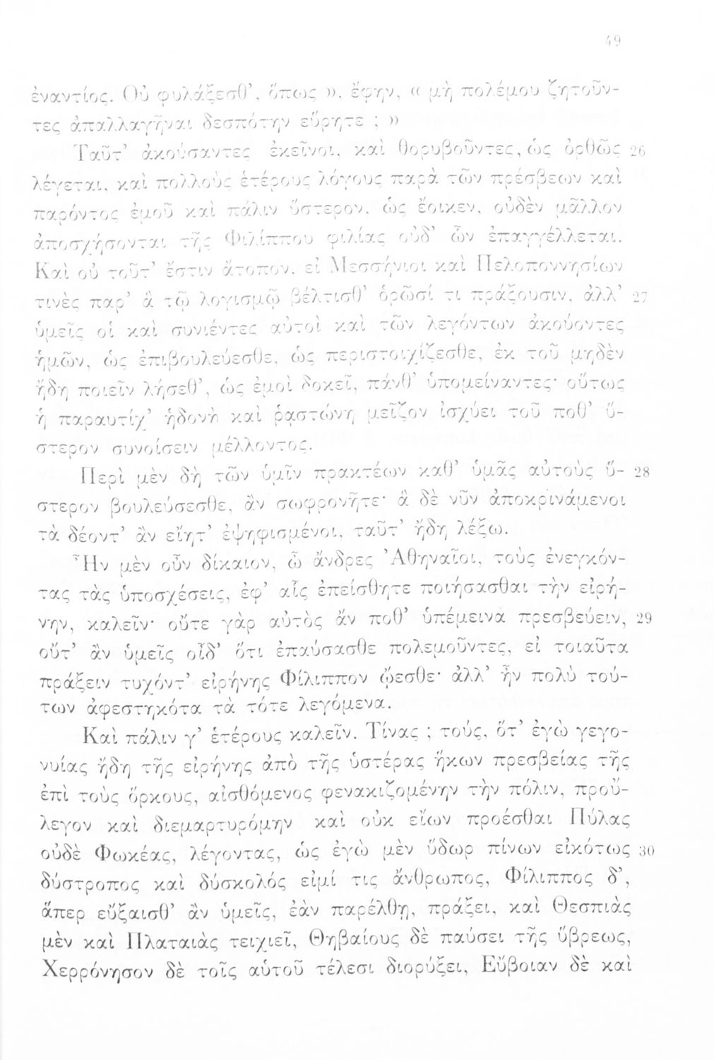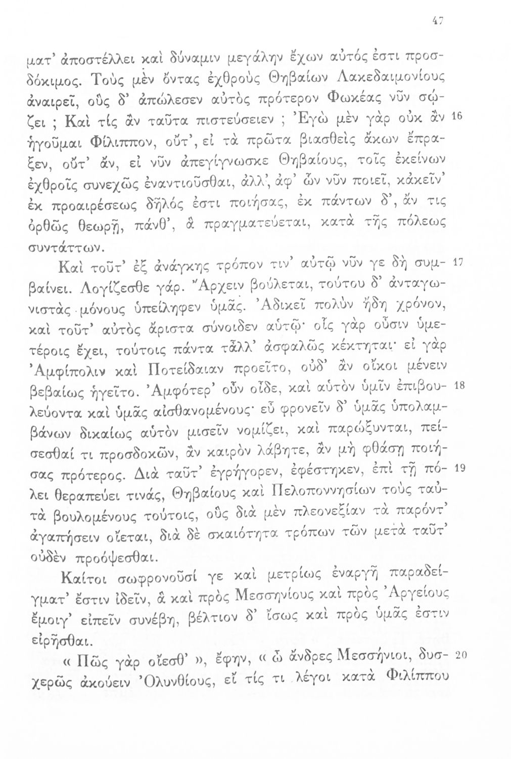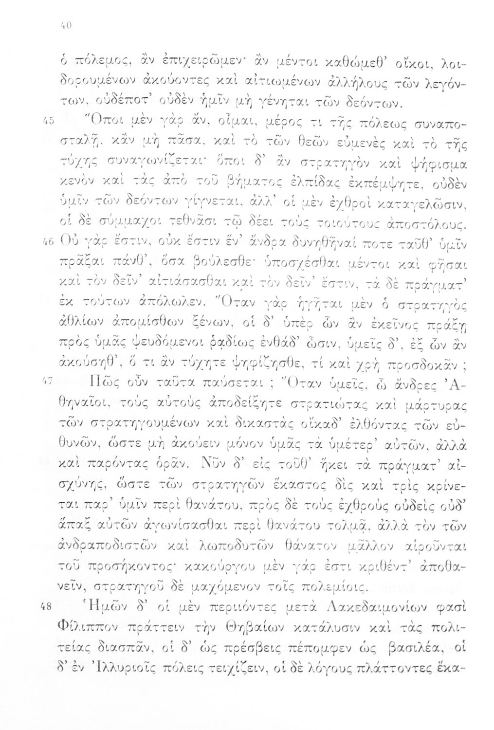 Σχολικό εγχειρίδιο Αρχαίων Ελληνικών Δ΄ Γυμνασίου που περιλαμβάνει εισαγωγή στη ζωή και στο έργο του Δημοσθένη, τον Α΄ κατά Φιλίππου, και τους Α΄ και Β΄ Ολυνθιακούς και ερμηνευτικά και ετυμολογικά σχόλια.