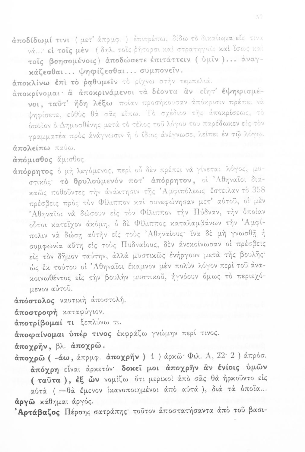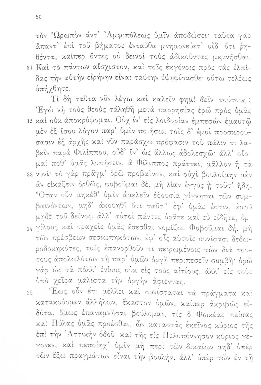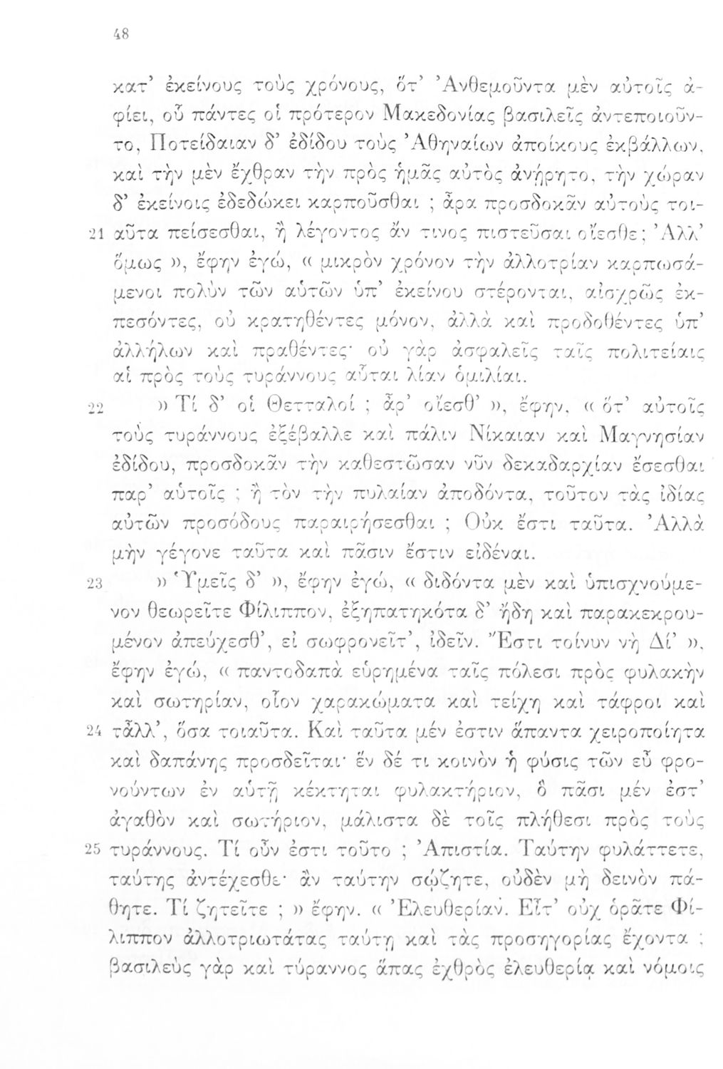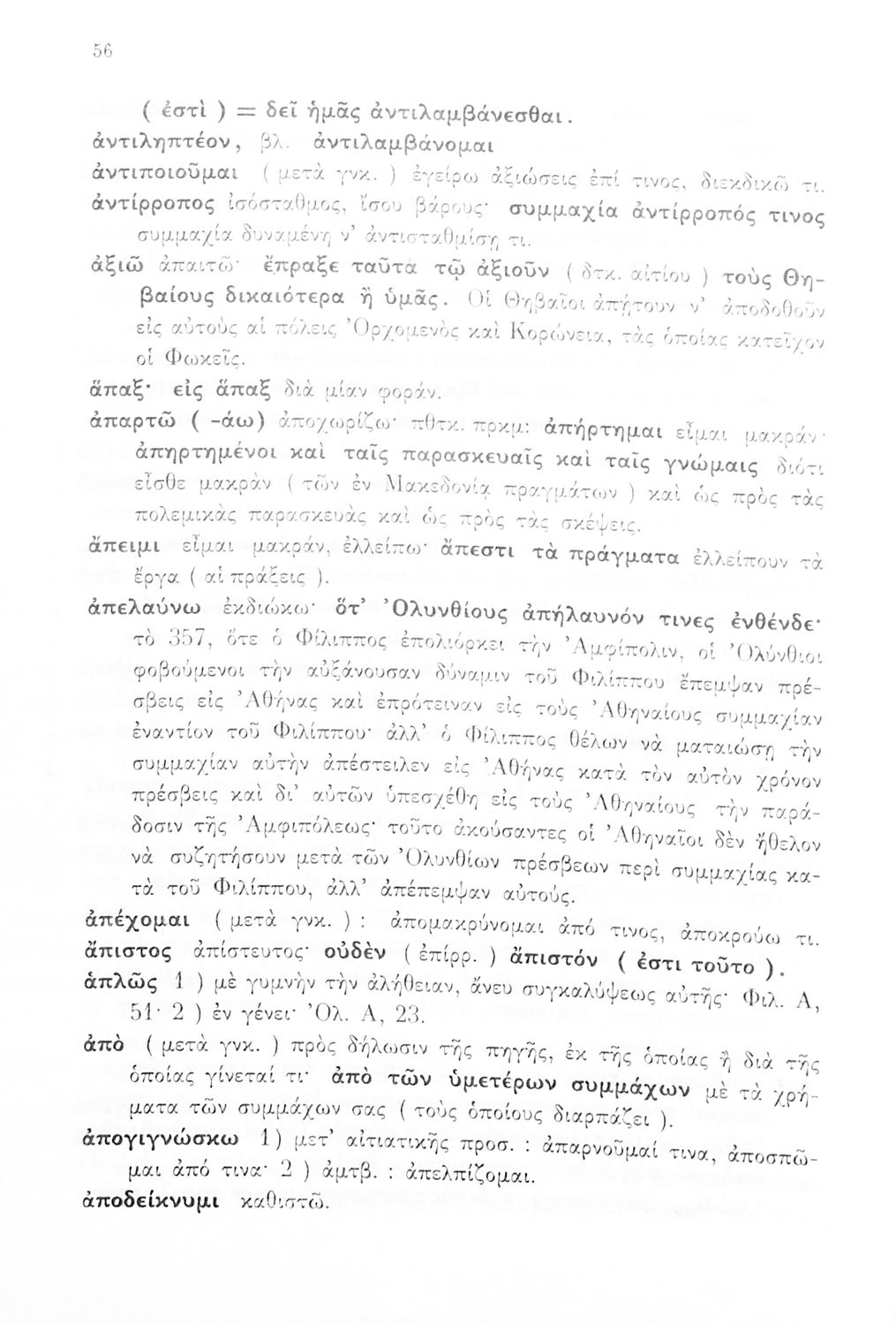 Σχολικό εγχειρίδιο Αρχαίων Ελληνικών Δ΄ Γυμνασίου που περιλαμβάνει εισαγωγή στη ζωή και στο έργο του Δημοσθένη, τον Α΄ κατά Φιλίππου, και τους Α΄ και Β΄ Ολυνθιακούς και ερμηνευτικά και ετυμολογικά σχόλια.