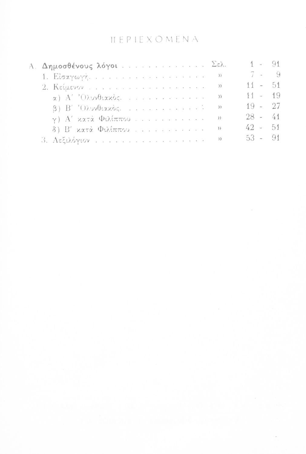Σχολικό εγχειρίδιο Αρχαίων Ελληνικών Δ΄ Γυμνασίου που περιλαμβάνει τους Ολυνθιακούς Α΄ και Β΄ και τους Φιλιππικούς Α΄ και Β' του Δημοσθένη, εισαγωγή και ερμηνευτικά σχόλια. Φέρει το σύμβολο της δικτατορίας.