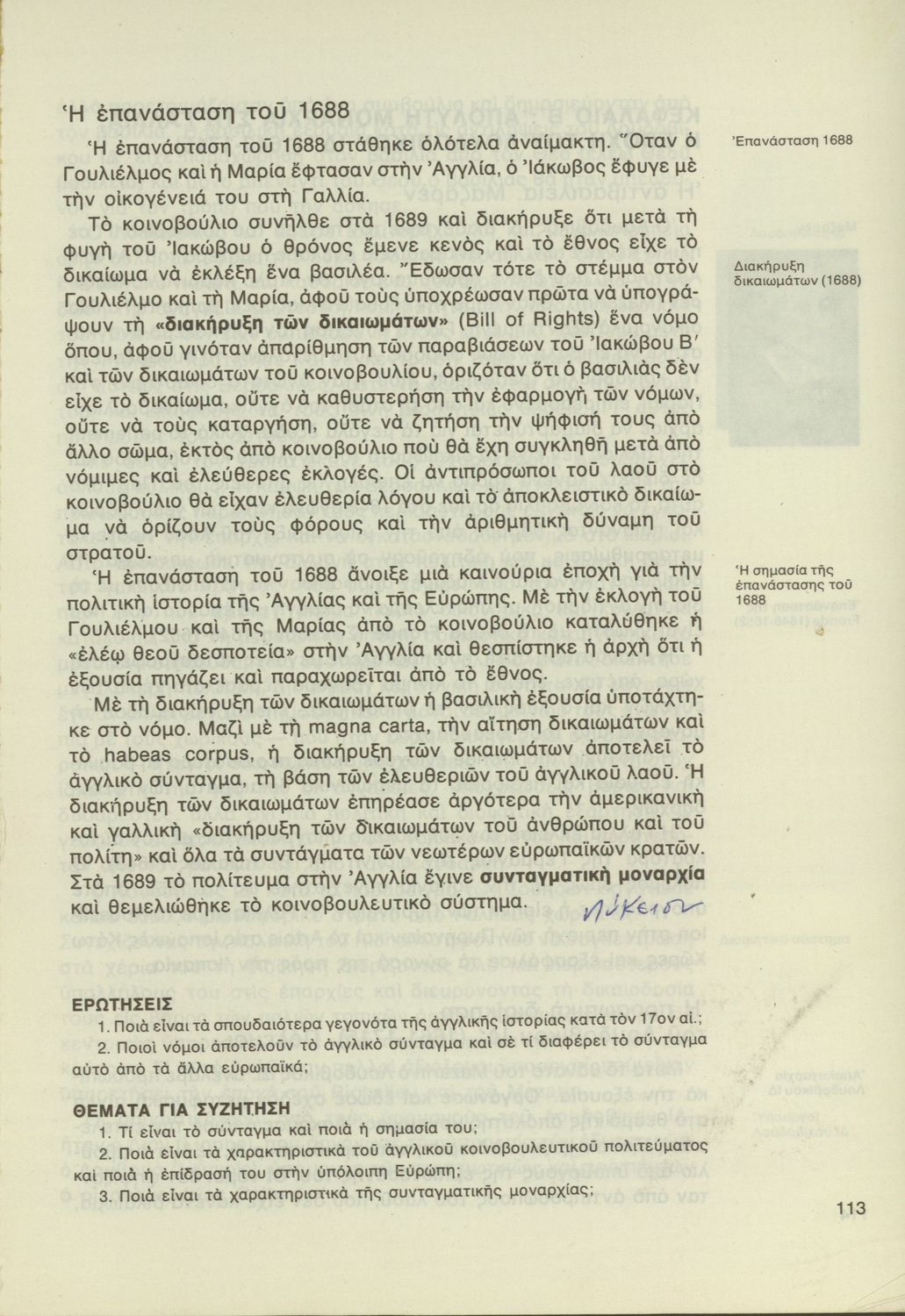 Σχολικό εγχειρίδιο της Γ΄ Γυμνασίου για το μάθημα της Ιστορίας. Αναφέρεται στα ιστορικά γεγονότα στην Ευρώπη την περίοδο της Αναγέννησης και του Διαφωτισμού και στη δημιουργία των εθνών κρατών. Έπειτα επικεντρώνεται στην ελληνική ιστορία, παρουσιάζοντας την Ελληνική Επανάσταση και τη διοίκηση του ελληνικού κράτους. Καλύπτει τα γεγονότα του Α΄ Παγκοσμίου Πολέμου και πολύ συνοπτικά αναφέρεται στον Β΄ Παγκόσμιο και τα μεταπολεμικά χρόνια. Στο τέλος περιλαμβάνει αποσπάσματα από πηγές.