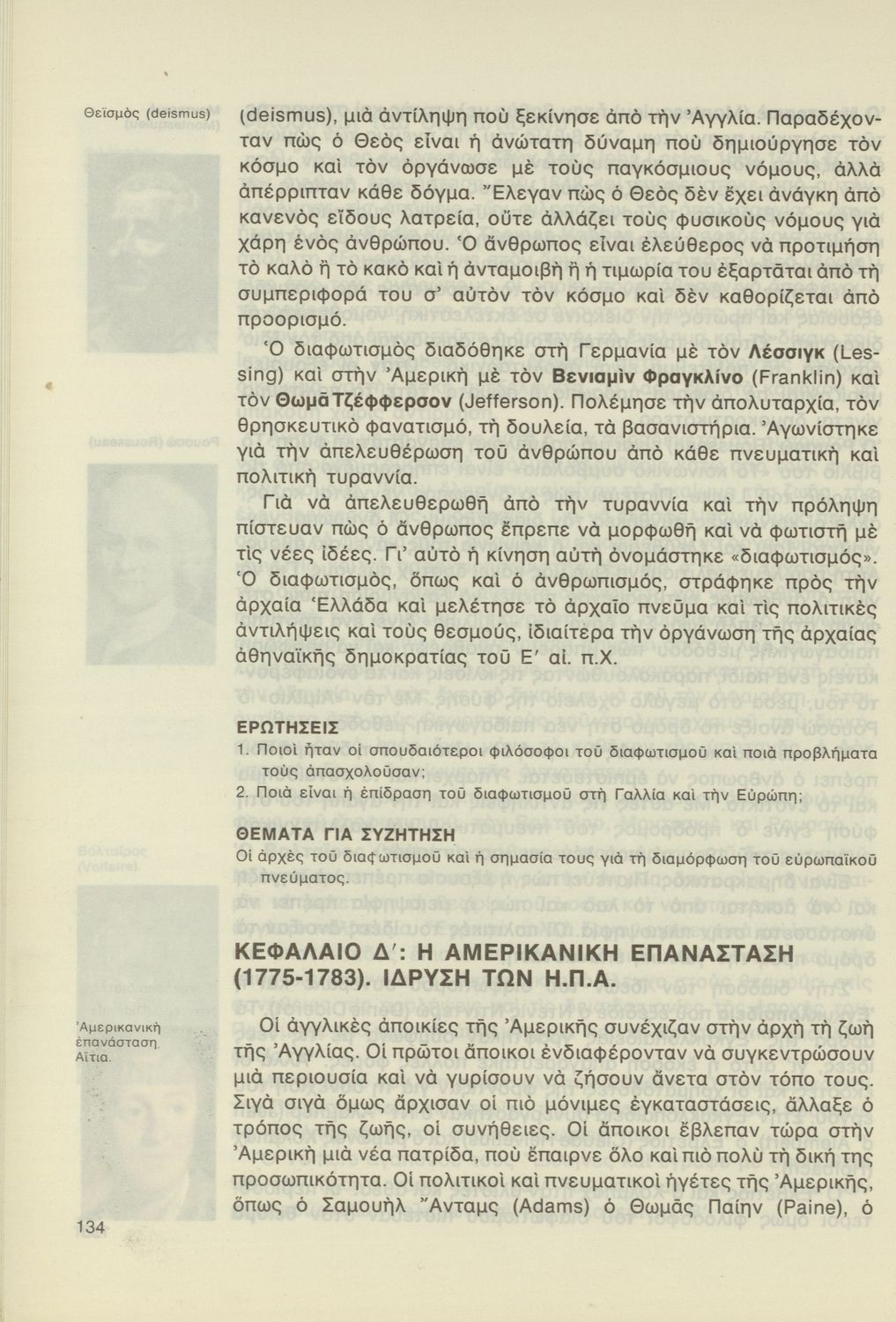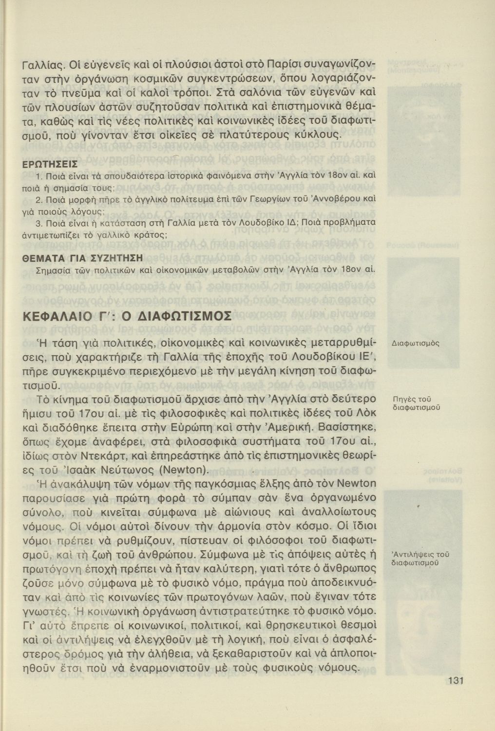 Σχολικό εγχειρίδιο της Γ΄ Γυμνασίου για το μάθημα της Ιστορίας. Αναφέρεται στα ιστορικά γεγονότα στην Ευρώπη την περίοδο της Αναγέννησης και του Διαφωτισμού και στη δημιουργία των εθνών κρατών. Έπειτα επικεντρώνεται στην ελληνική ιστορία, παρουσιάζοντας την Ελληνική Επανάσταση και τη διοίκηση του ελληνικού κράτους. Καλύπτει τα γεγονότα του Α΄ Παγκοσμίου Πολέμου και πολύ συνοπτικά αναφέρεται στον Β΄ Παγκόσμιο και τα μεταπολεμικά χρόνια. Στο τέλος περιλαμβάνει αποσπάσματα από πηγές.