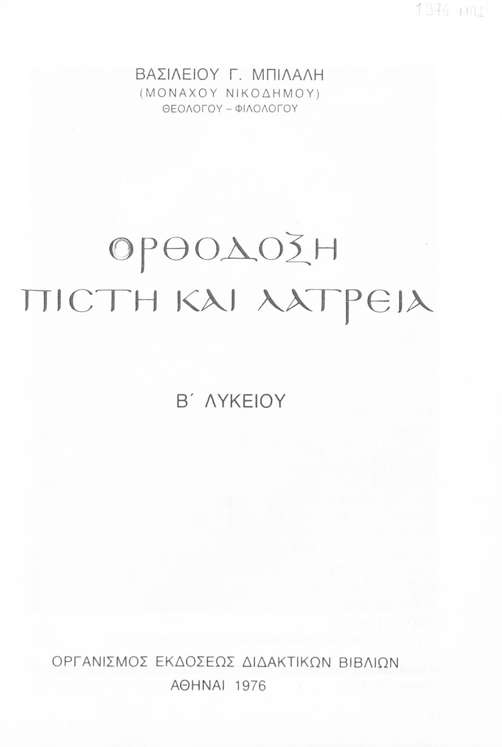 Κωδικός αναγνώρισης: 02-00476 Τίτλος: Ορθόδοξη πίστη και λατρεία Β΄ Λυκείου Συγγραφέας: Βασίλειος Γ. Μπιλάλης Μέγεθος και υπόστρωμα: Σχολικό εγχειρίδιο, μαλακό εξώφυλλο, 260 σελίδες. Σκίτσα (ασπρόμαυρα), εικόνες (ασπρόμαυρες). |