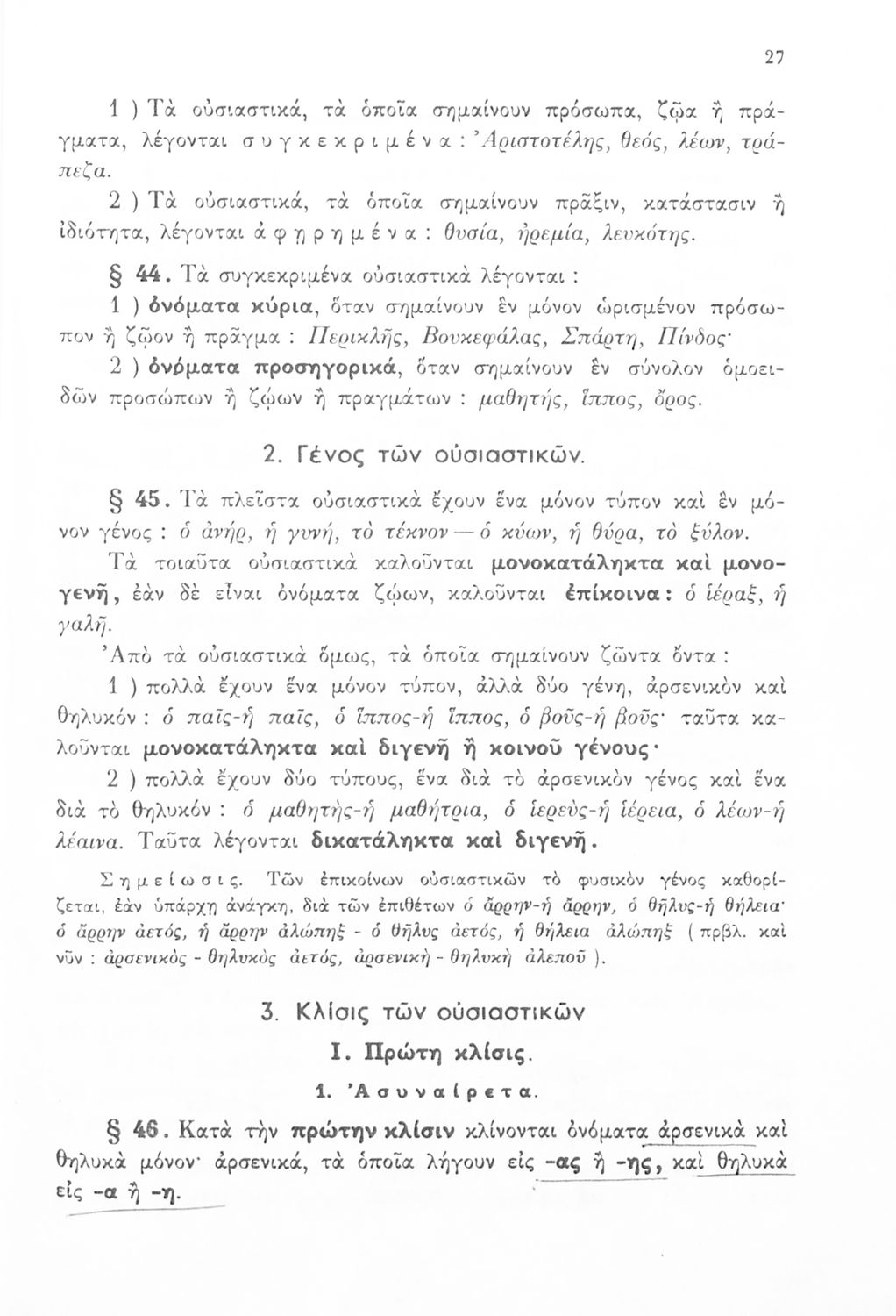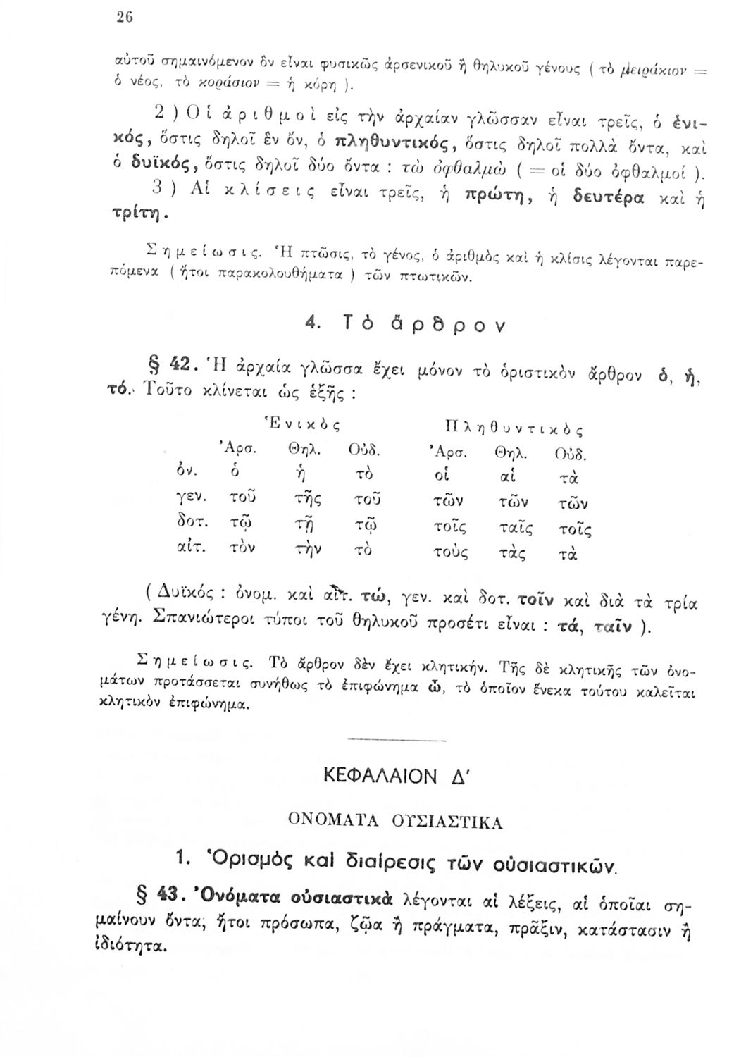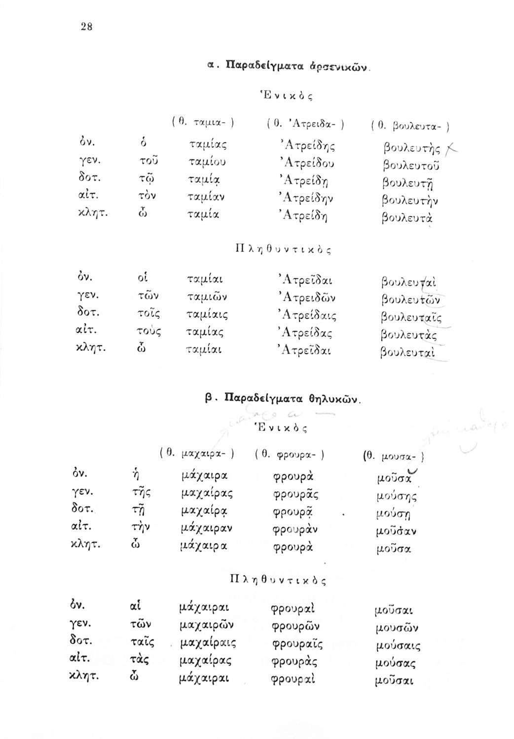 Γραμματική Αρχαίων Ελληνικών της Α΄, Β΄, Γ΄ και Δ΄ Γυμνασίου το οποίο εστιάζει στα μέρη του λόγου και στην σύνταξή τους και είναι χωρισμένο σε φθογγολογικό και τυπολογικό μέρος.
