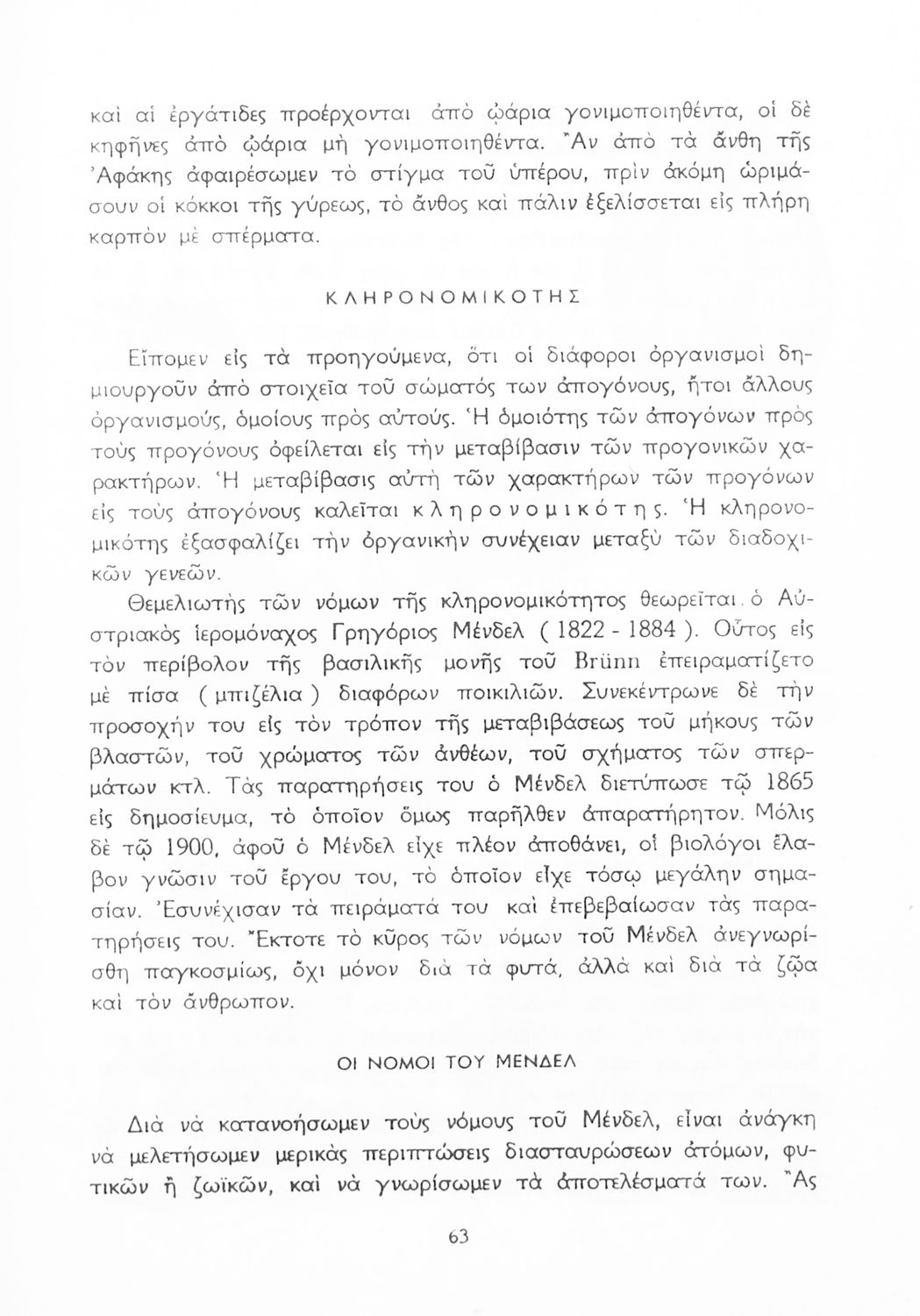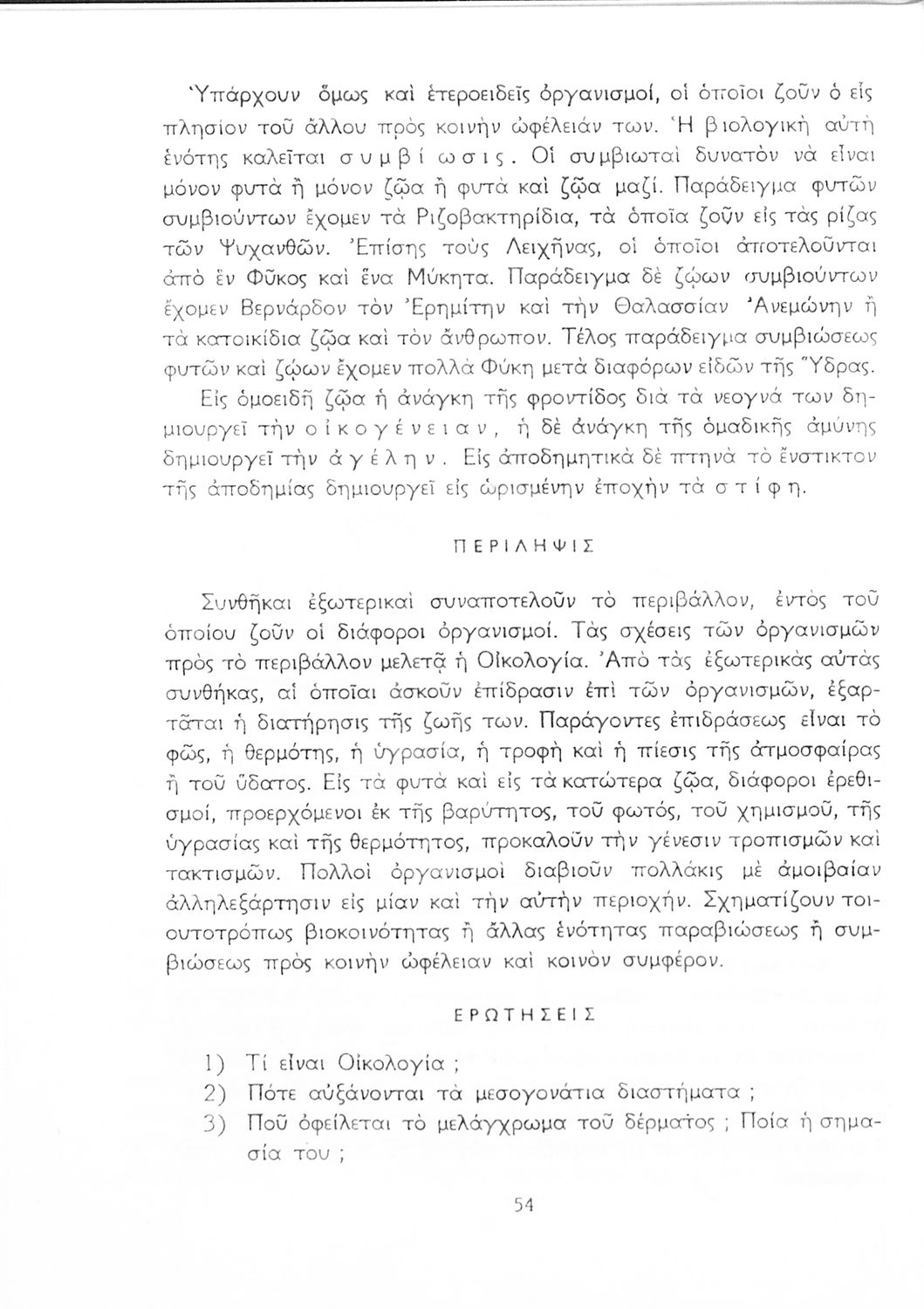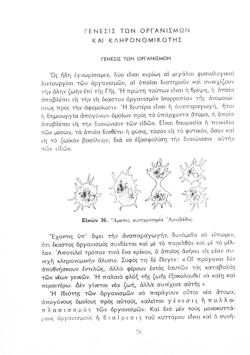 Σχολικό εγχειρίδιο Βιολογίας για τους μαθητές της Γ΄ Γυμνασίου. Περιέχει μια γενική επισκόπηση της Βιολογίας αρχίζοντας με τα βασικά δομικά στοιχεία κάθε οργανισμού, τα ανόργανα και οργανικά σώματα και τα γνωρίσματά τους, τις συνθήκες στις οποίες αναπτύσσονται και εξελίσσονται οι μορφές ζωής, όπως θερμότητα, πίεση, υγρασία. Τέλος το βιβλίο ασχολείται με ζητήματα κληρονομικότητας και την έννοια της εξέλιξης.