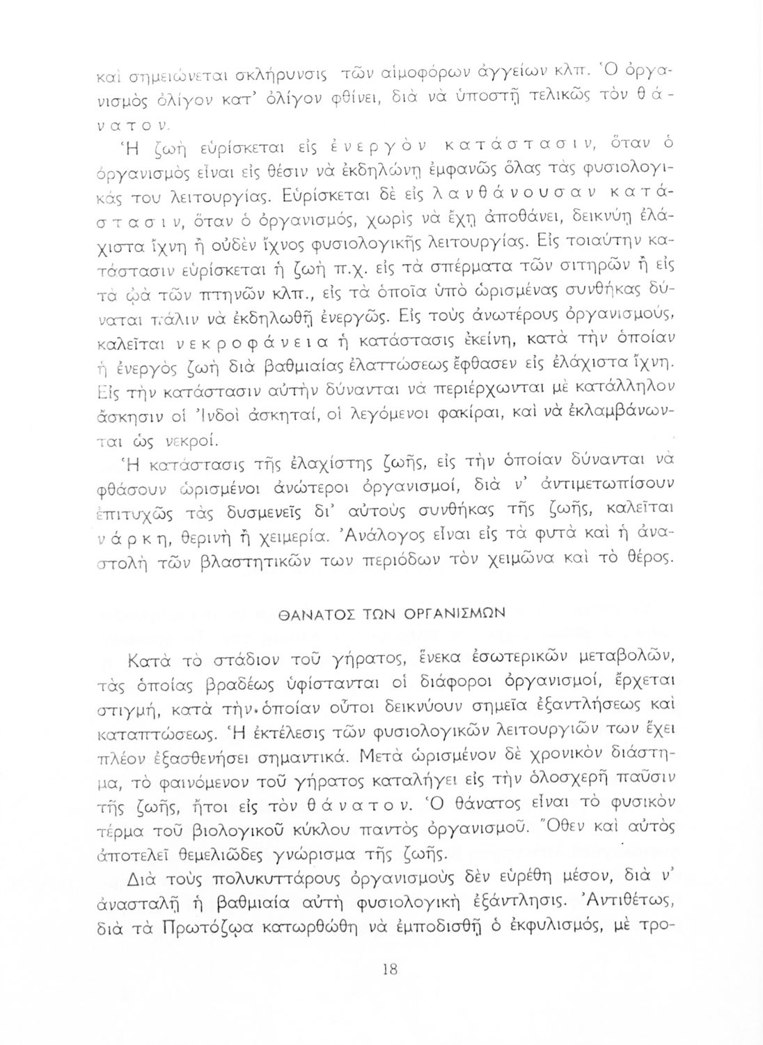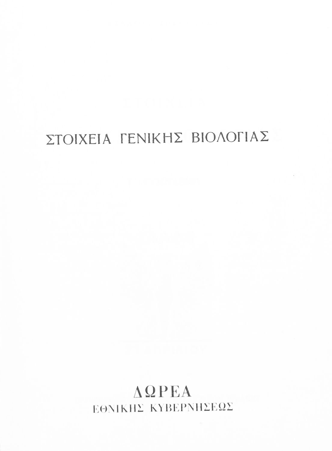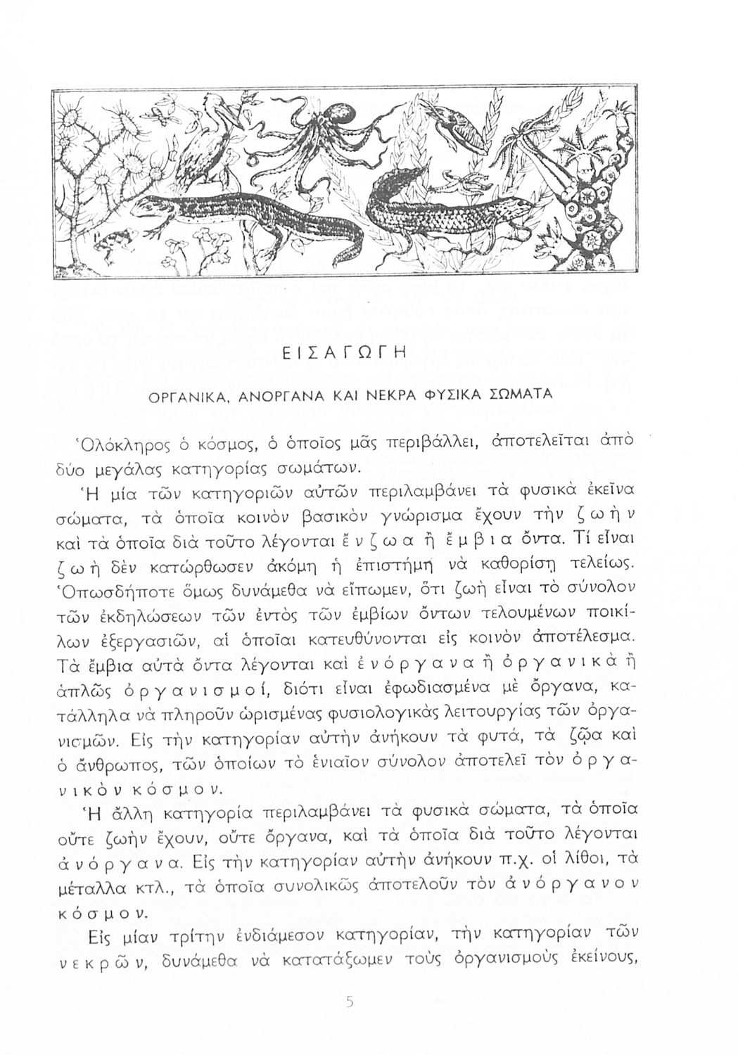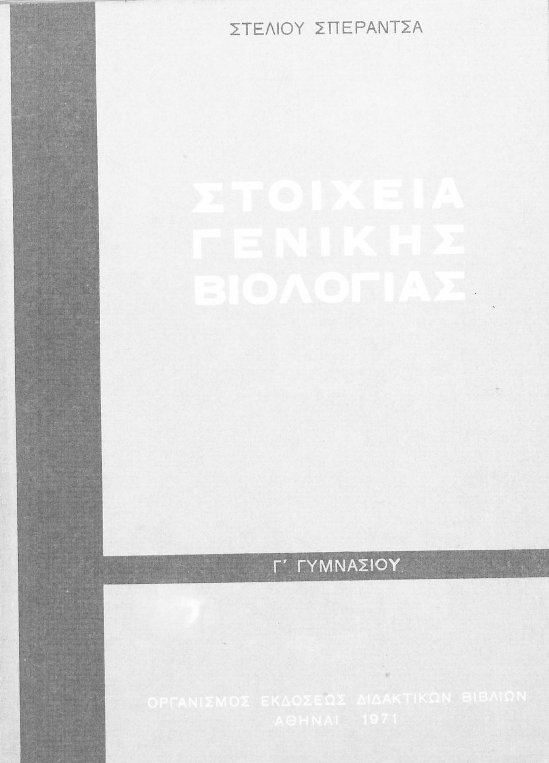 Σχολικό εγχειρίδιο Βιολογίας Δ΄ Γυμνασίου που εστιάζει στις συνθήκες γέννησης, μεταβολής και θανάτου των έμβιων οργανισμών. Ο συγγραφέας ήταν καθηγητής της γενικής Βιολογίας στο Πανεπιστήμιο Αθηνών.