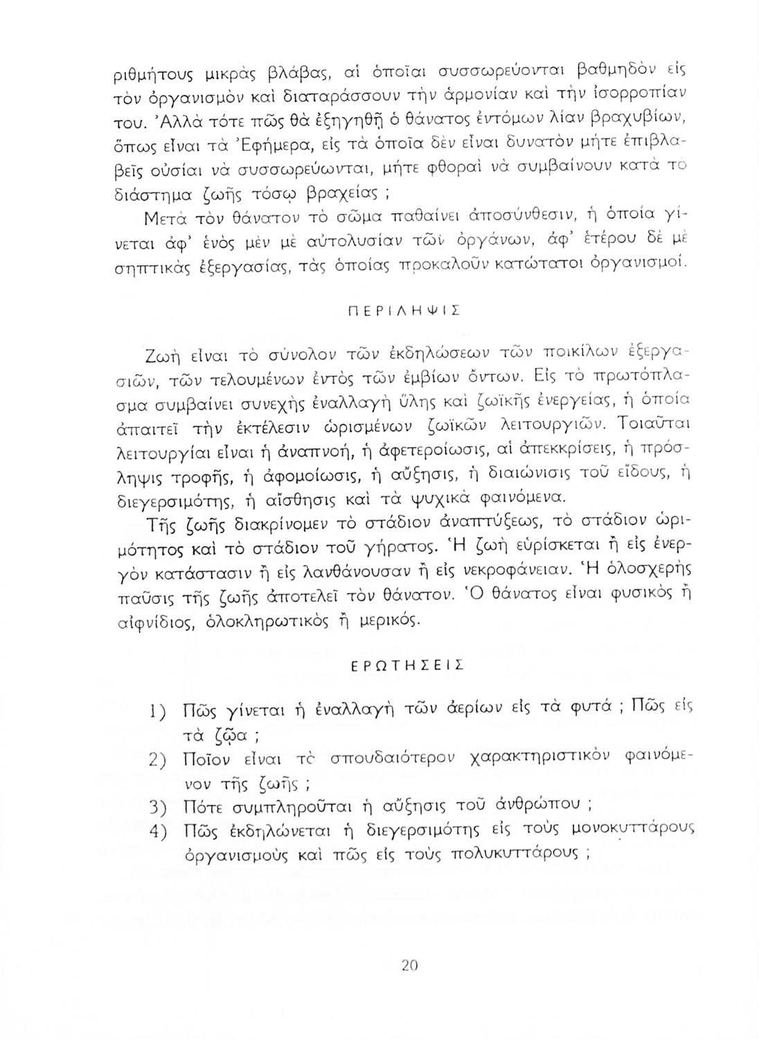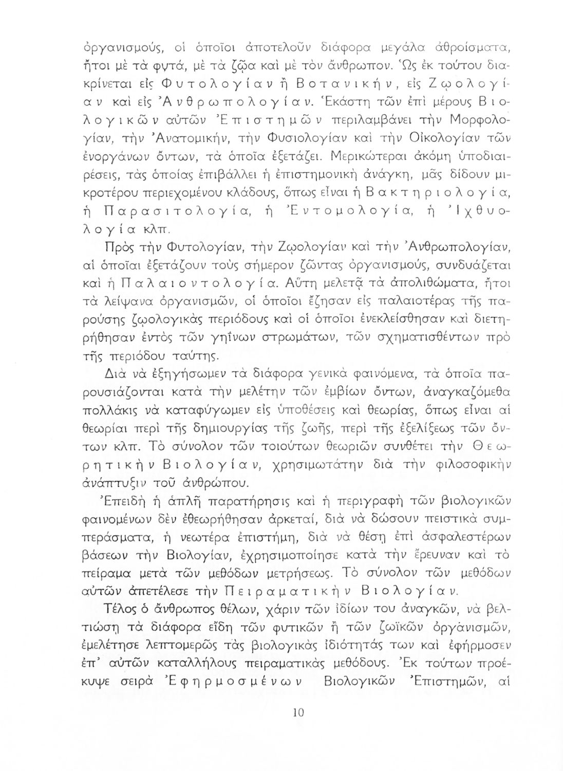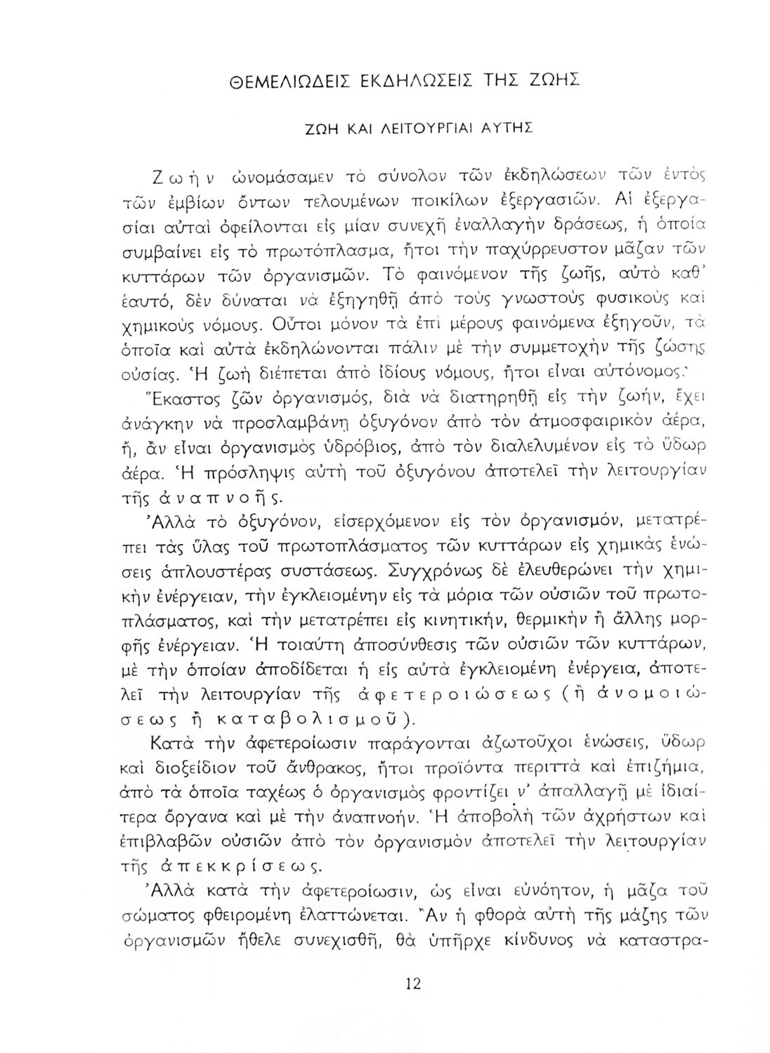 Σχολικό εγχειρίδιο Βιολογίας Δ΄ Γυμνασίου που εστιάζει στις συνθήκες γέννησης, μεταβολής και θανάτου των έμβιων οργανισμών. Ο συγγραφέας ήταν καθηγητής της γενικής Βιολογίας στο Πανεπιστήμιο Αθηνών.