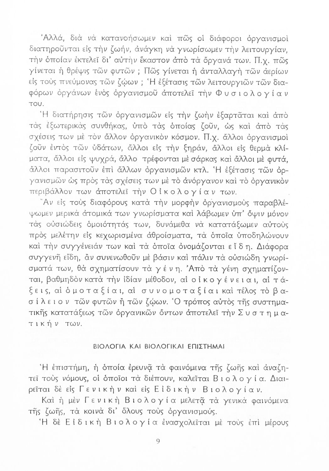 Σχολικό εγχειρίδιο Βιολογίας για τους μαθητές της Γ΄ Γυμνασίου. Περιέχει μια γενική επισκόπηση της Βιολογίας αρχίζοντας με τα βασικά δομικά στοιχεία κάθε οργανισμού, τα ανόργανα και οργανικά σώματα και τα γνωρίσματά τους, τις συνθήκες στις οποίες αναπτύσσονται και εξελίσσονται οι μορφές ζωής, όπως θερμότητα, πίεση, υγρασία. Τέλος το βιβλίο ασχολείται με ζητήματα κληρονομικότητας και την έννοια της εξέλιξης.