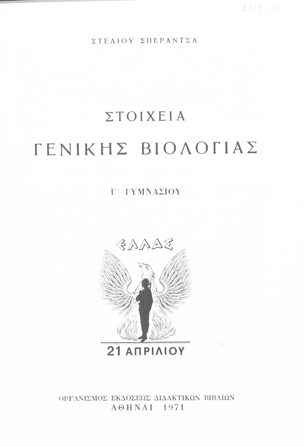Σχολικό εγχειρίδιο Βιολογίας Γ΄ Γυμνασίου που εστιάζει στις συνθήκες γέννησης, μεταβολής και θανάτου των έμβιων οργανισμών. Φέρει το σύμβολο της δικτατορίας.