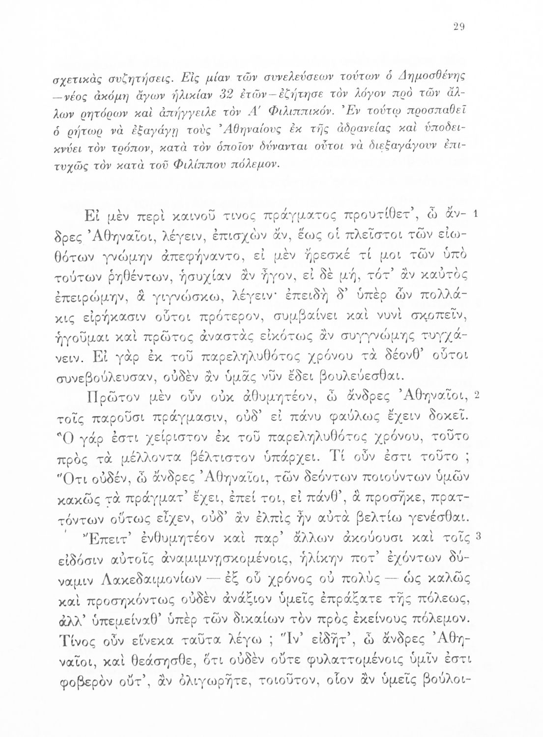 Σχολικό εγχειρίδιο Αρχαίων Ελληνικών Δ΄ Γυμνασίου που περιλαμβάνει τους Ολυνθιακούς Α΄ και Β΄ και τους Φιλιππικούς Α΄ και Β' του Δημοσθένη, εισαγωγή και ερμηνευτικά σχόλια. Φέρει το σύμβολο της δικτατορίας.