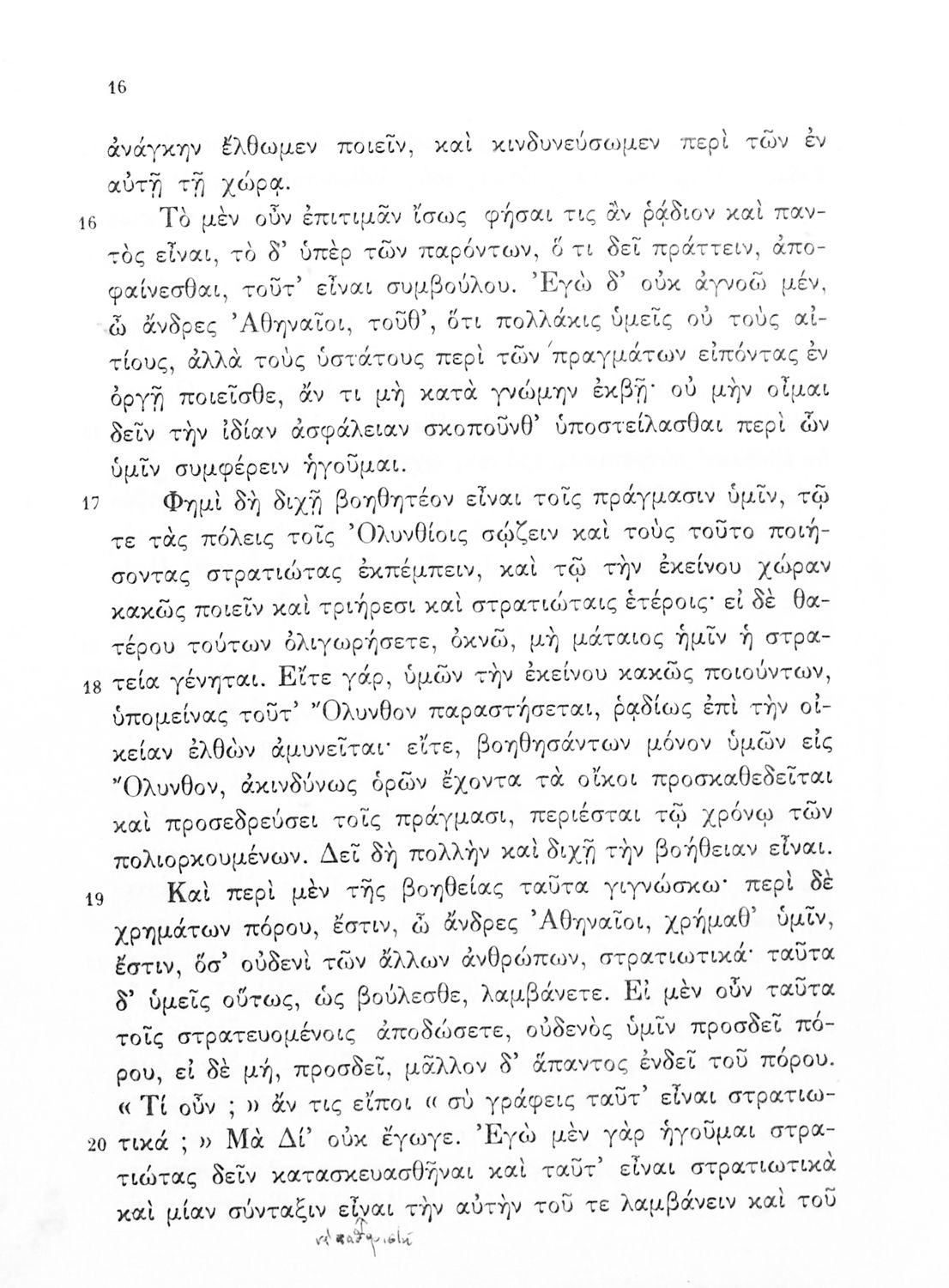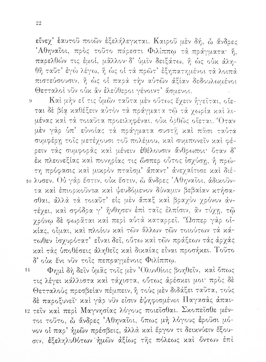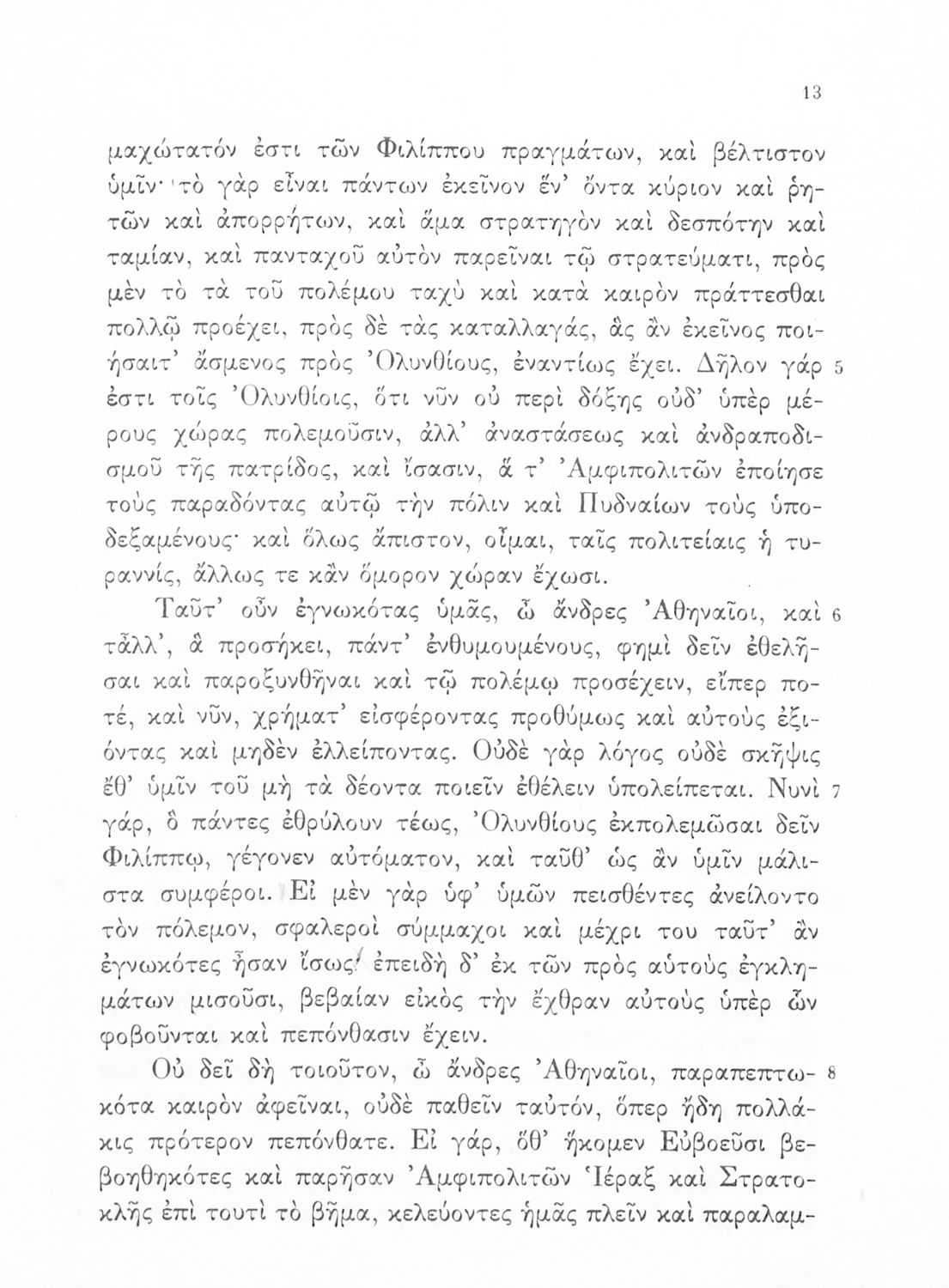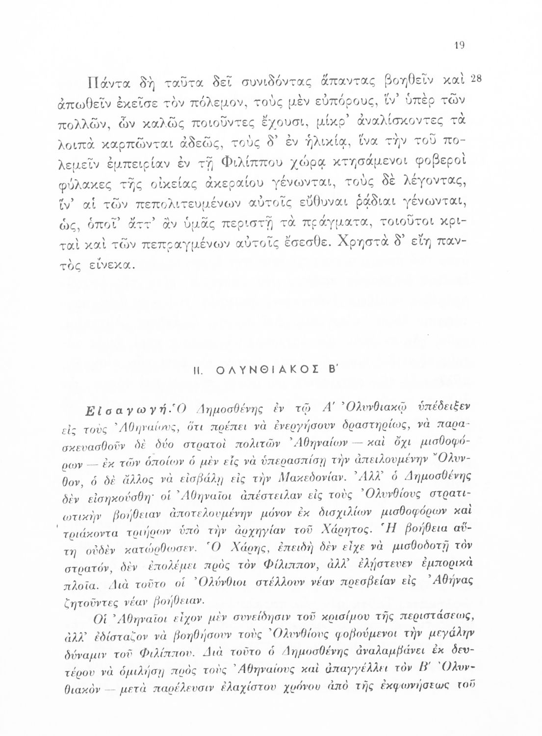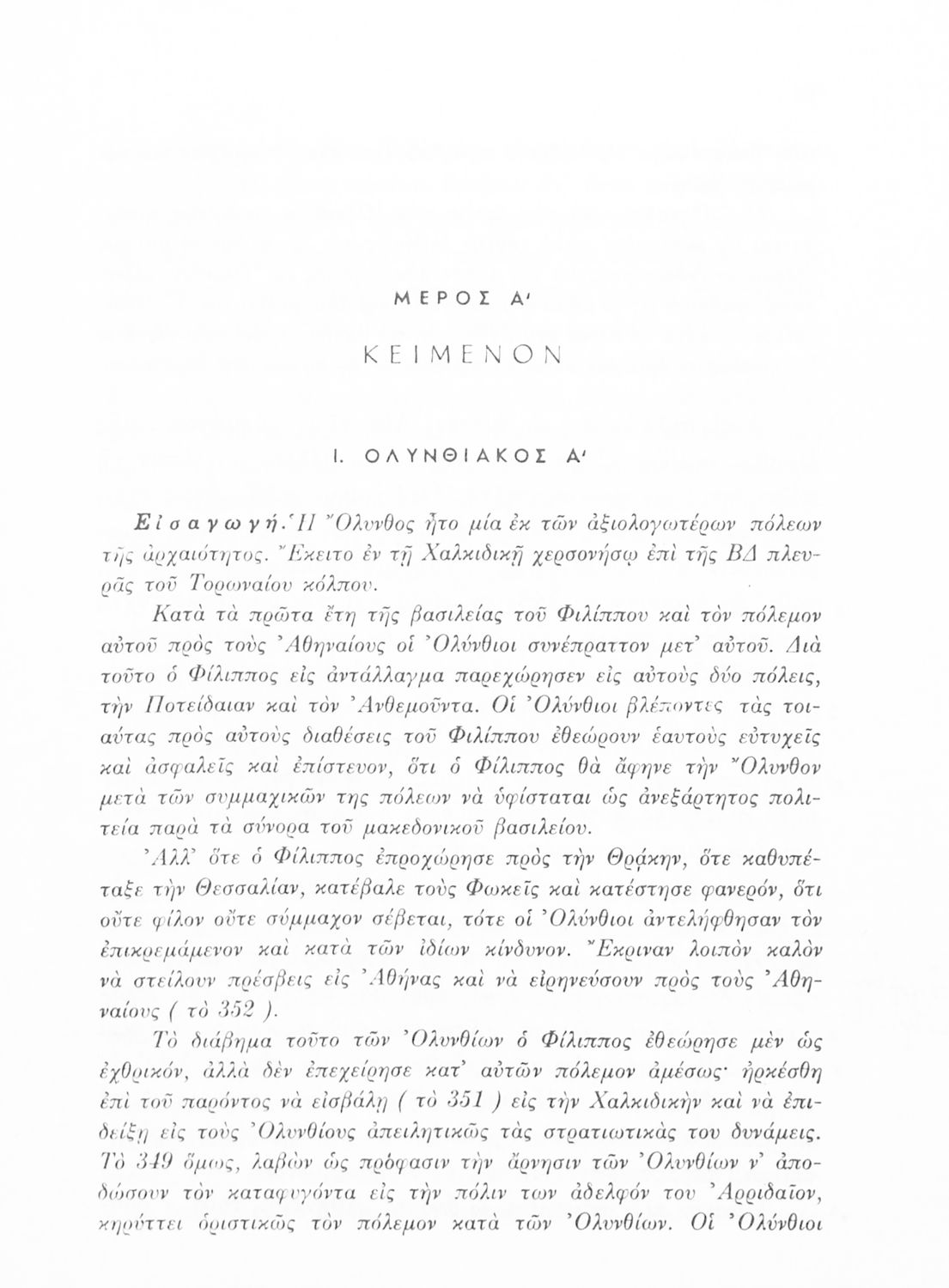 Σχολικό εγχειρίδιο Αρχαίων Ελληνικών Γυμνασίου που περιλαμβάνει τους Ολυνθιακούς Α΄ και Β΄ και τους Φιλιππικούς Α΄ και Β' του Δημοσθένη, εισαγωγή και ερμηνευτικά σχόλια.