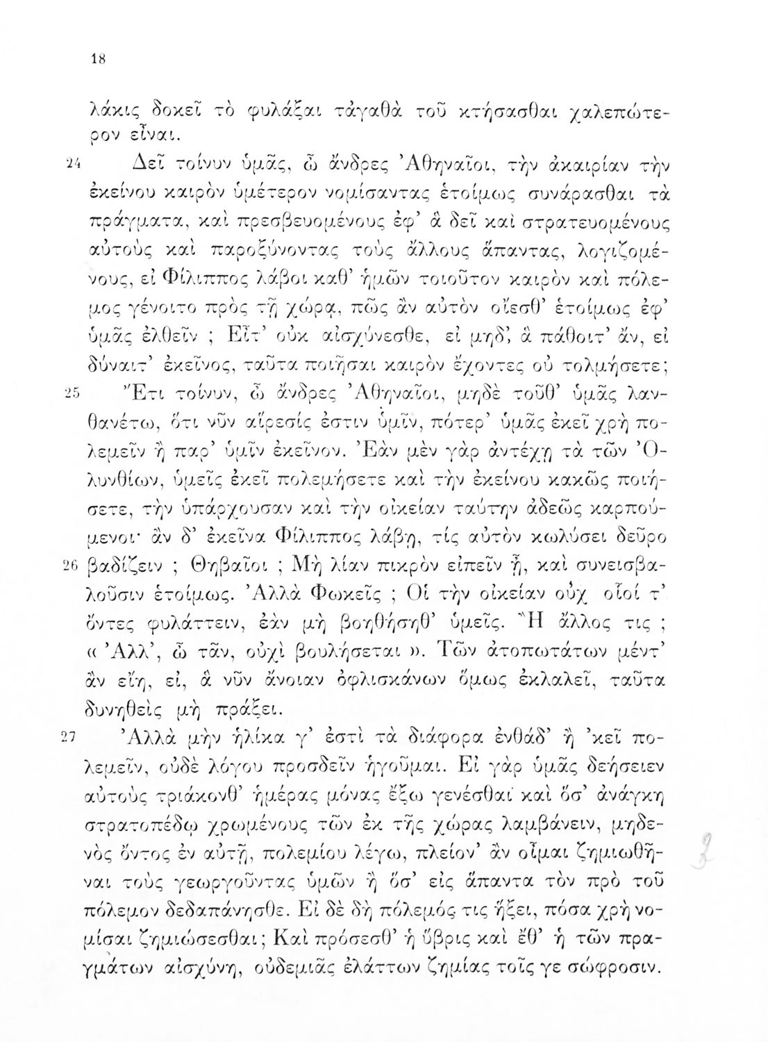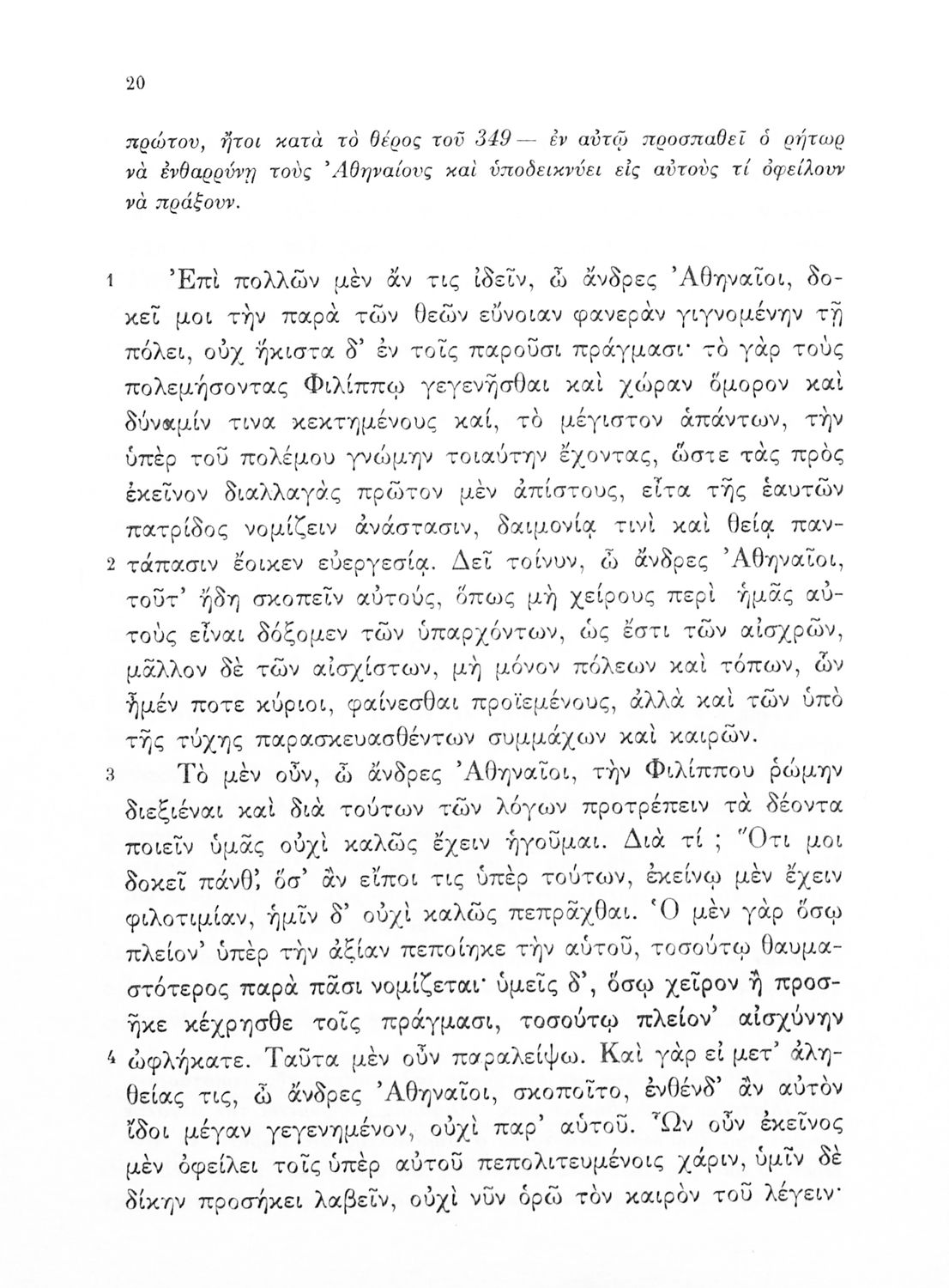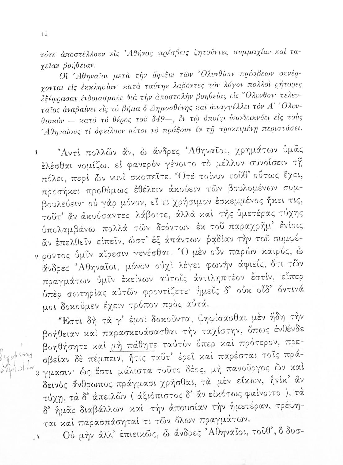 Σχολικό εγχειρίδιο Αρχαίων Ελληνικών Δ΄ Γυμνασίου που περιλαμβάνει εισαγωγή στη ζωή και στο έργο του Δημοσθένη, τον Α΄ κατά Φιλίππου, και τους Α΄ και Β΄ Ολυνθιακούς και ερμηνευτικά και ετυμολογικά σχόλια.