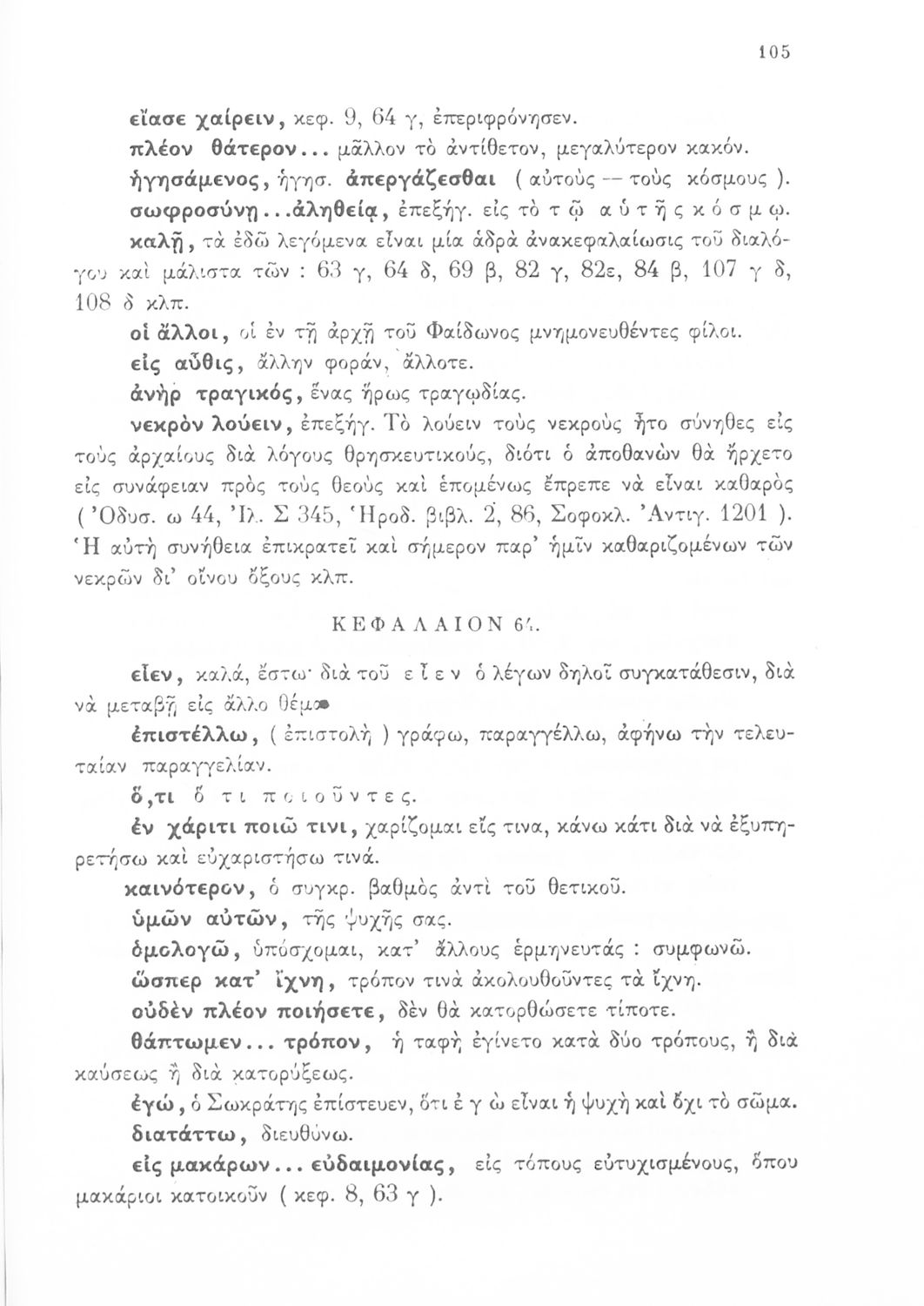 Σχολικό εγχειρίδιο Αρχαίων Ελληνικών ΣΤ΄ Γυμνασίου που περιέχει αποσπάσματα από το έργο του Πλάτωνα Φαίδων, λεξιλογικές παρατηρήσεις, και ερμηνευτικά, πραγματολογικά σχόλια και γραμματικές παρατηρήσεις.