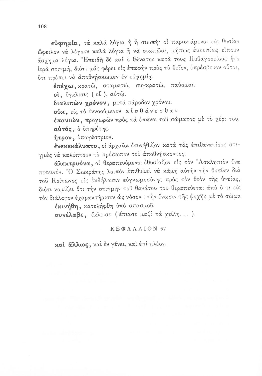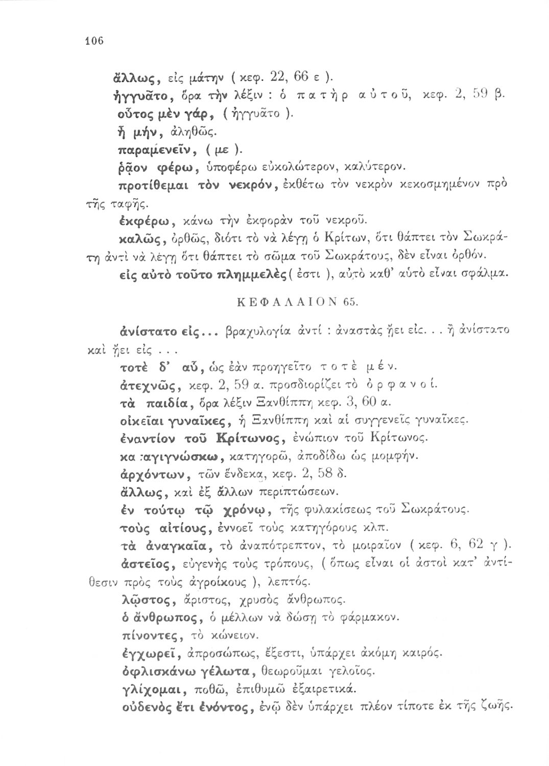 Σχολικό εγχειρίδιο Αρχαίων Ελληνικών ΣΤ΄ Εξαταξίου Γυμνασίου που περιλαμβάνει εισαγωγικό κείμενο για τη διδασκαλία του Σωκράτη και περίληψη του έργου, τα κεφάλαια Β΄ έως ΚΕ΄ και περιλήψεις των κεφαλαίων 26 έως
