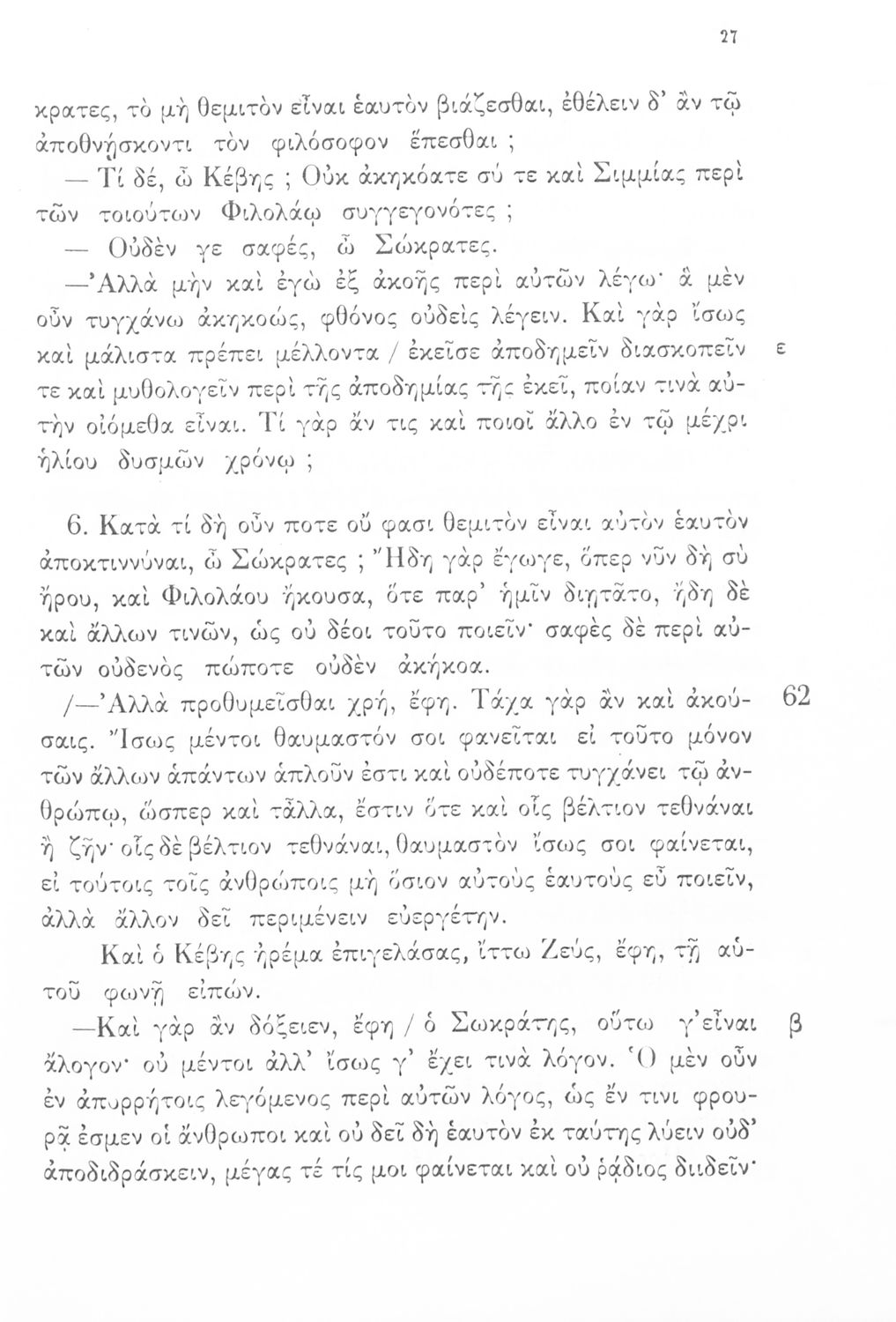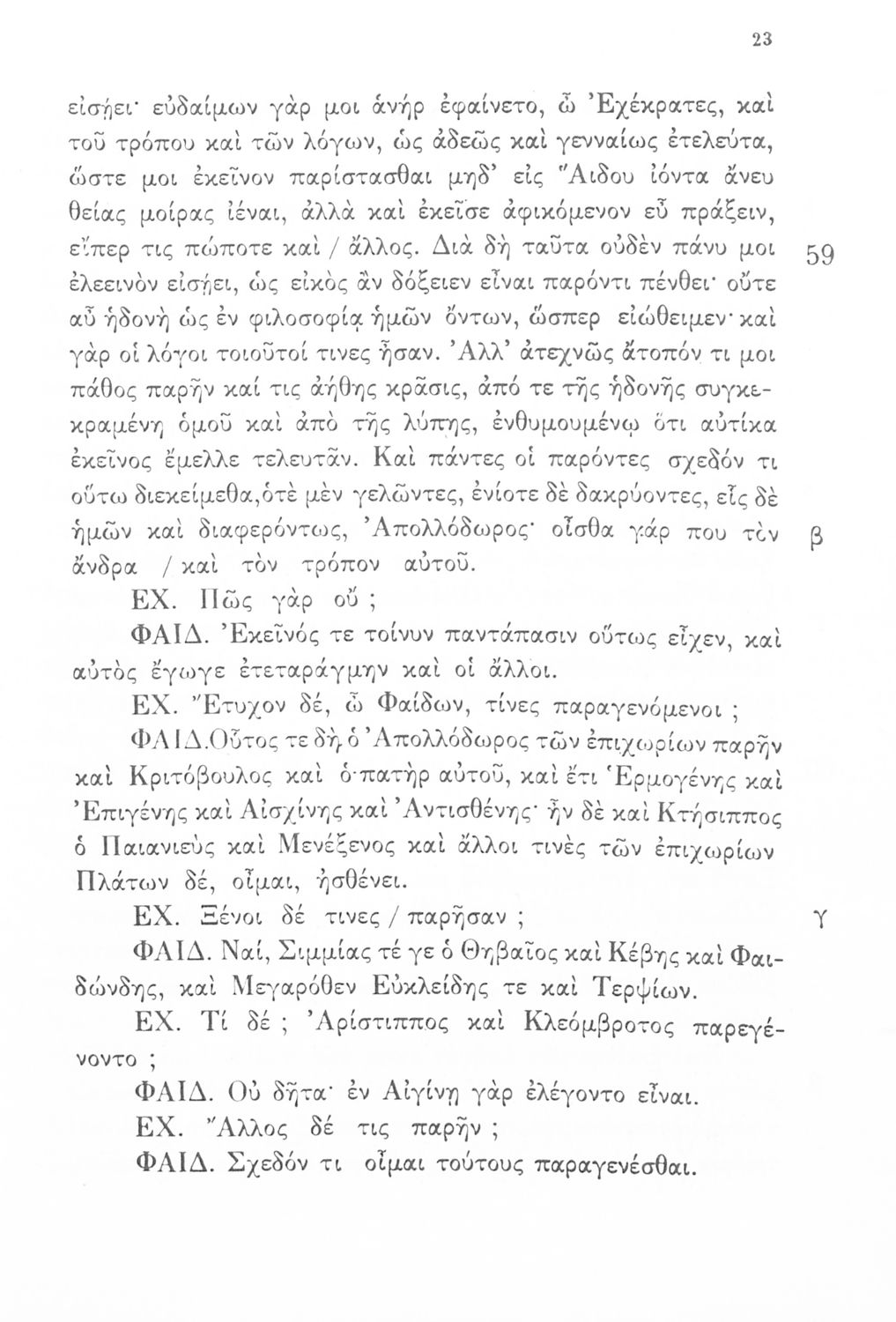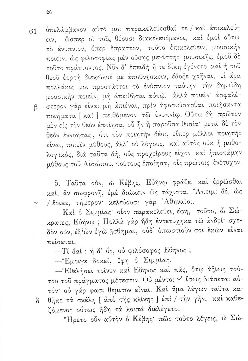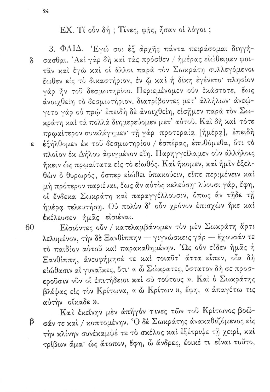 Σχολικό εγχειρίδιο Αρχαίων Ελληνικών της ΣΤ΄ Γυμνασίου το οποίο παρουσιάζει το έργο του Πλάτωνα, 'Φαίδων'. Το κείμενο συνοδεύεται από γλωσσικές και ερμηνευτικές σημειώσεις. Στην αρχή του βιβλίου περιλαμβάνεται εισαγωγή για το έργο και τη ζωή του Πλάτωνα.