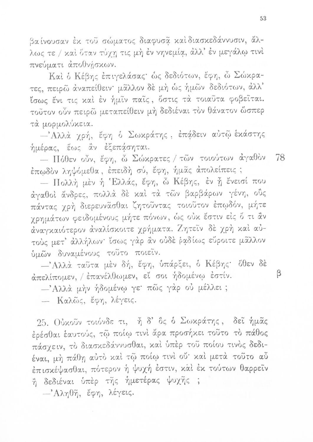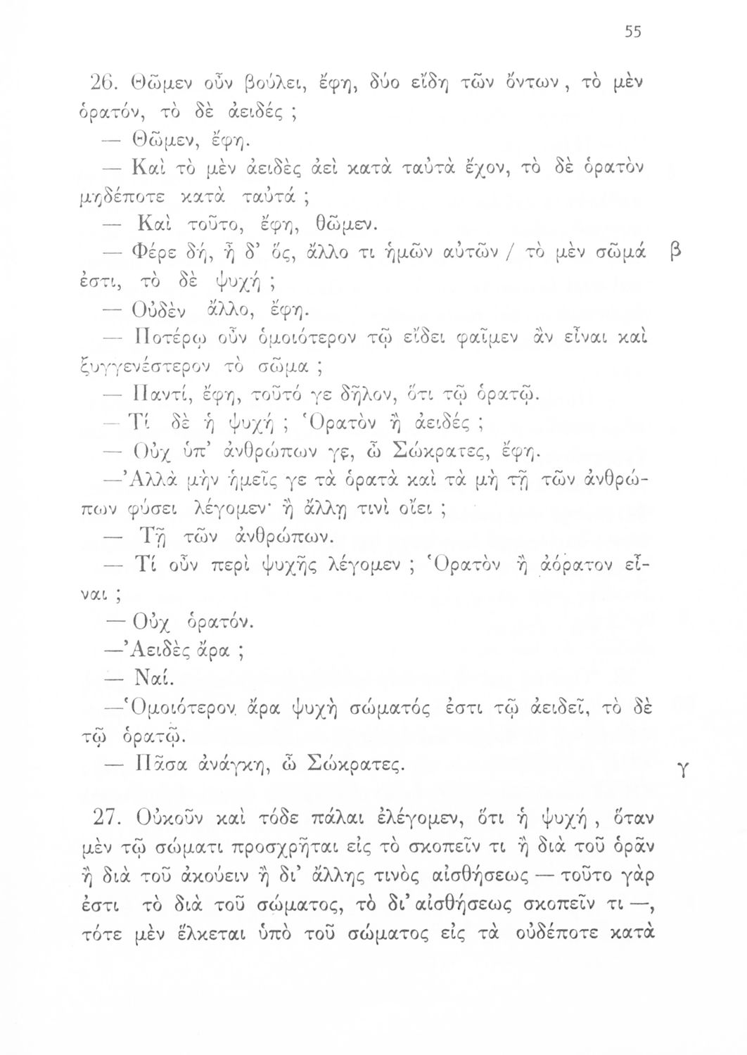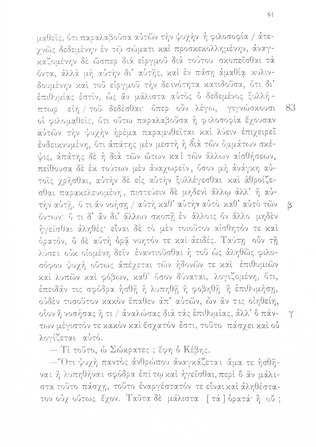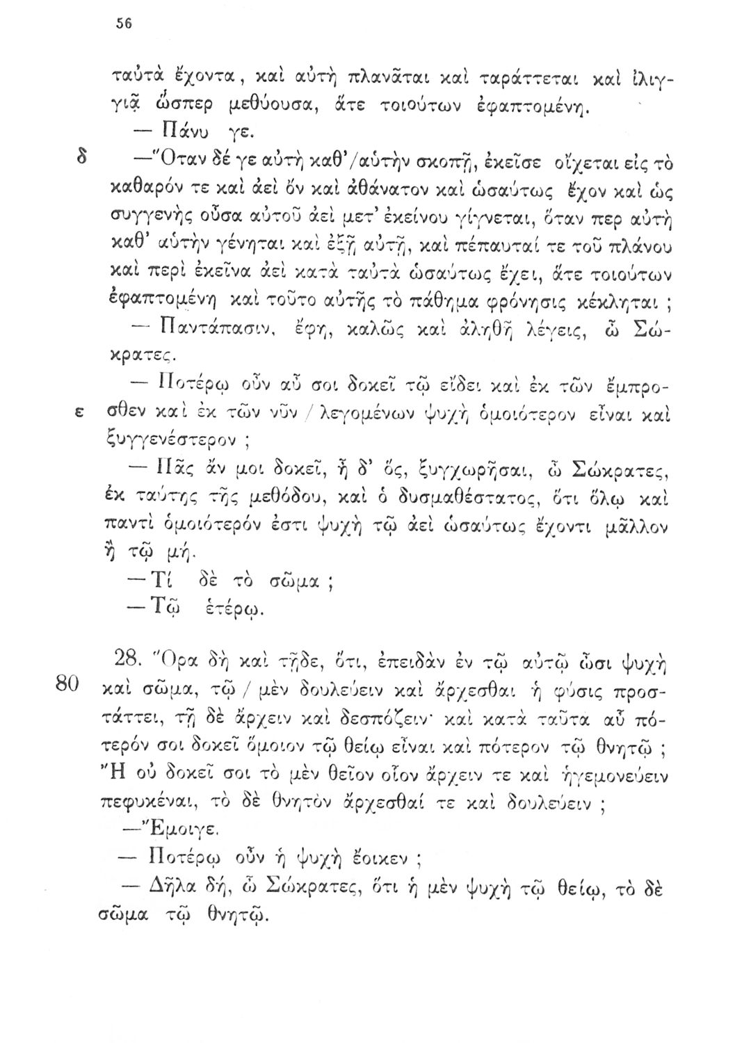 Σχολικό εγχειρίδιο Αρχαίων Ελληνικών της ΣΤ΄ Γυμνασίου το οποίο παρουσιάζει το έργο του Πλάτωνα, 'Φαίδων'. Το κείμενο συνοδεύεται από γλωσσικές και ερμηνευτικές σημειώσεις. Στην αρχή του βιβλίου περιλαμβάνεται εισαγωγή για το έργο και τη ζωή του Πλάτωνα.