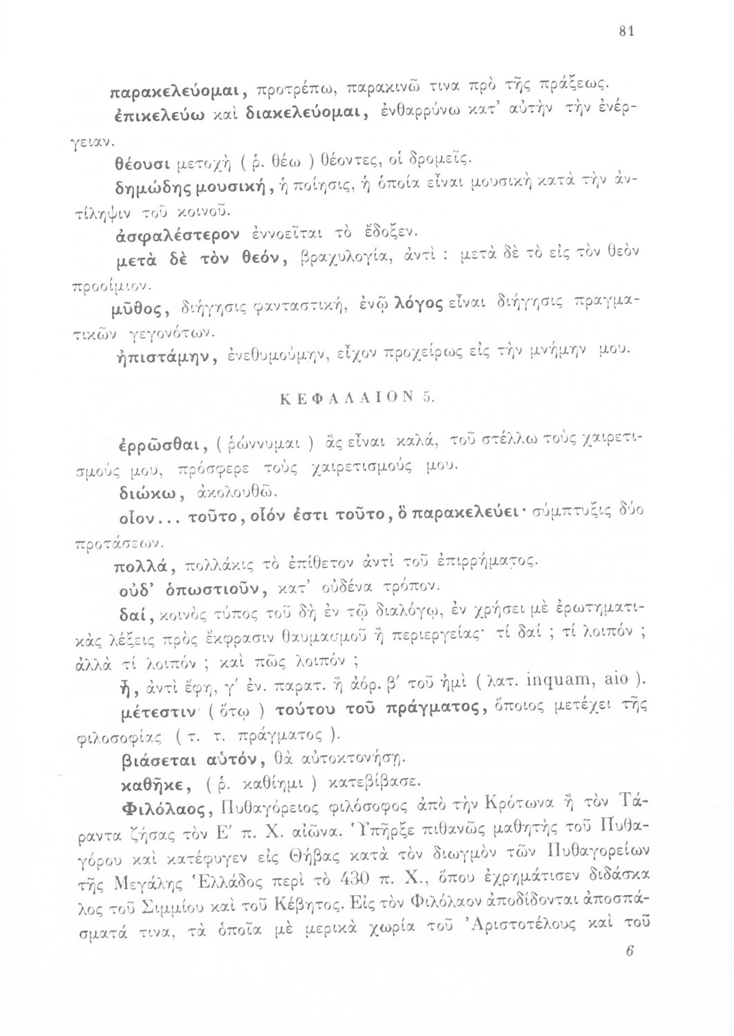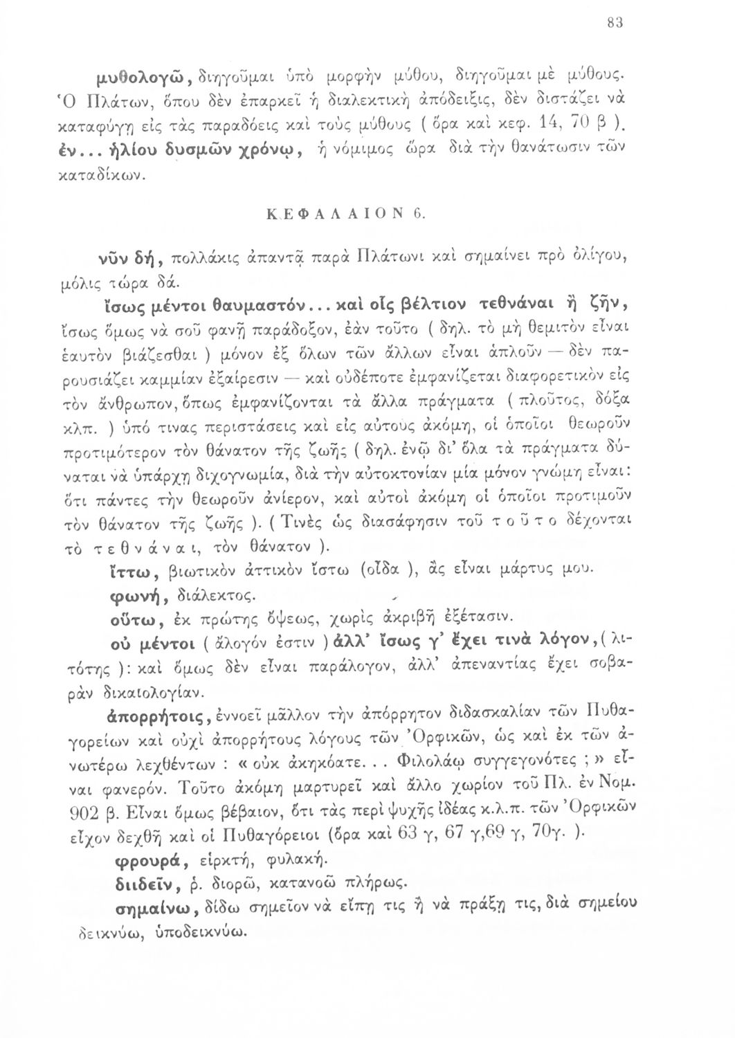 Σχολικό εγχειρίδιο Αρχαίων Ελληνικών ΣΤ΄ Γυμνασίου που περιέχει αποσπάσματα από το έργο του Πλάτωνα Φαίδων, λεξιλογικές παρατηρήσεις, και ερμηνευτικά, πραγματολογικά σχόλια και γραμματικές παρατηρήσεις.
